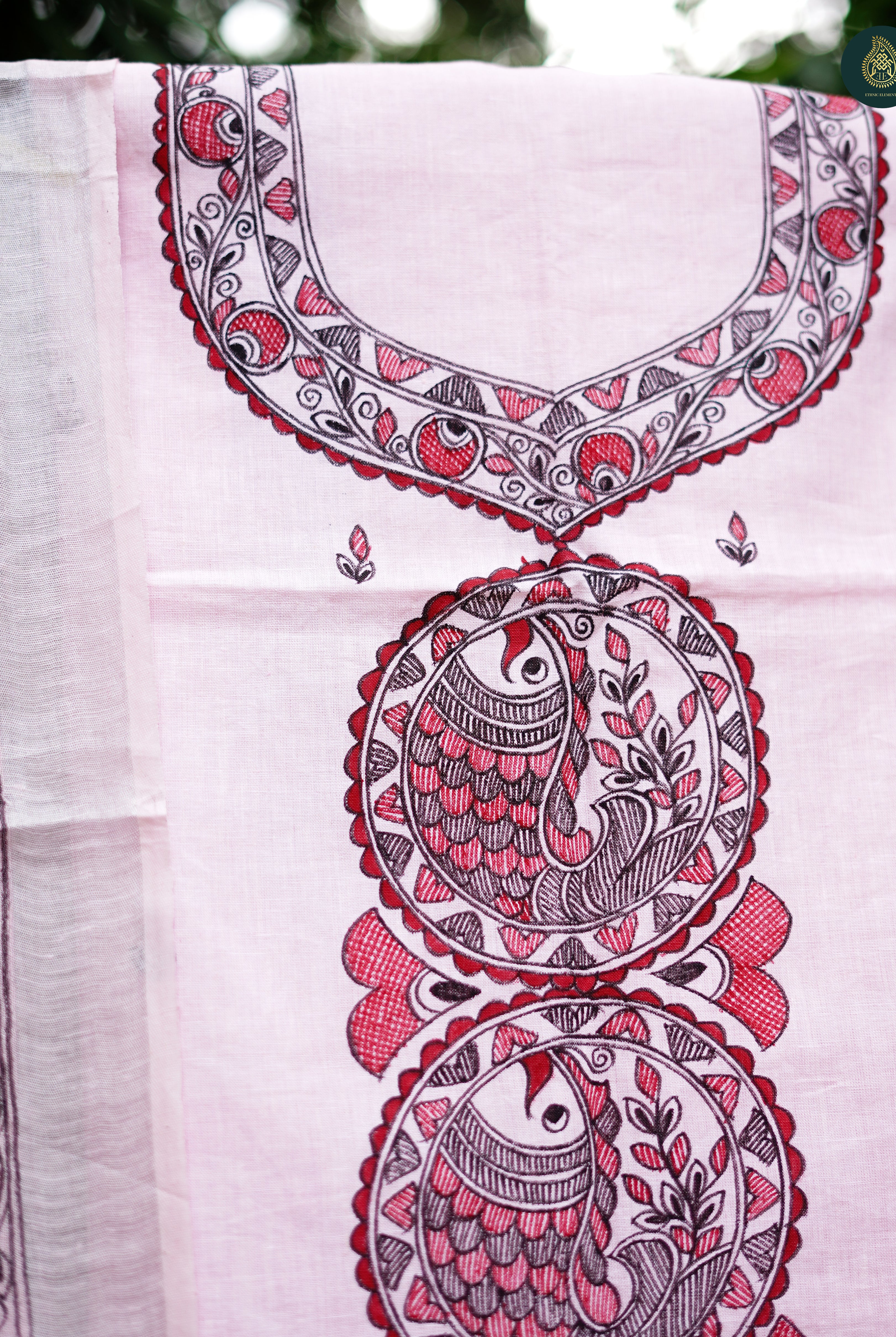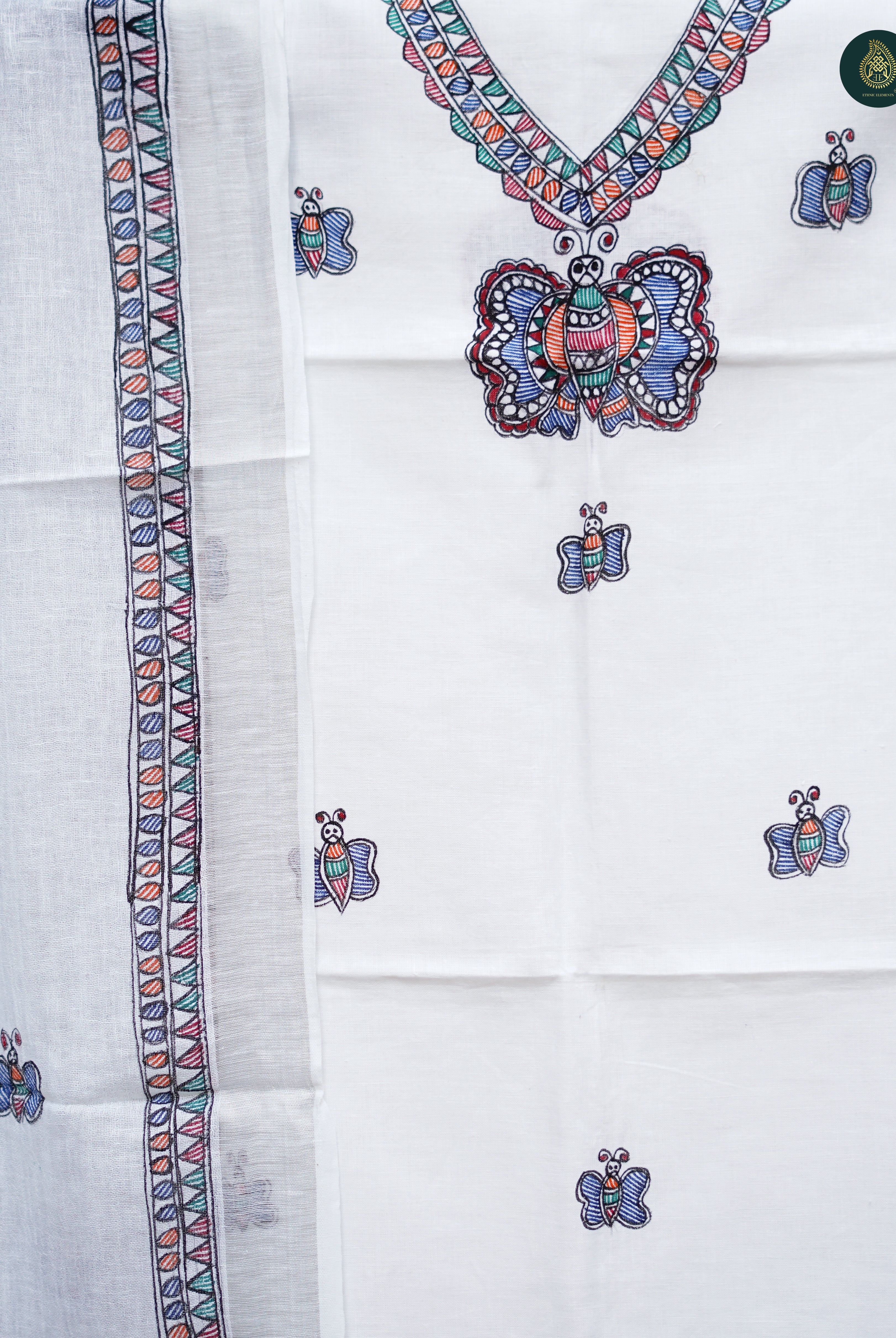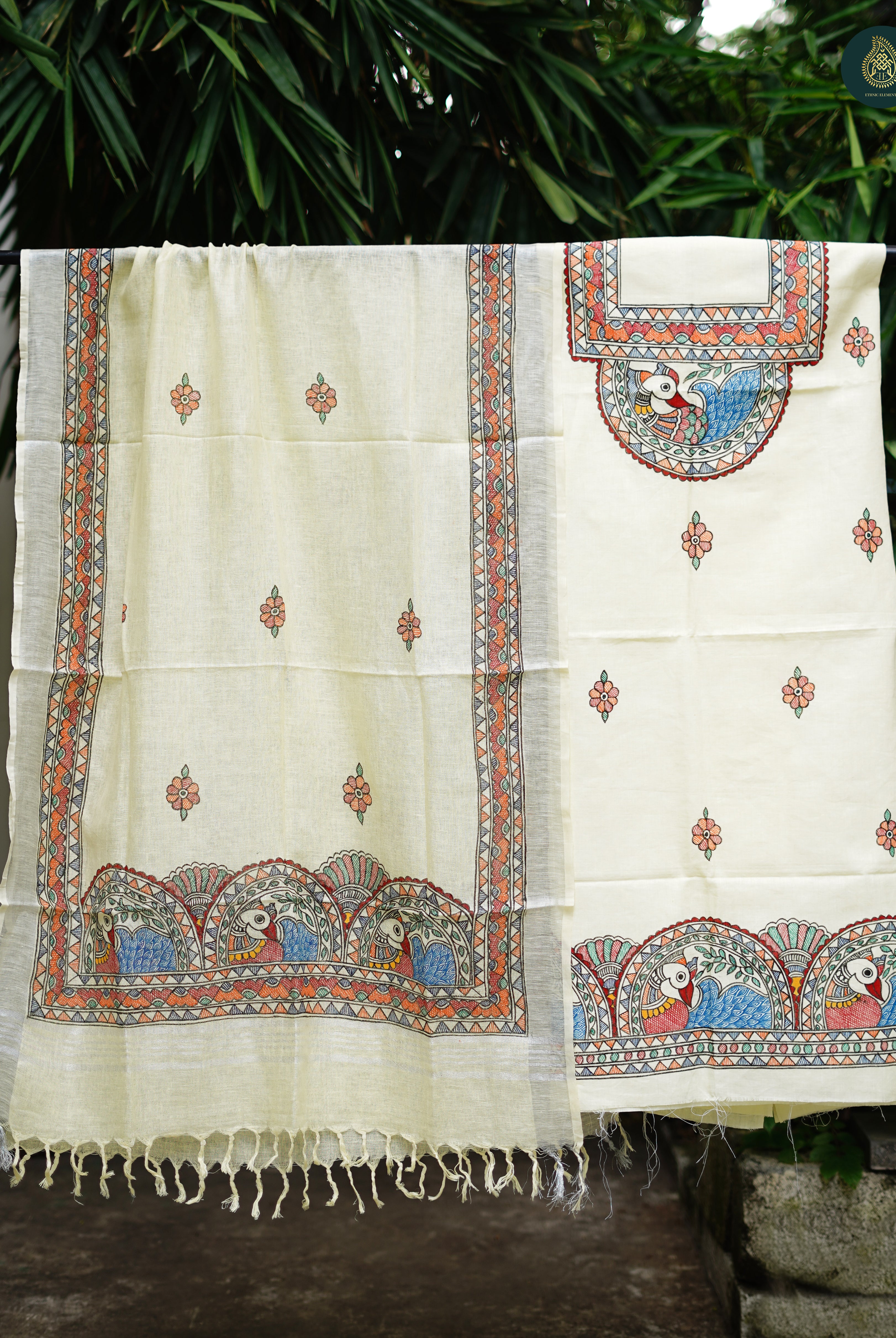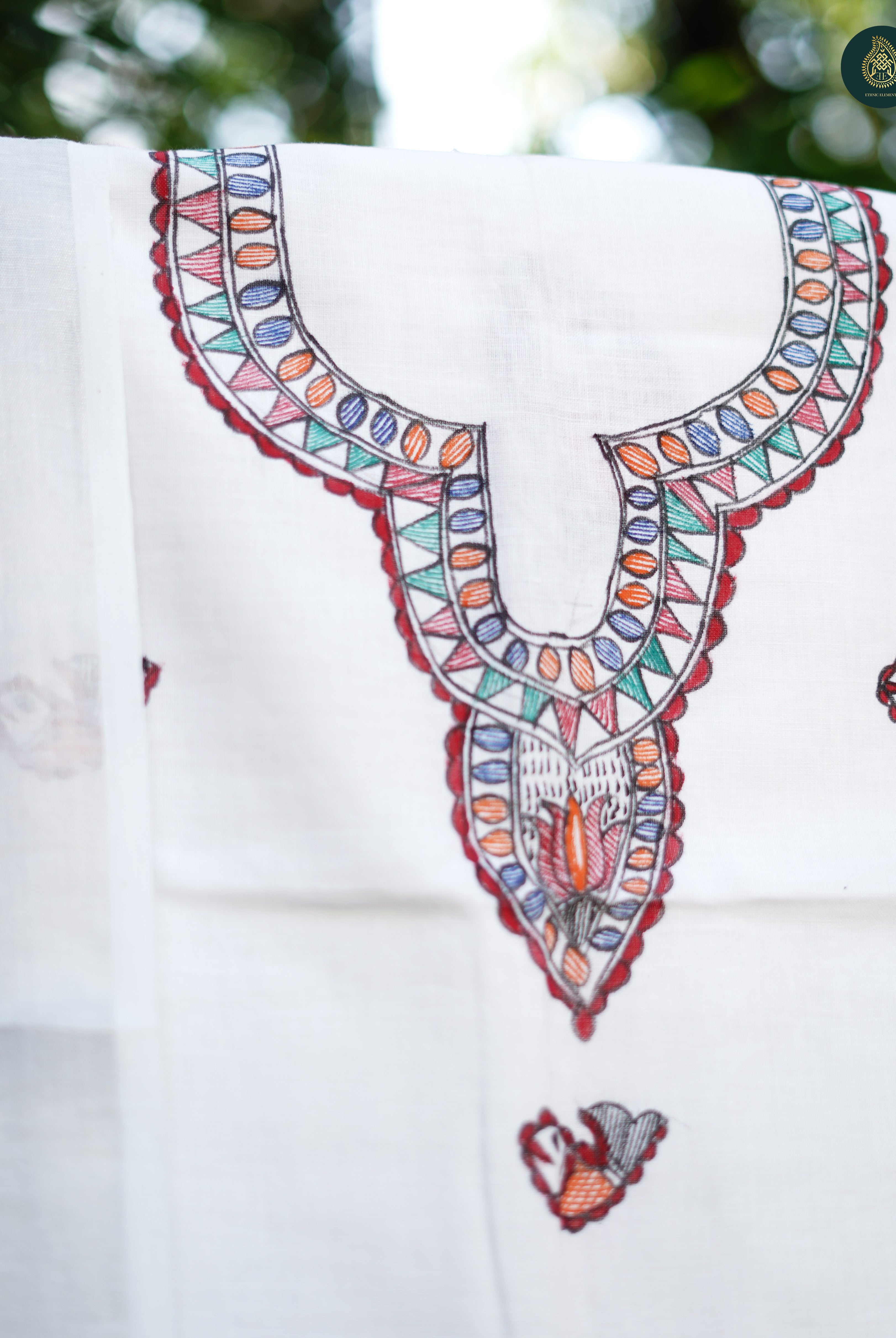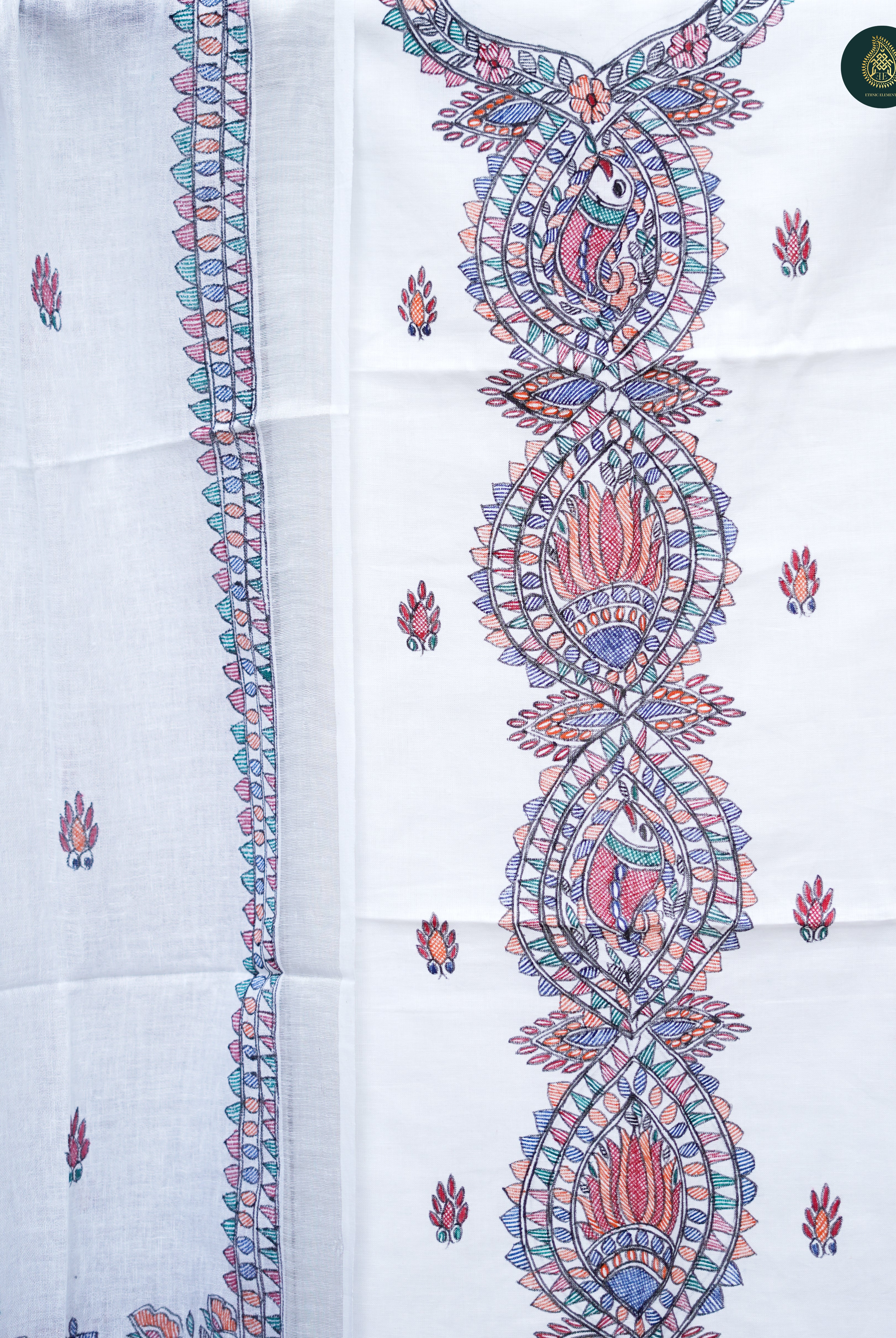 Authentic Original Hand-Painted Madhubani Suit Sets made from pure woven fabrics. Madhubani Art is a type of folk-art form. Each suit consists of line drawings filled with bright colors and contrasts or patterns. Only natural dyes and pigments are used for fabric color and painting.