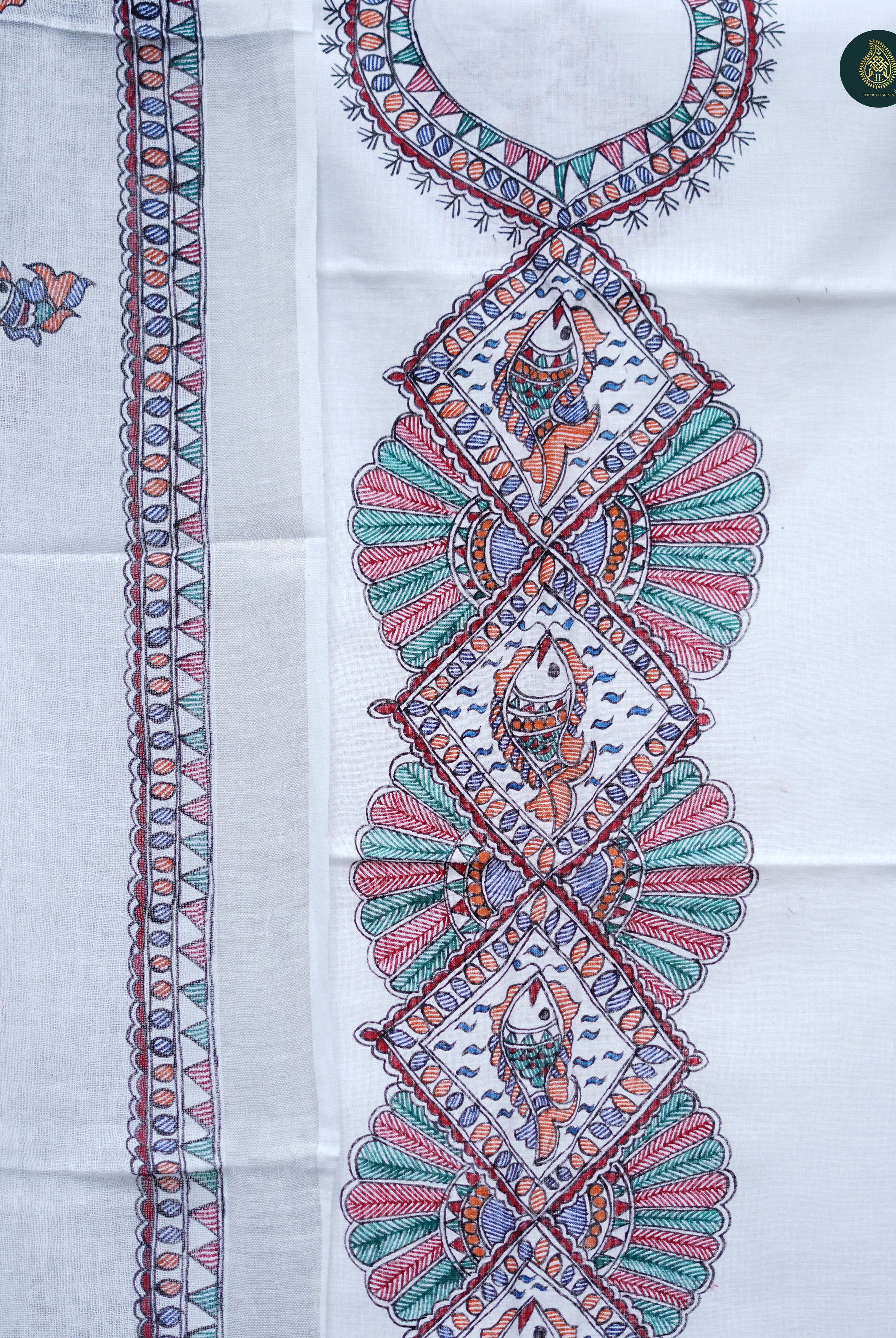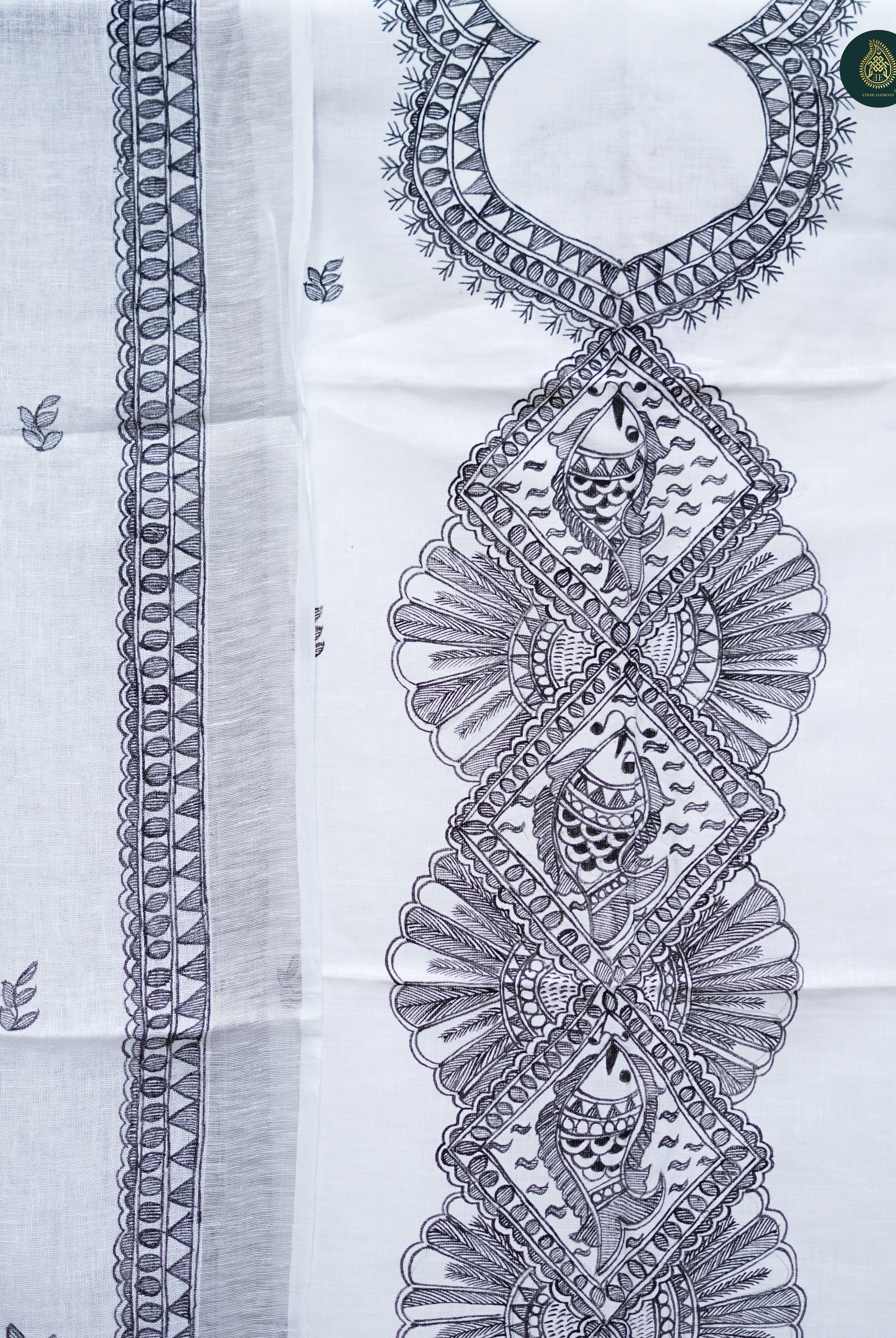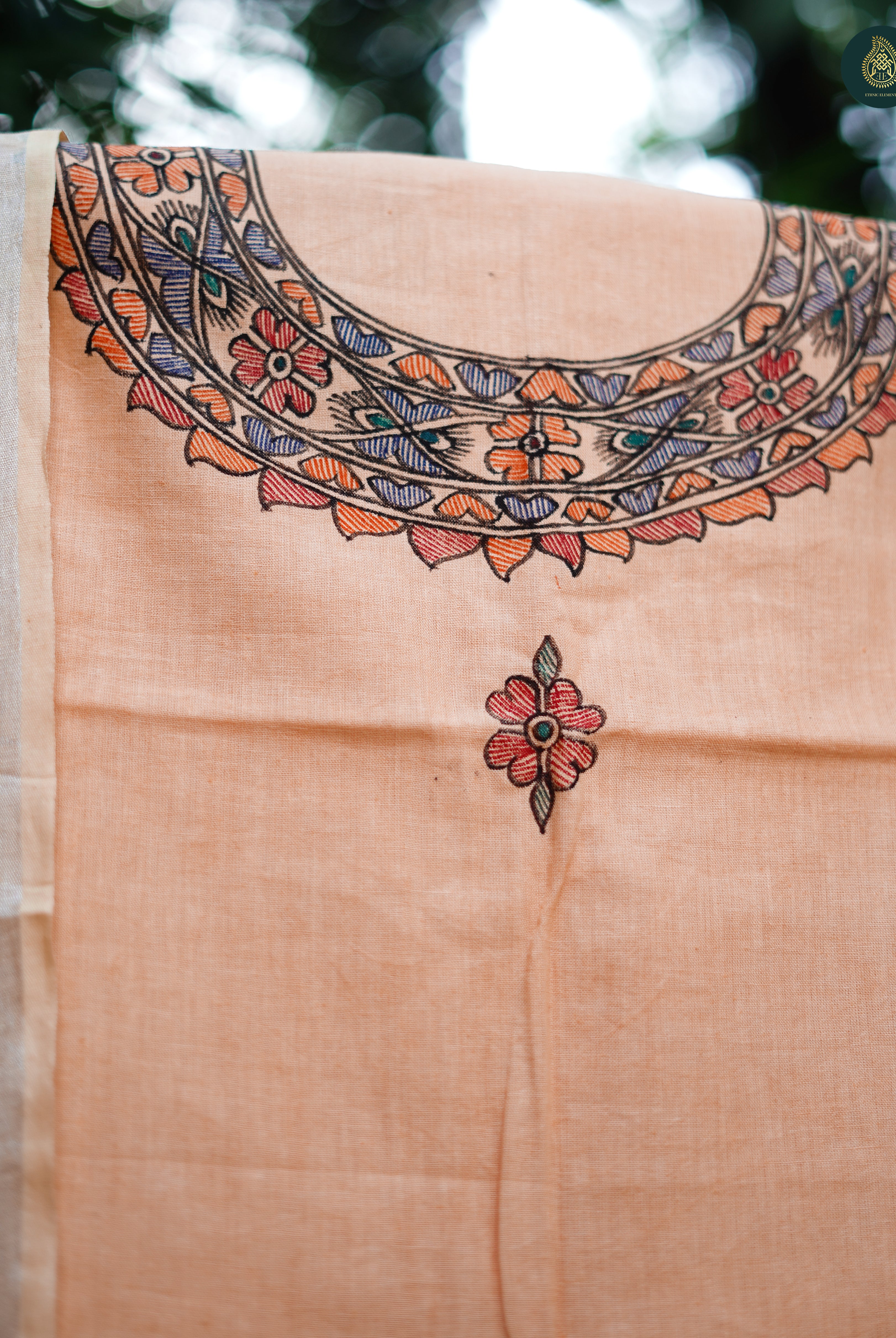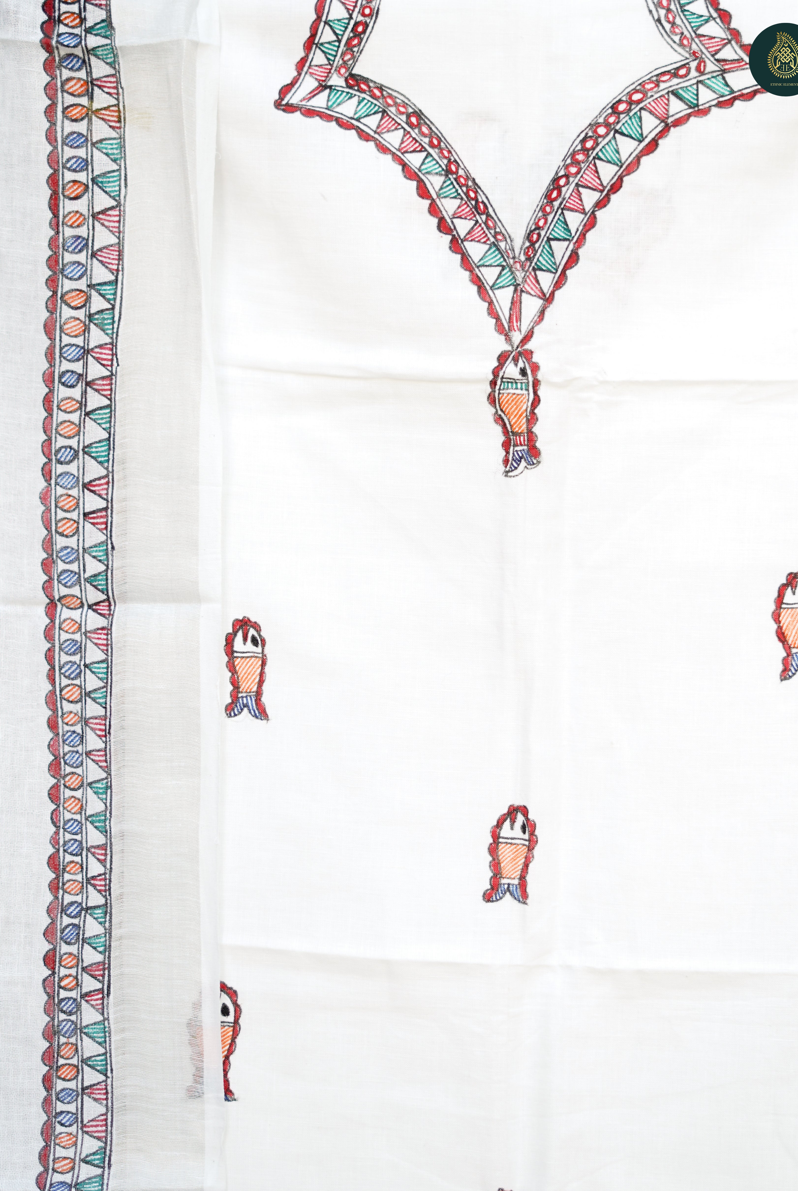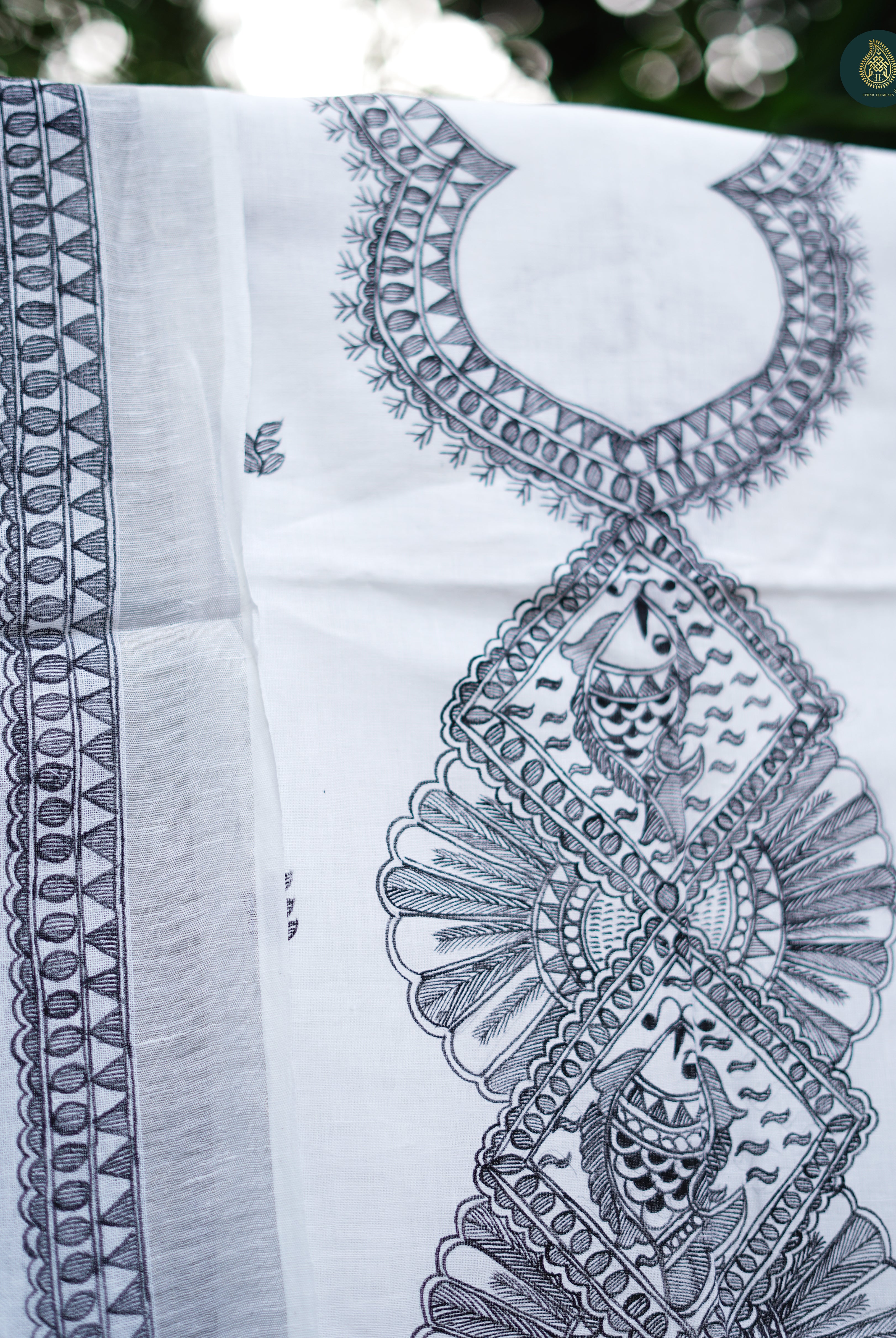 Authentic Original Hand-Painted Madhubani Suit Sets made from pure woven fabrics. Madhubani Art is a type of folk-art form. Each suit consists of line drawings filled with bright colors and contrasts or patterns. Only natural dyes and pigments are used for fabric color and painting.
