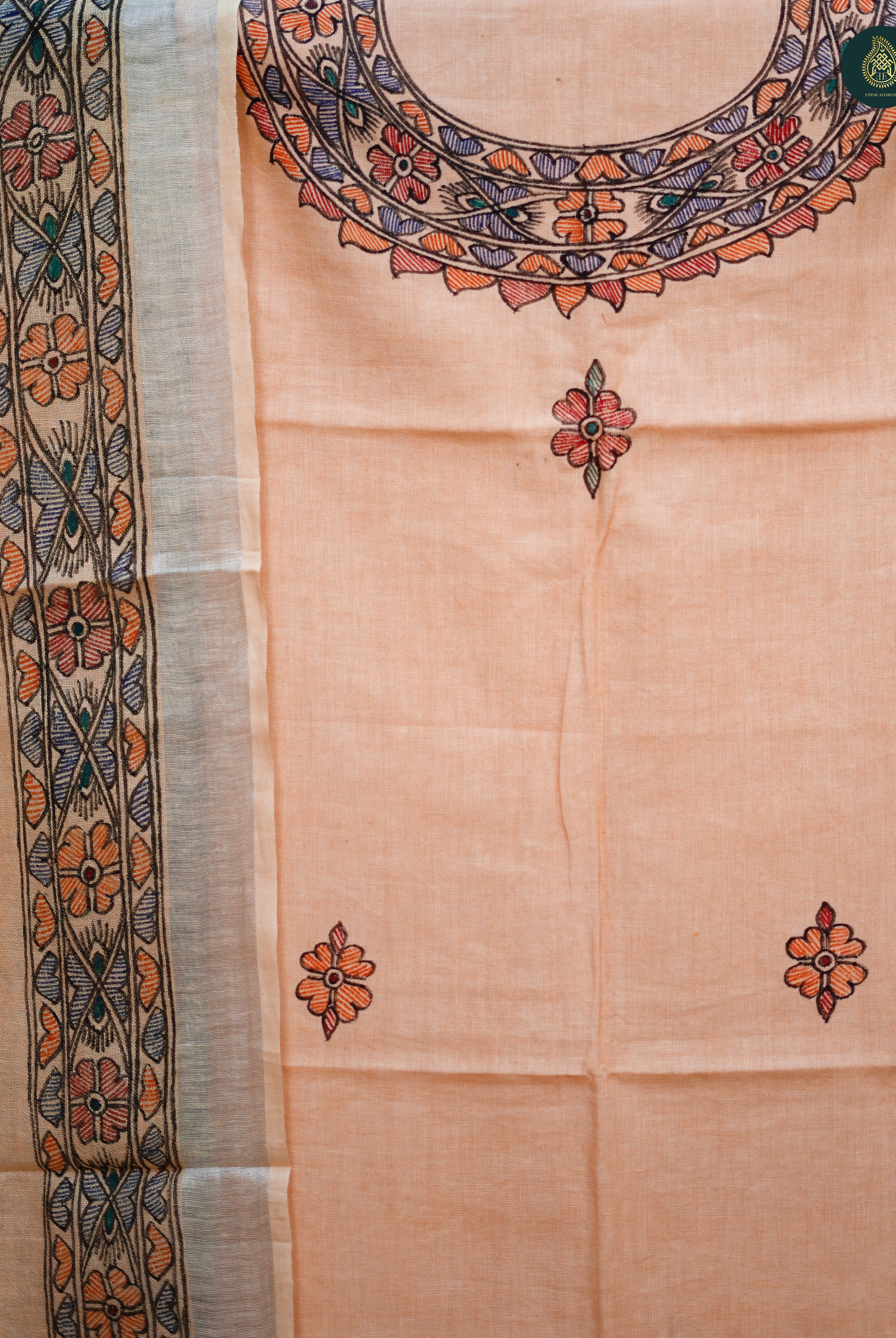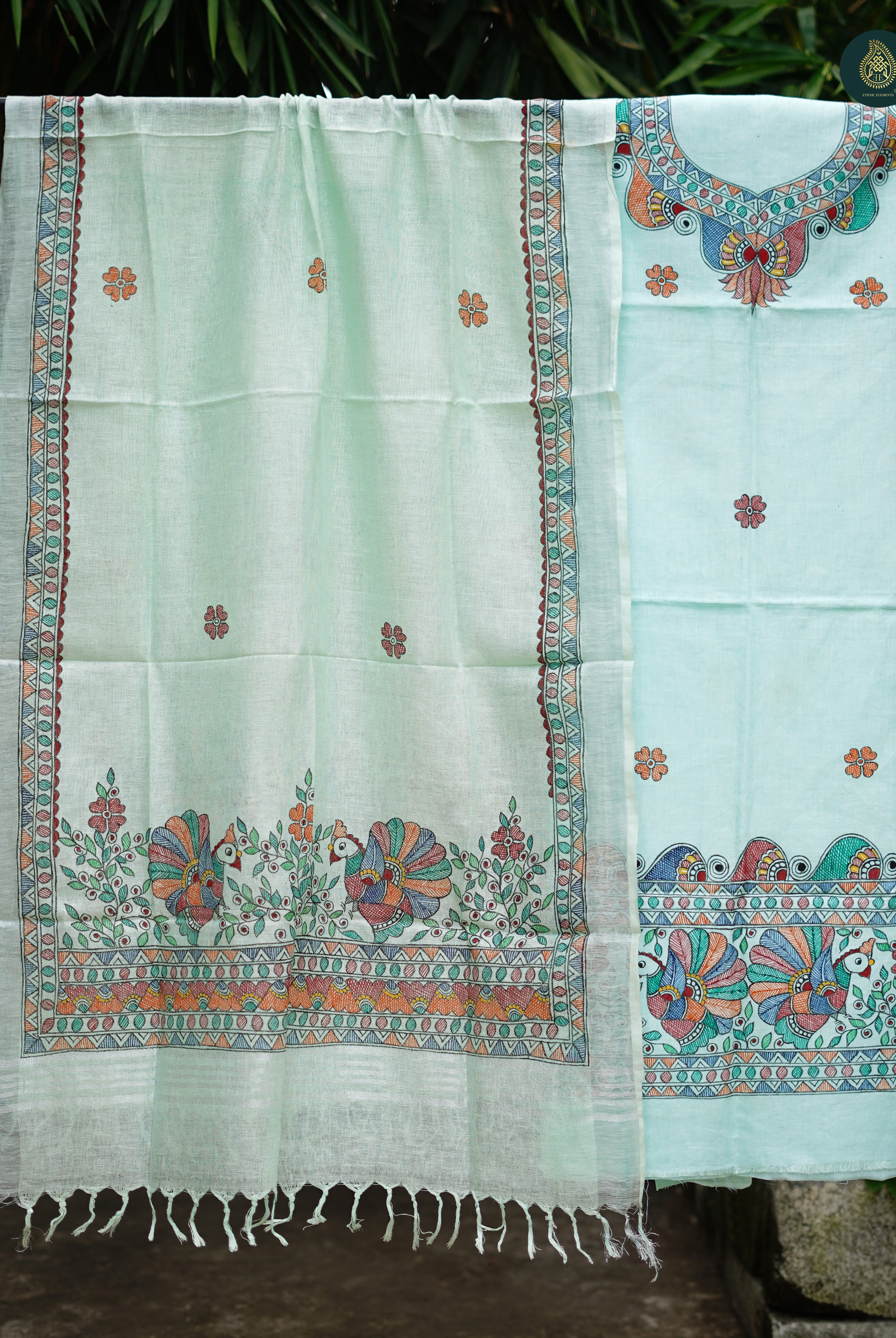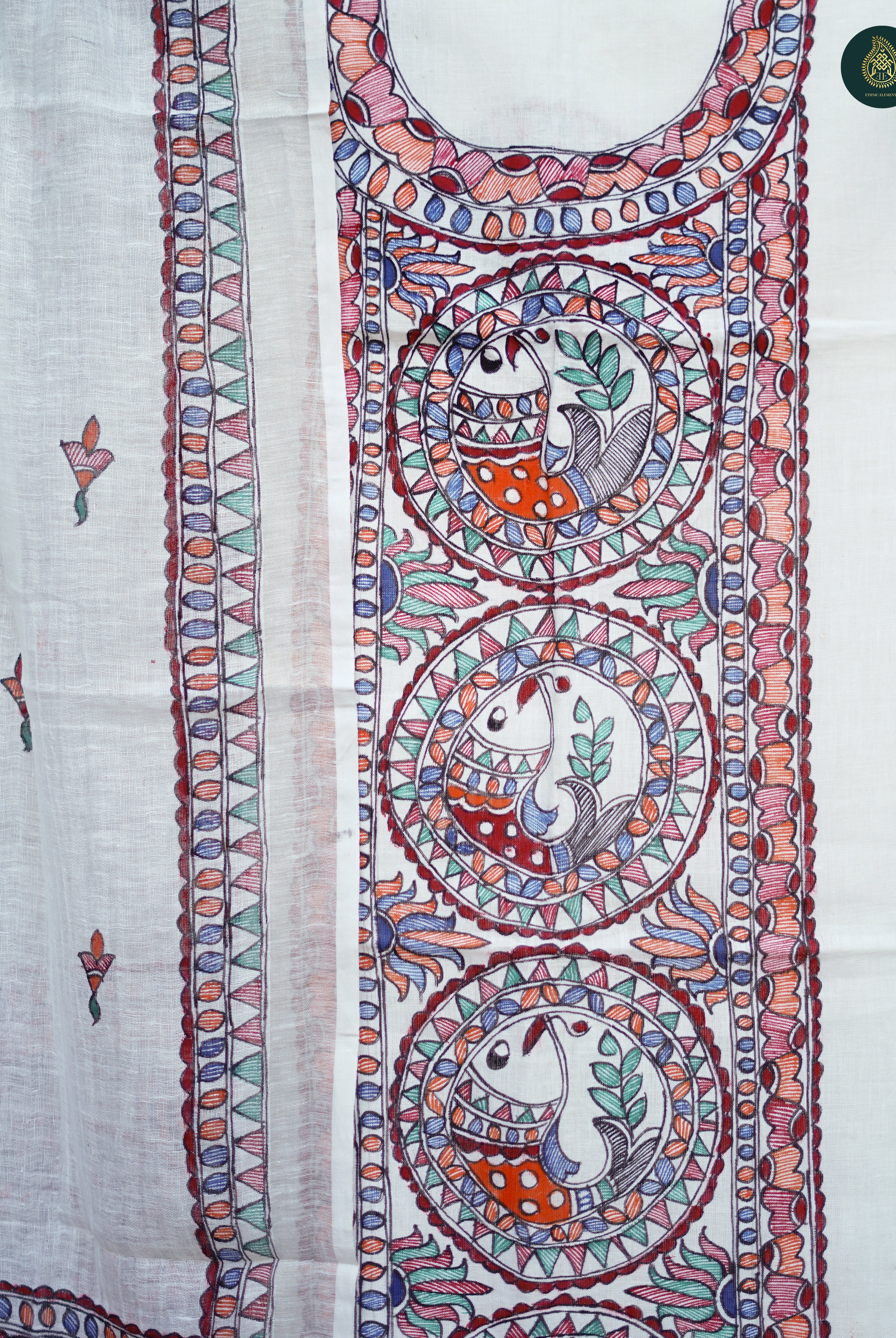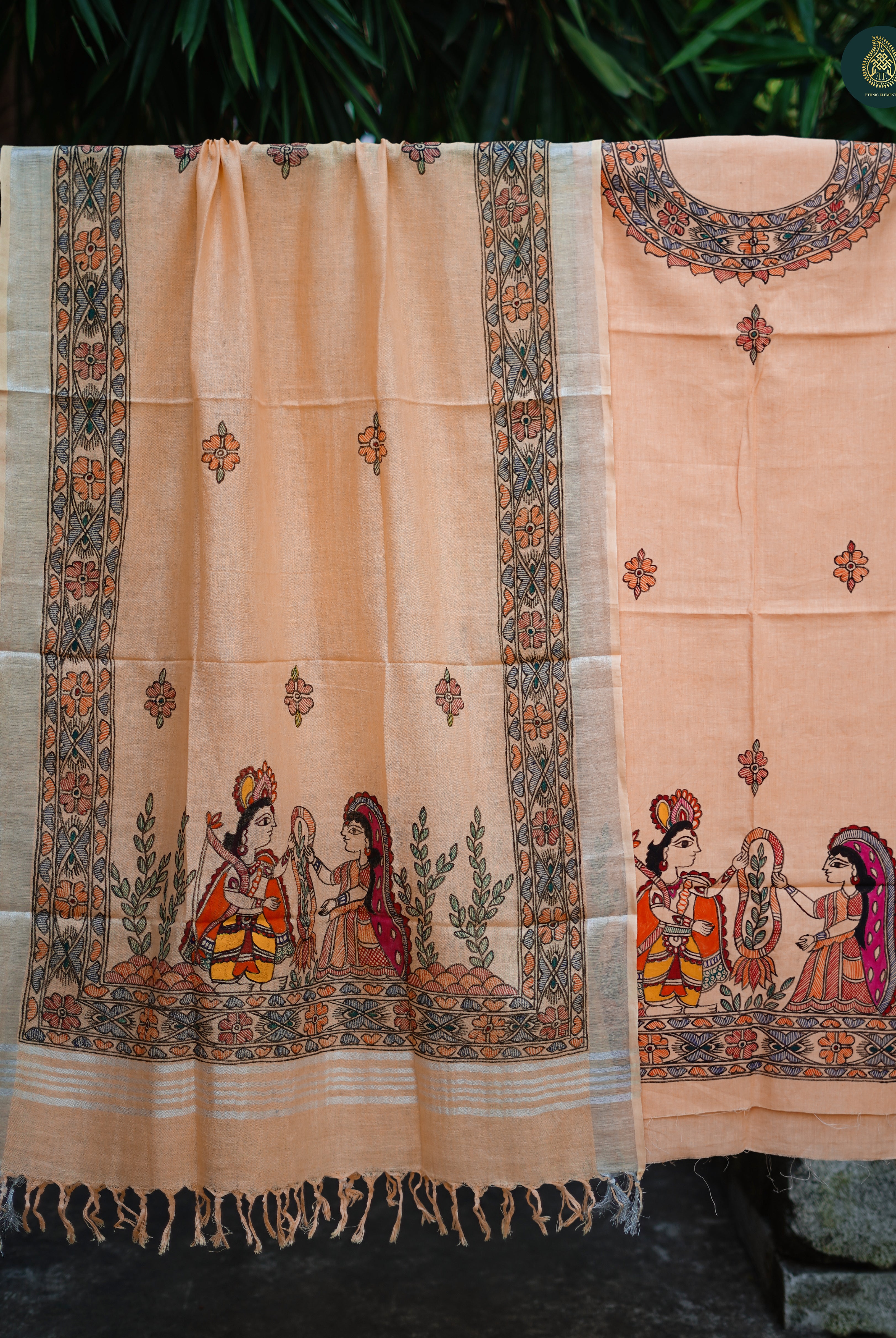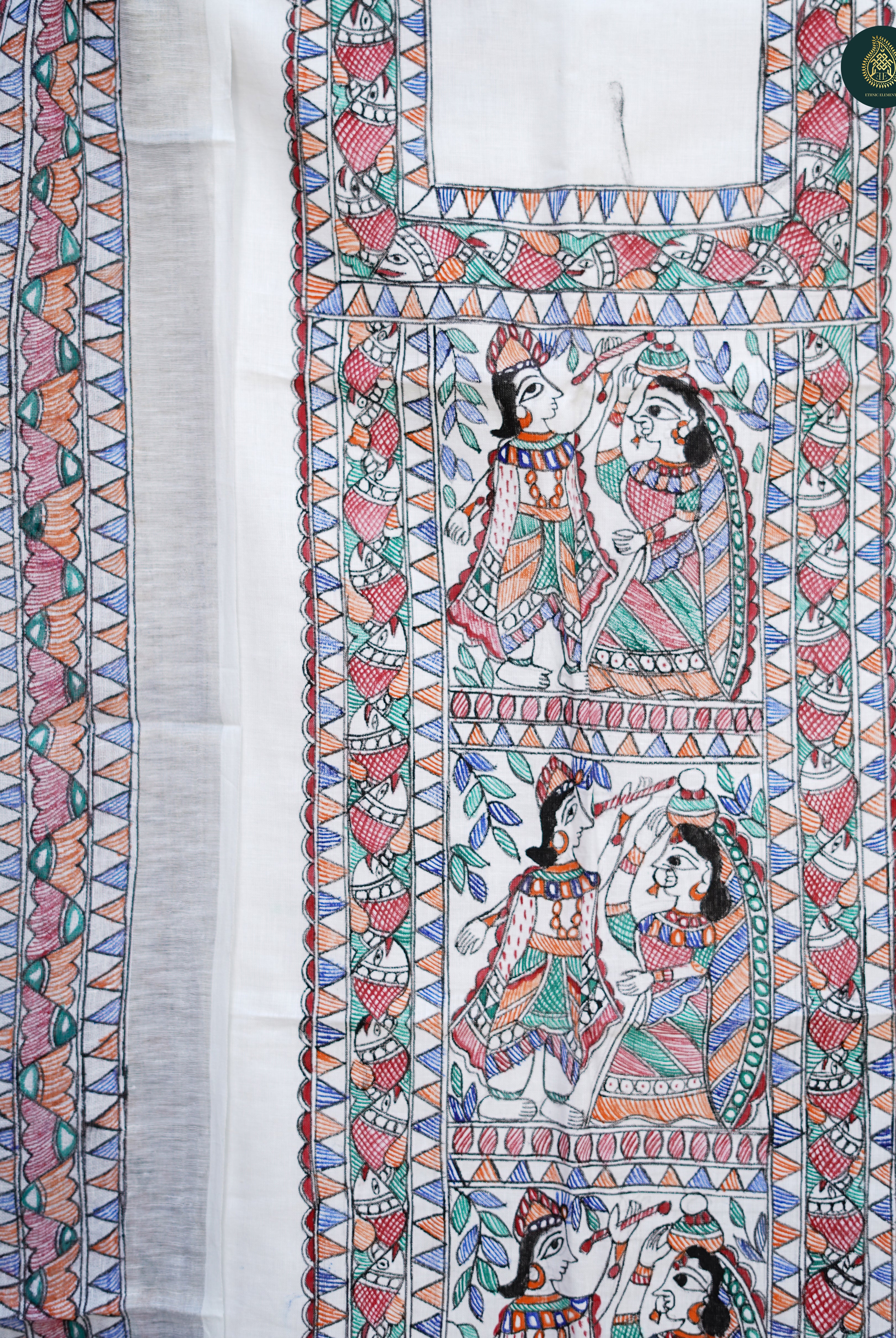 Authentic Original Hand-Painted Madhubani Suit Sets made from pure woven fabrics. Madhubani Art is a type of folk-art form. Each suit consists of line drawings filled with bright colors and contrasts or patterns. Only natural dyes and pigments are used for fabric color and painting.