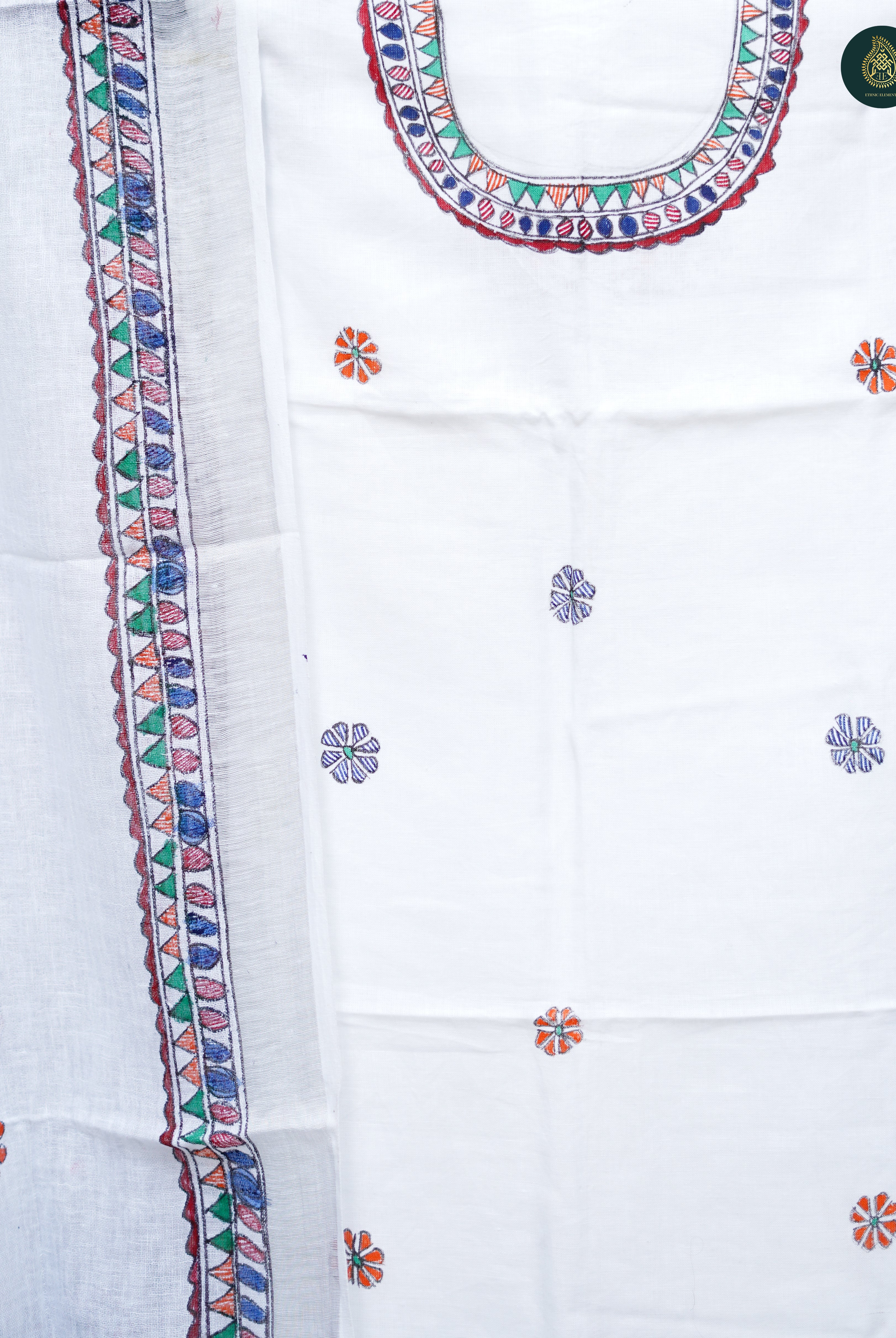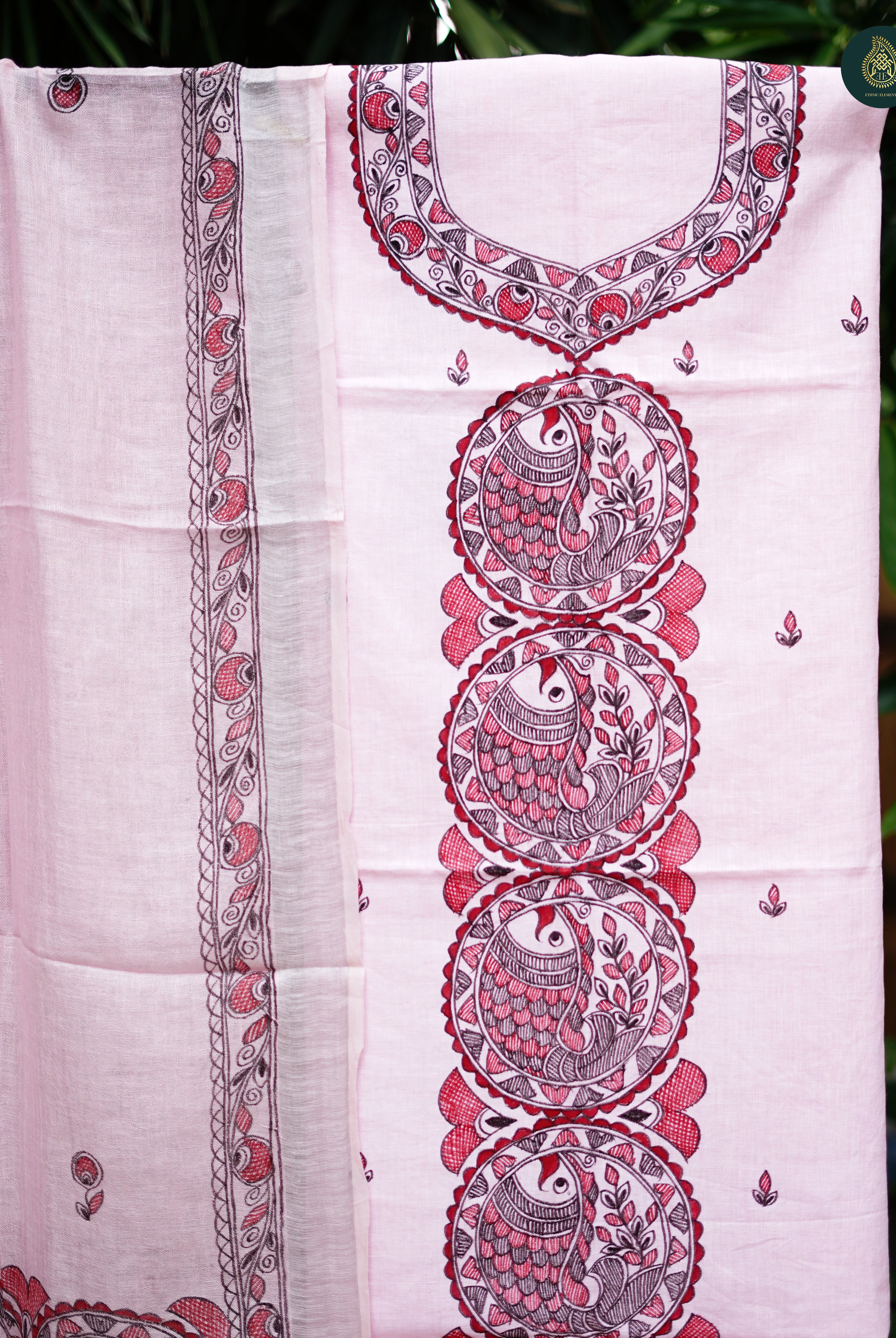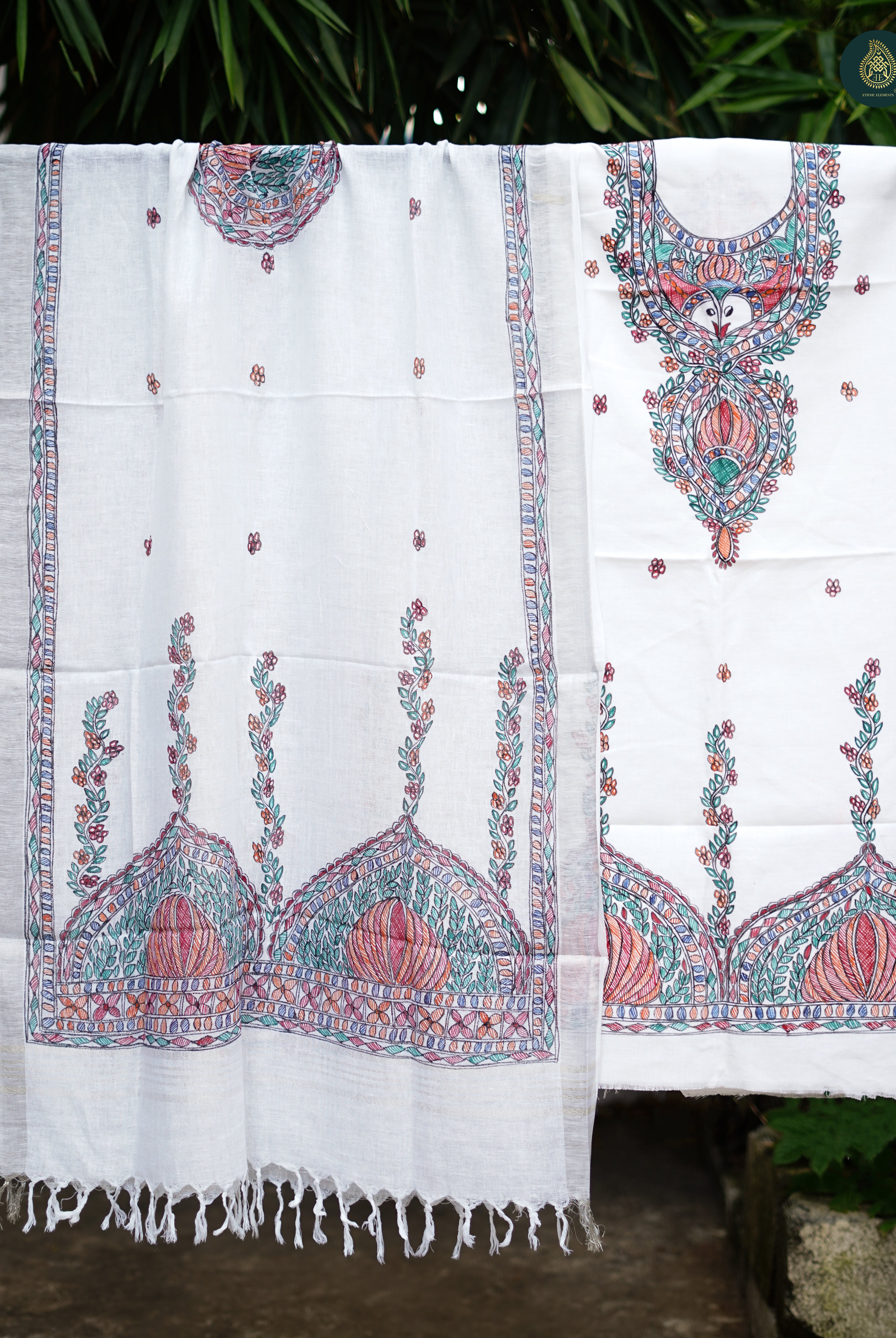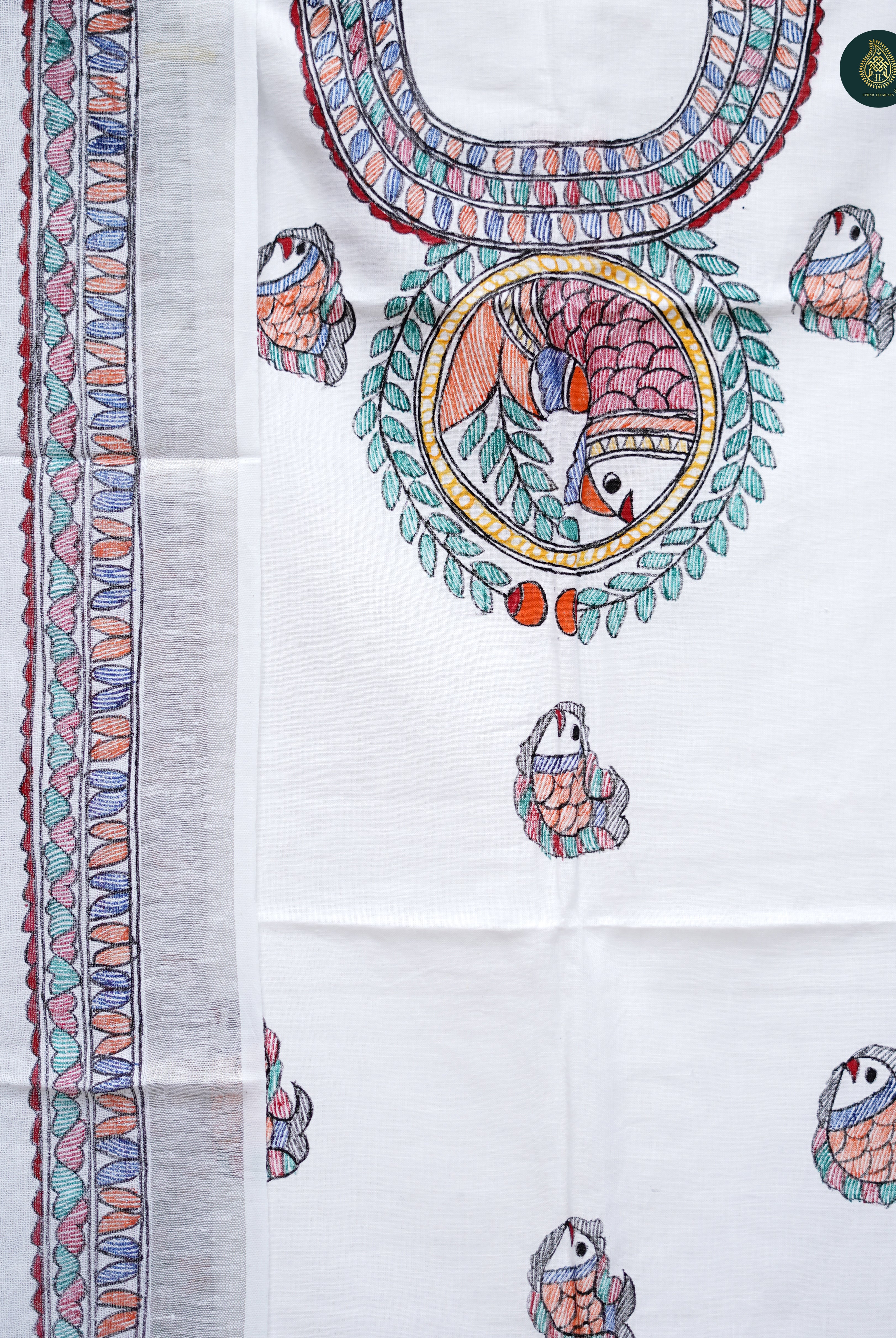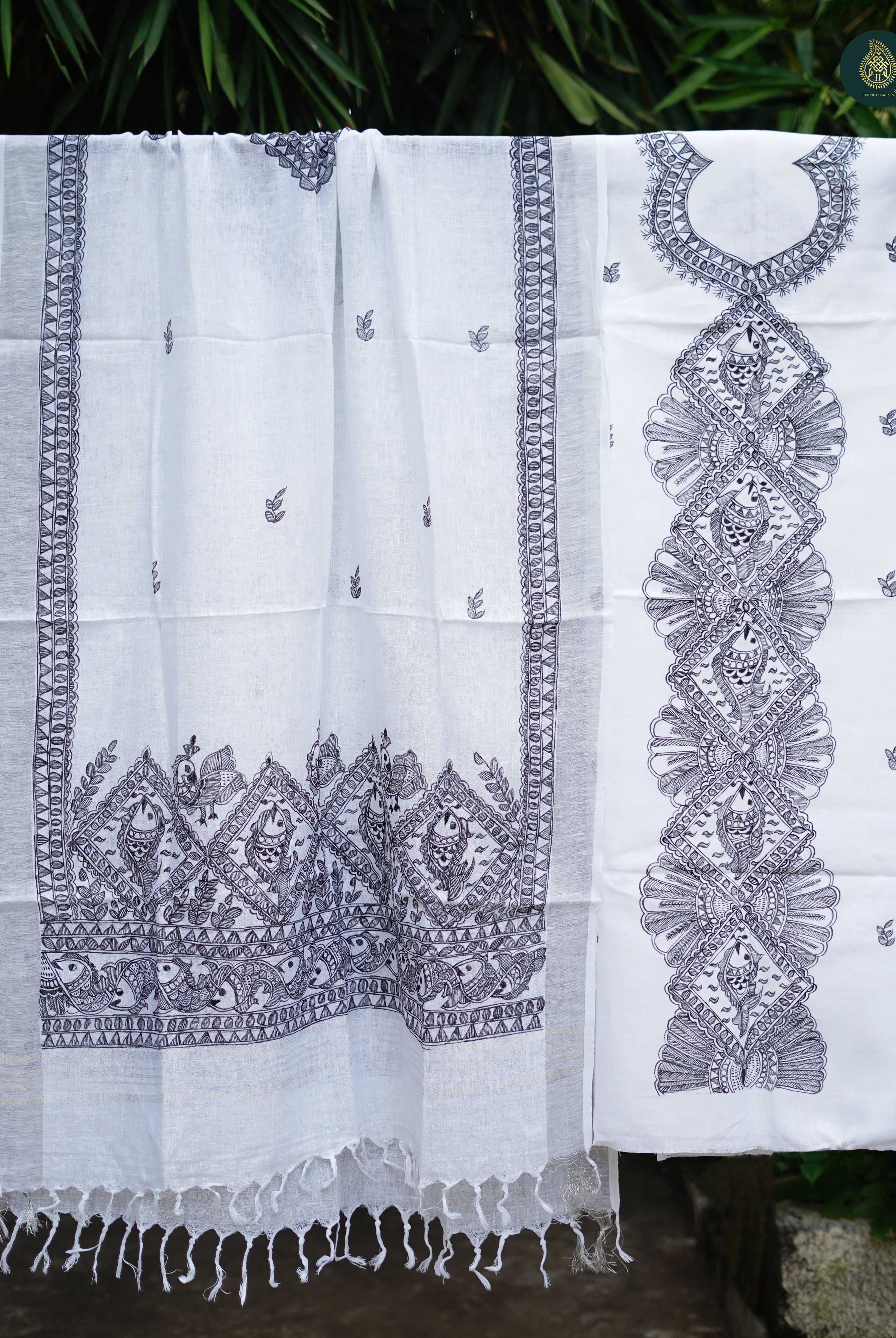 Authentic Original Hand-Painted Madhubani Suit Sets made from pure woven fabrics. Madhubani Art is a type of folk-art form. Each suit consists of line drawings filled with bright colors and contrasts or patterns. Only natural dyes and pigments are used for fabric color and painting.