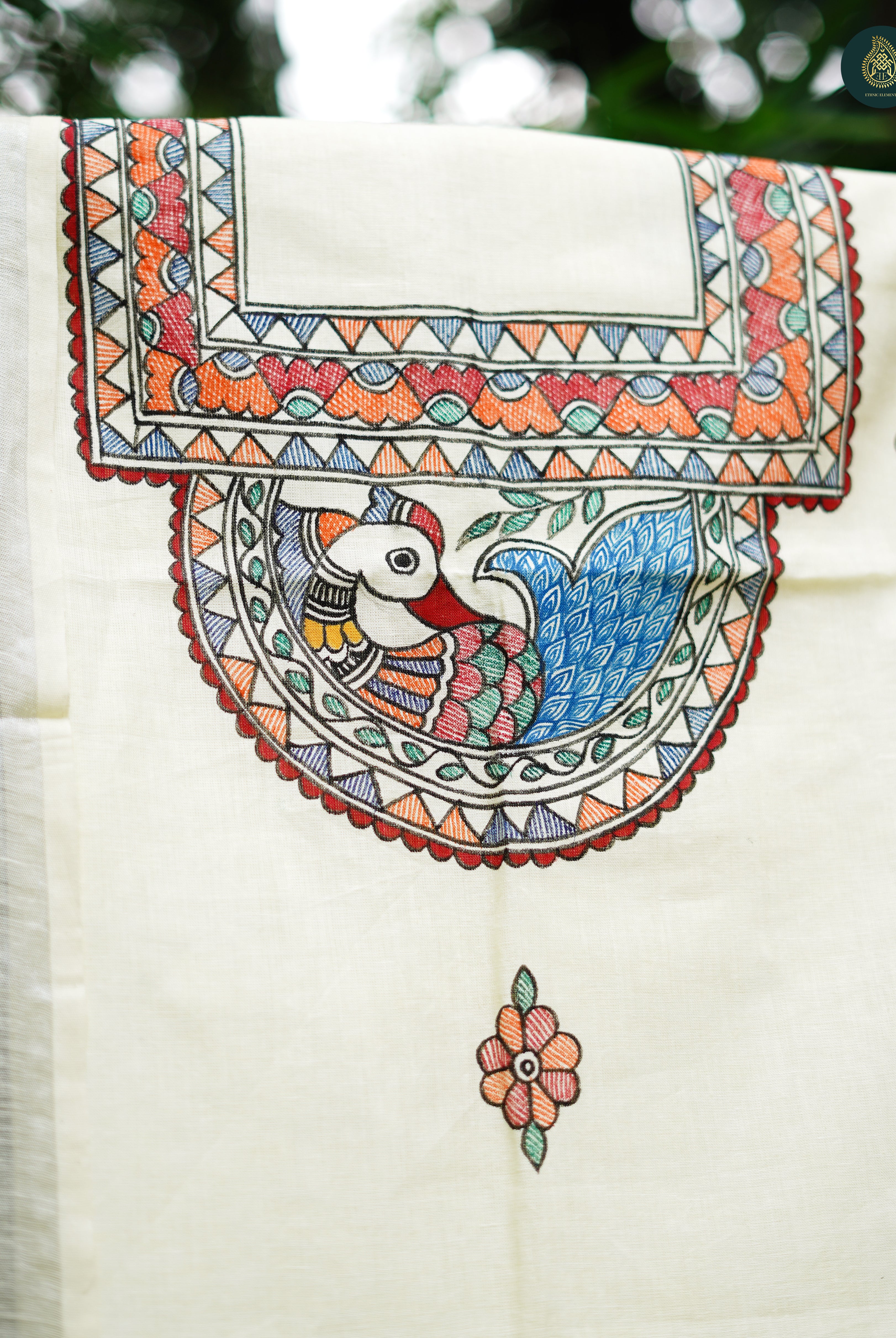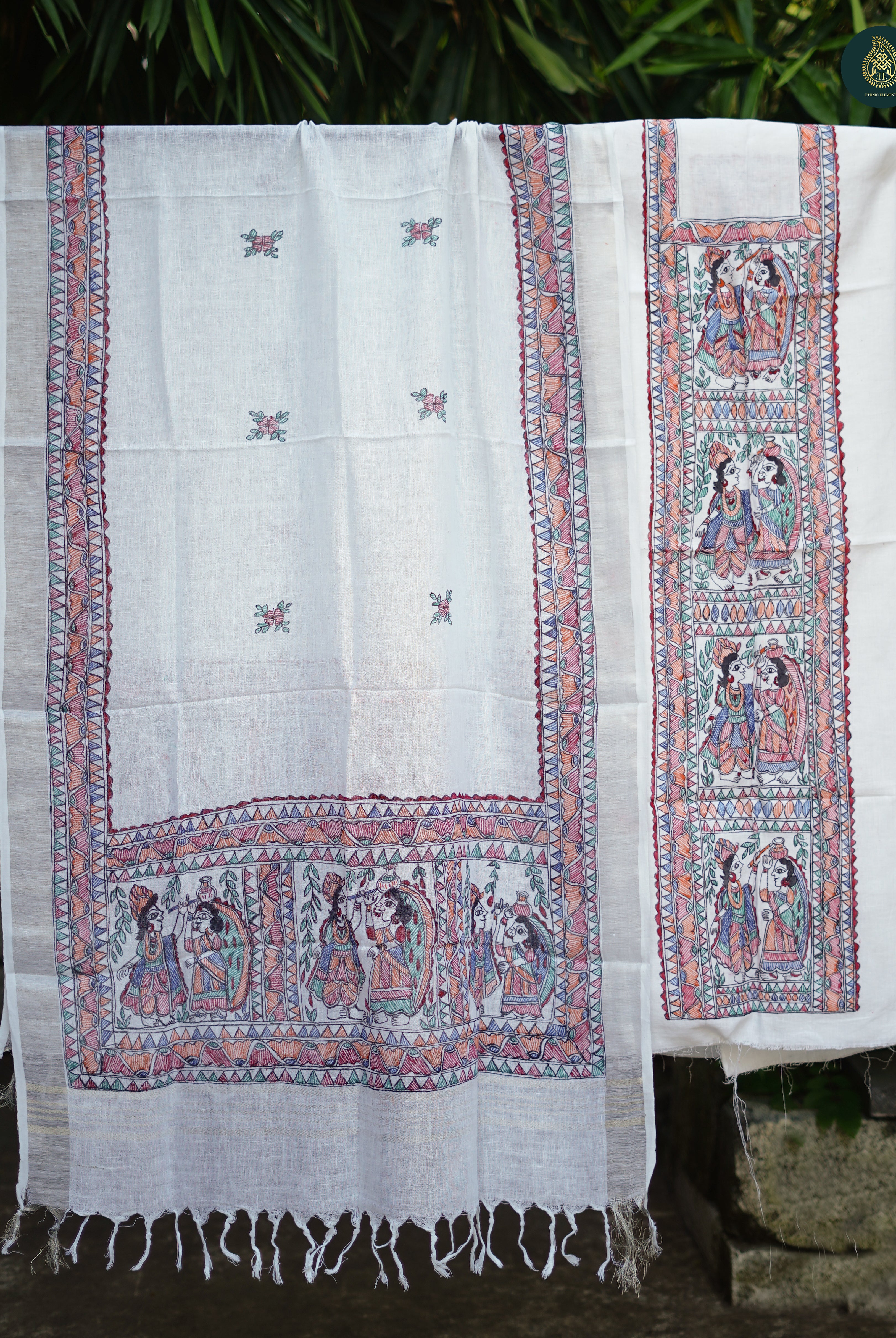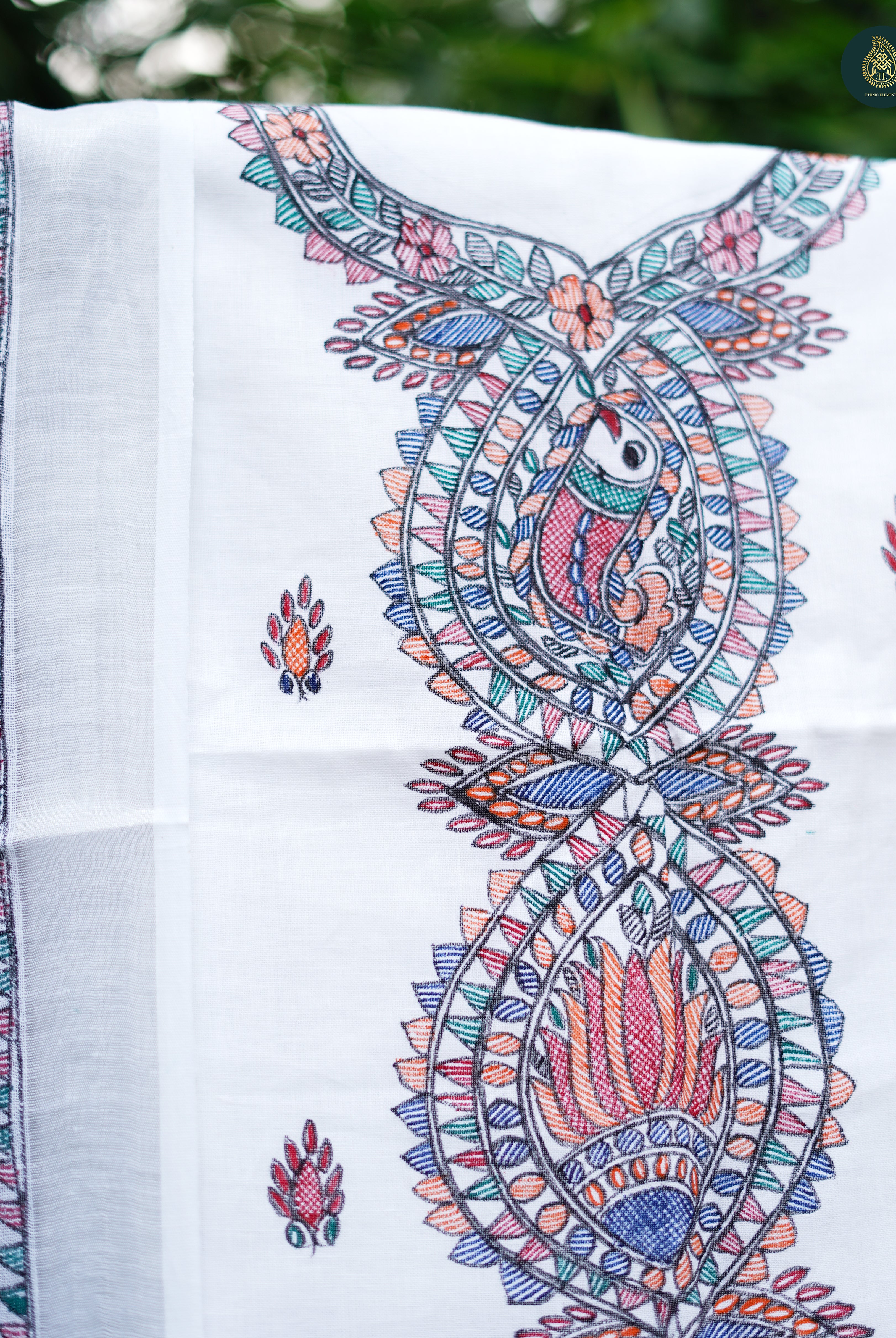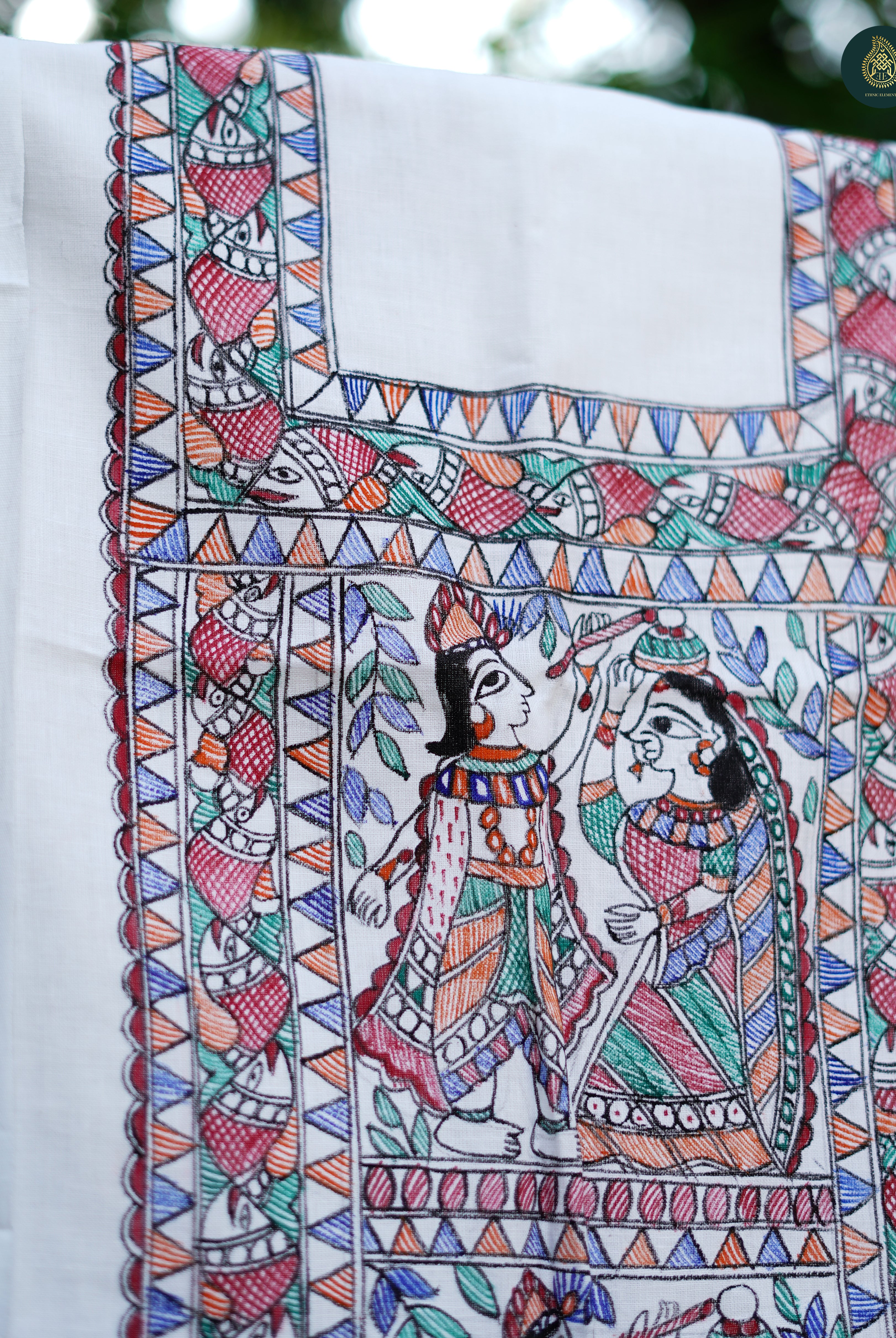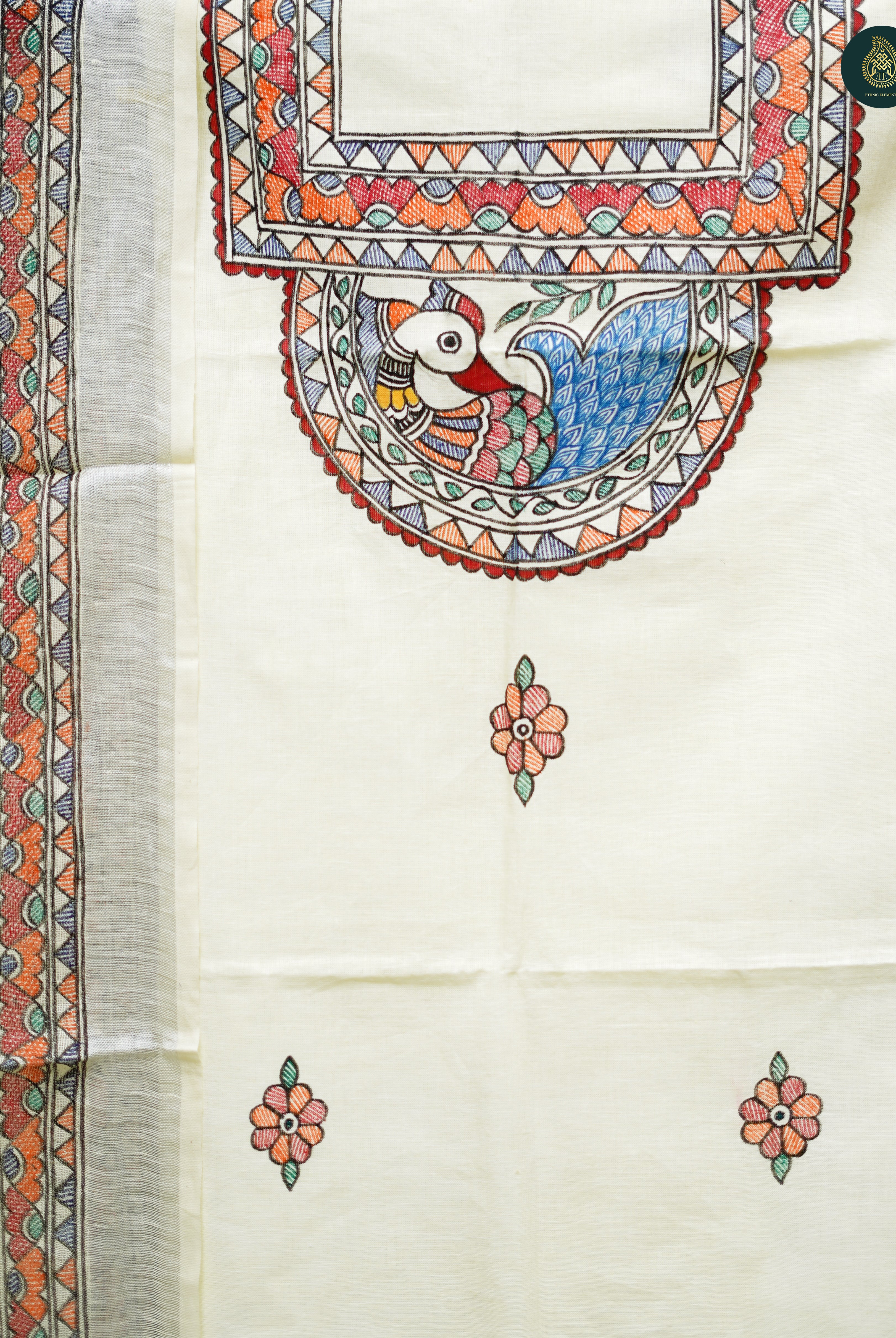 Authentic Original Hand-Painted Madhubani Suit Sets made from pure woven fabrics. Madhubani Art is a type of folk-art form. Each suit consists of line drawings filled with bright colors and contrasts or patterns. Only natural dyes and pigments are used for fabric color and painting.