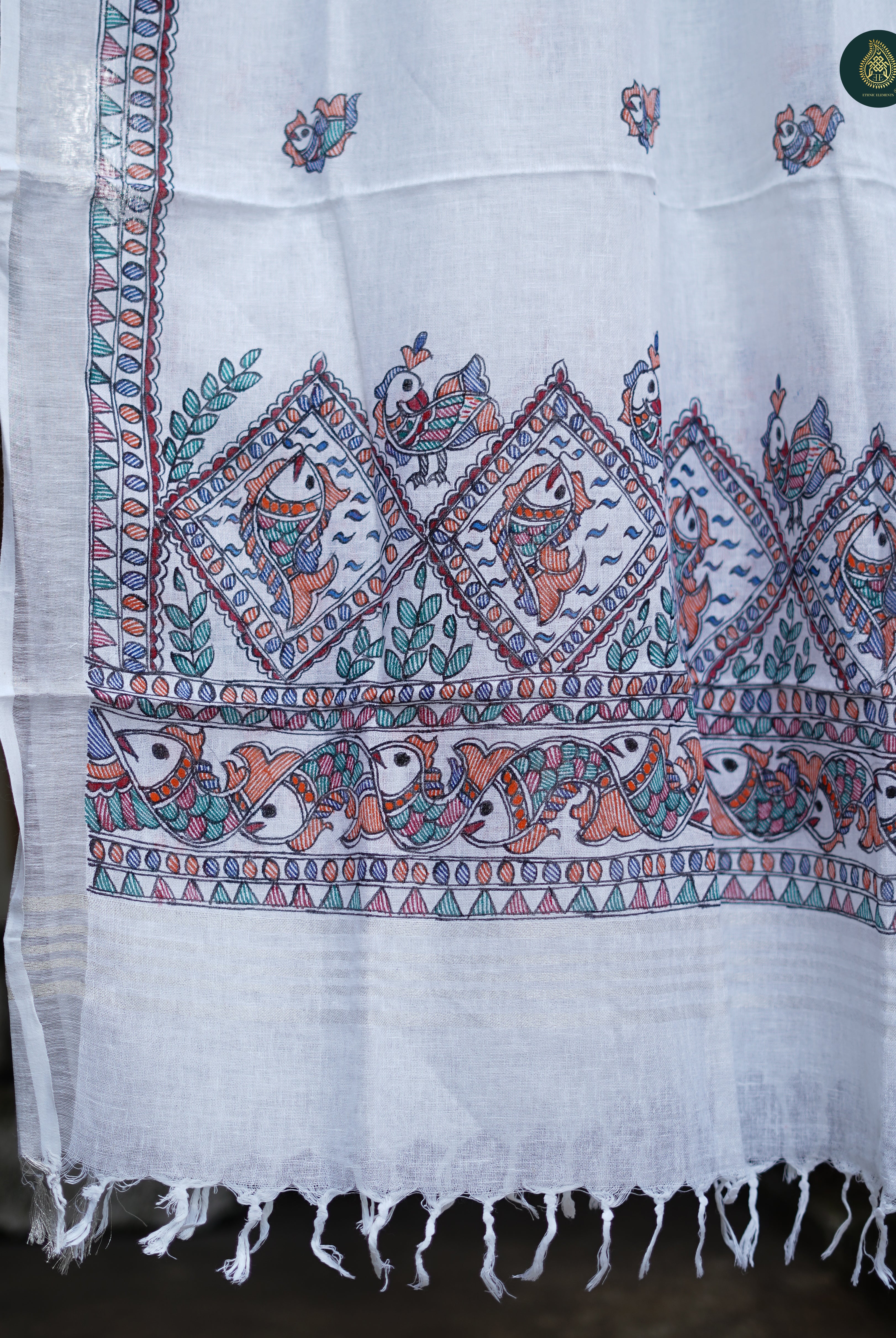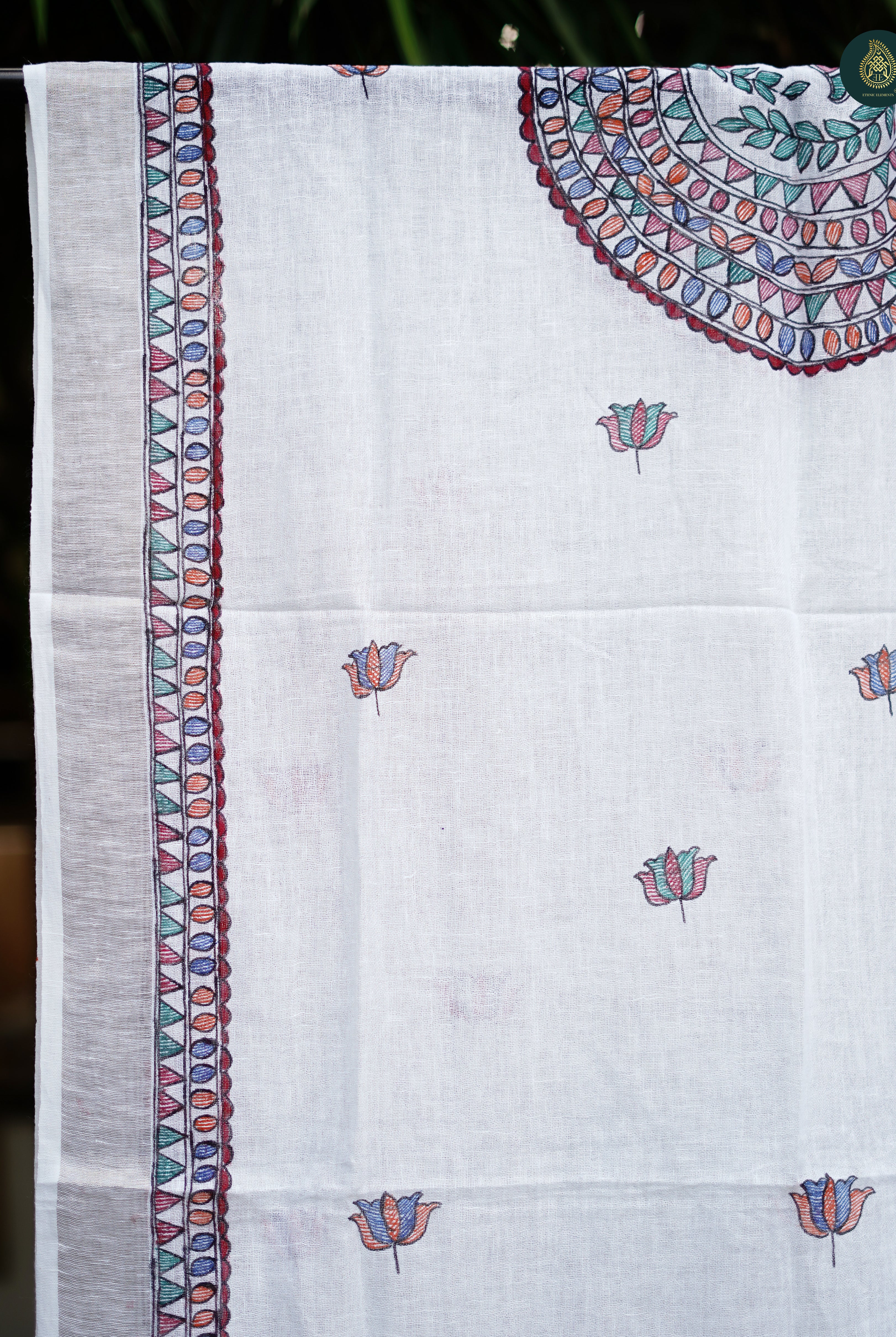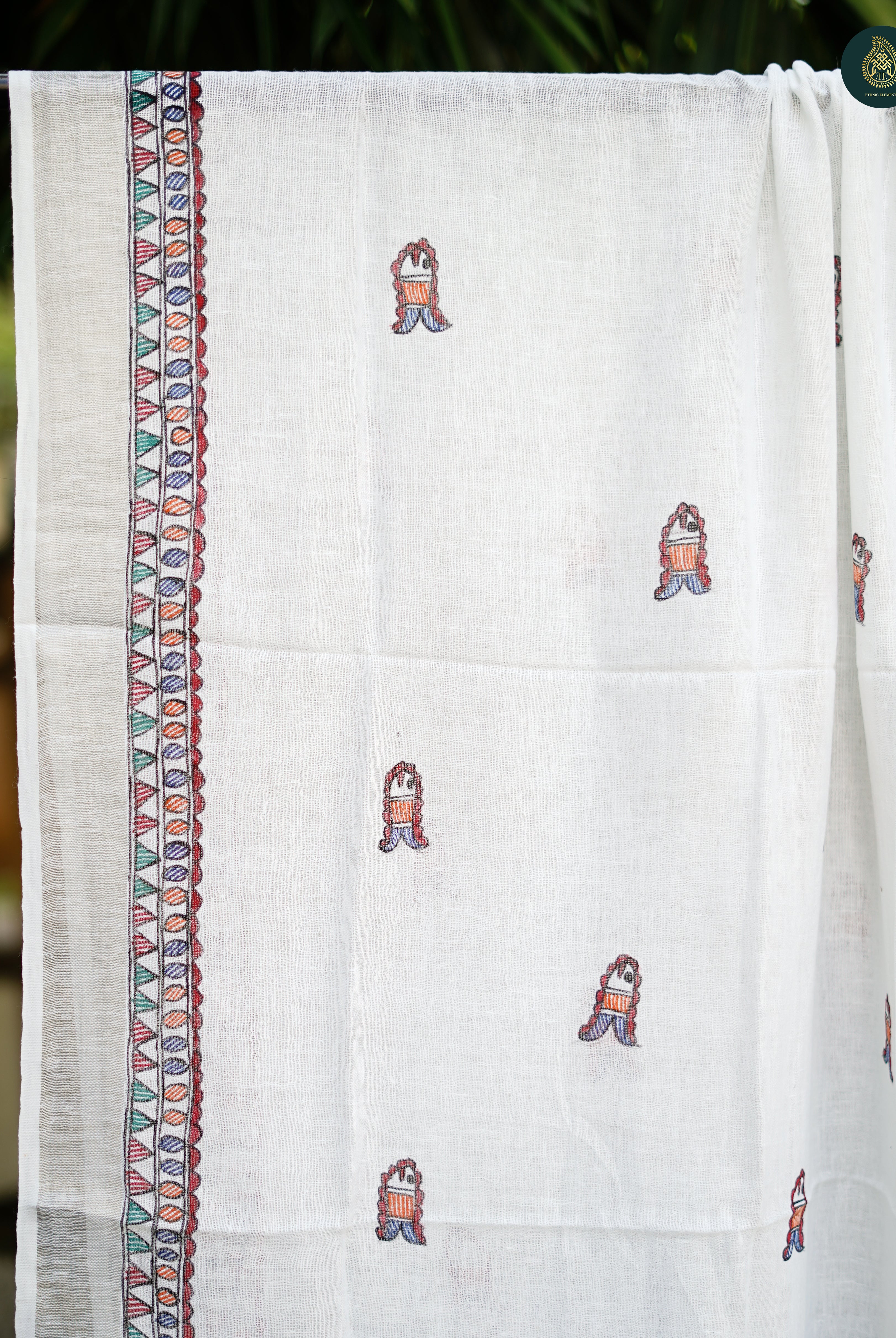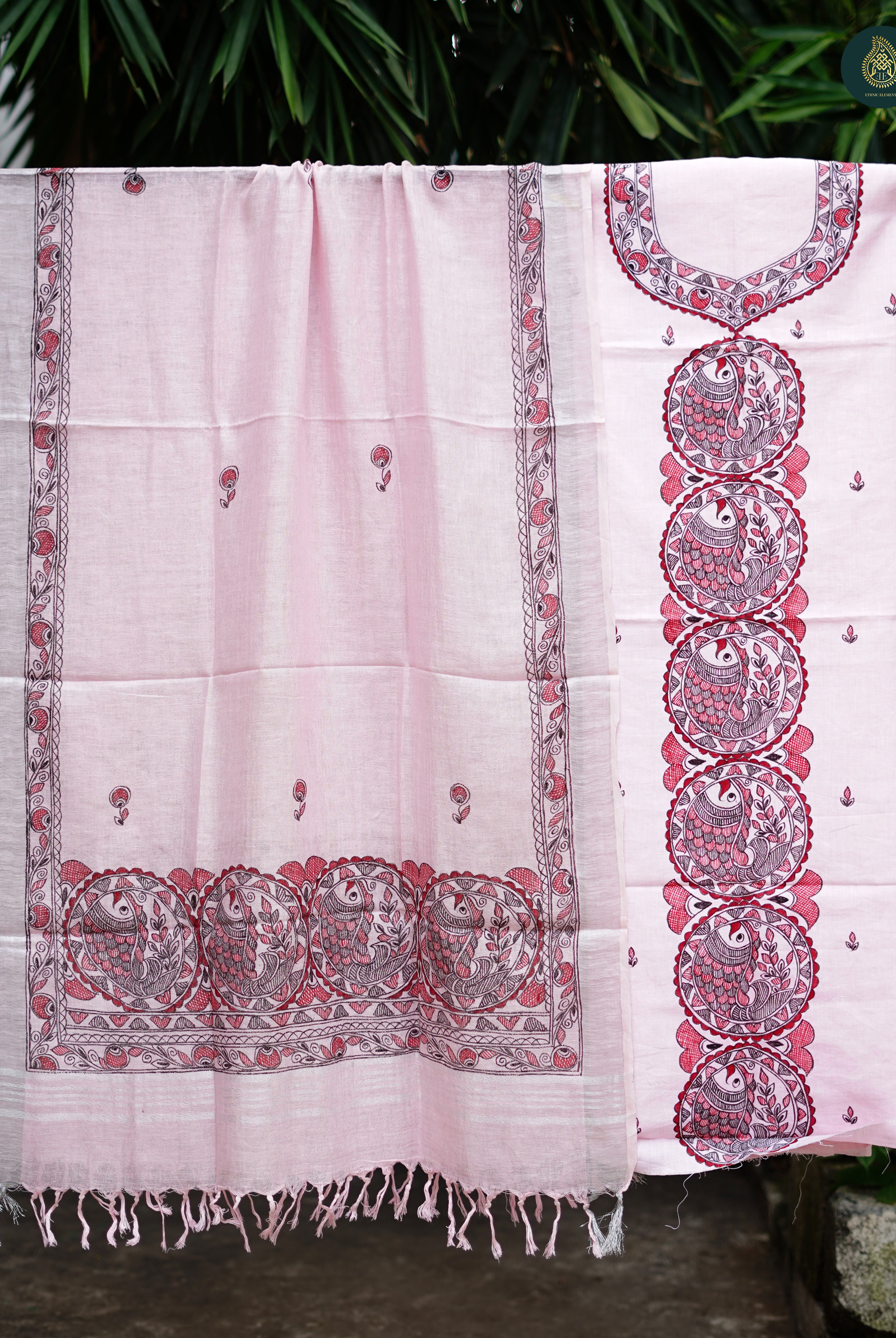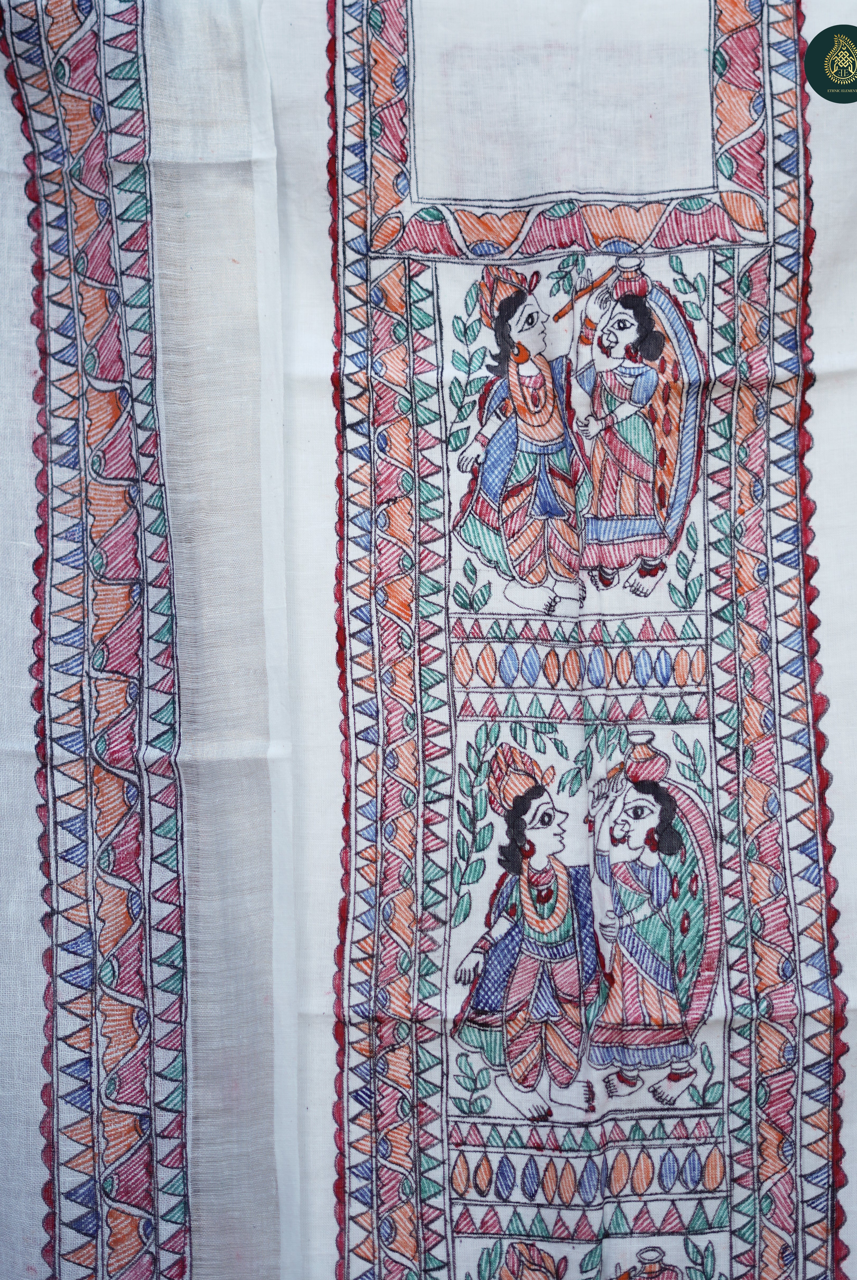 Authentic Original Hand-Painted Madhubani Suit Sets made from pure woven fabrics. Madhubani Art is a type of folk-art form. Each suit consists of line drawings filled with bright colors and contrasts or patterns. Only natural dyes and pigments are used for fabric color and painting.