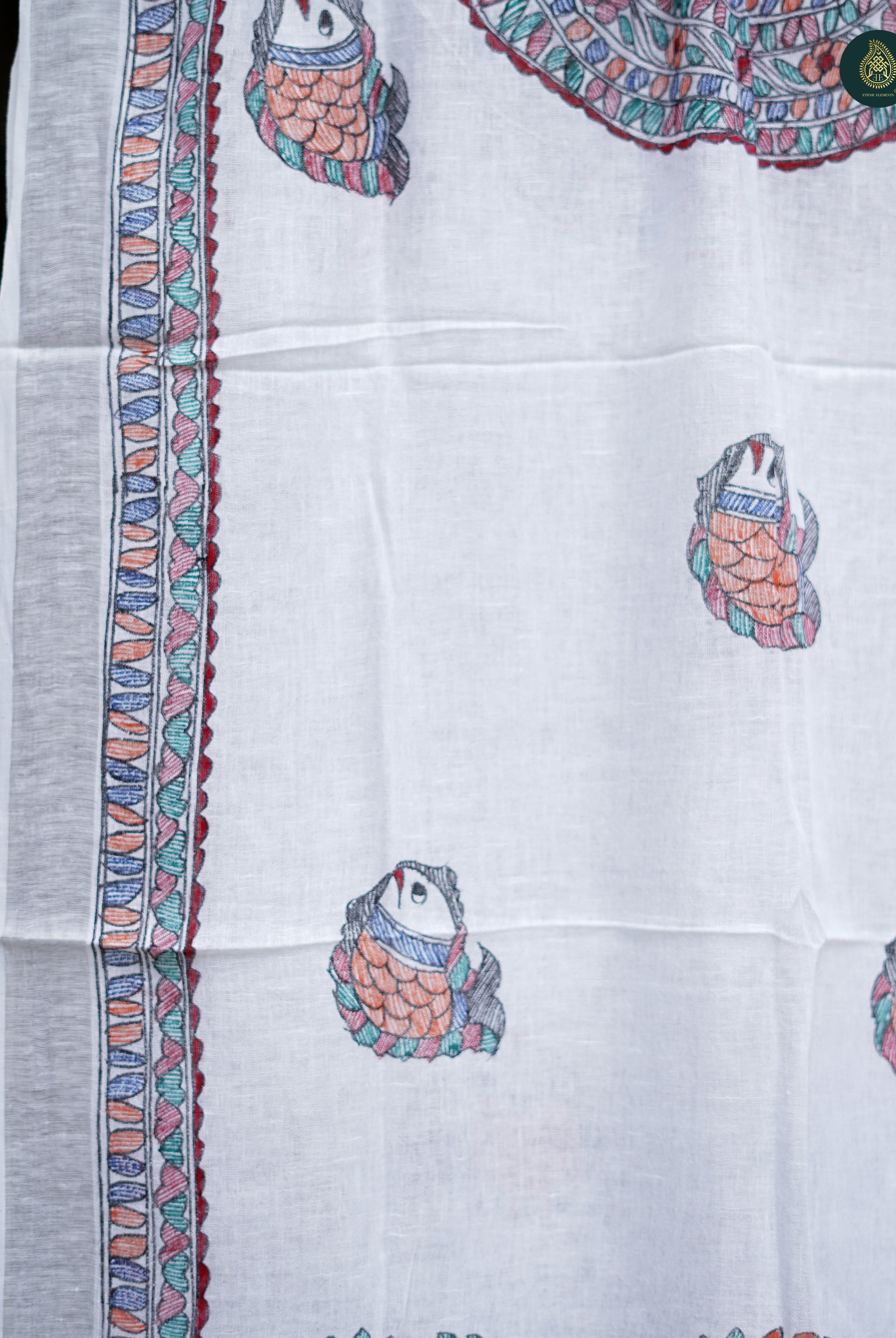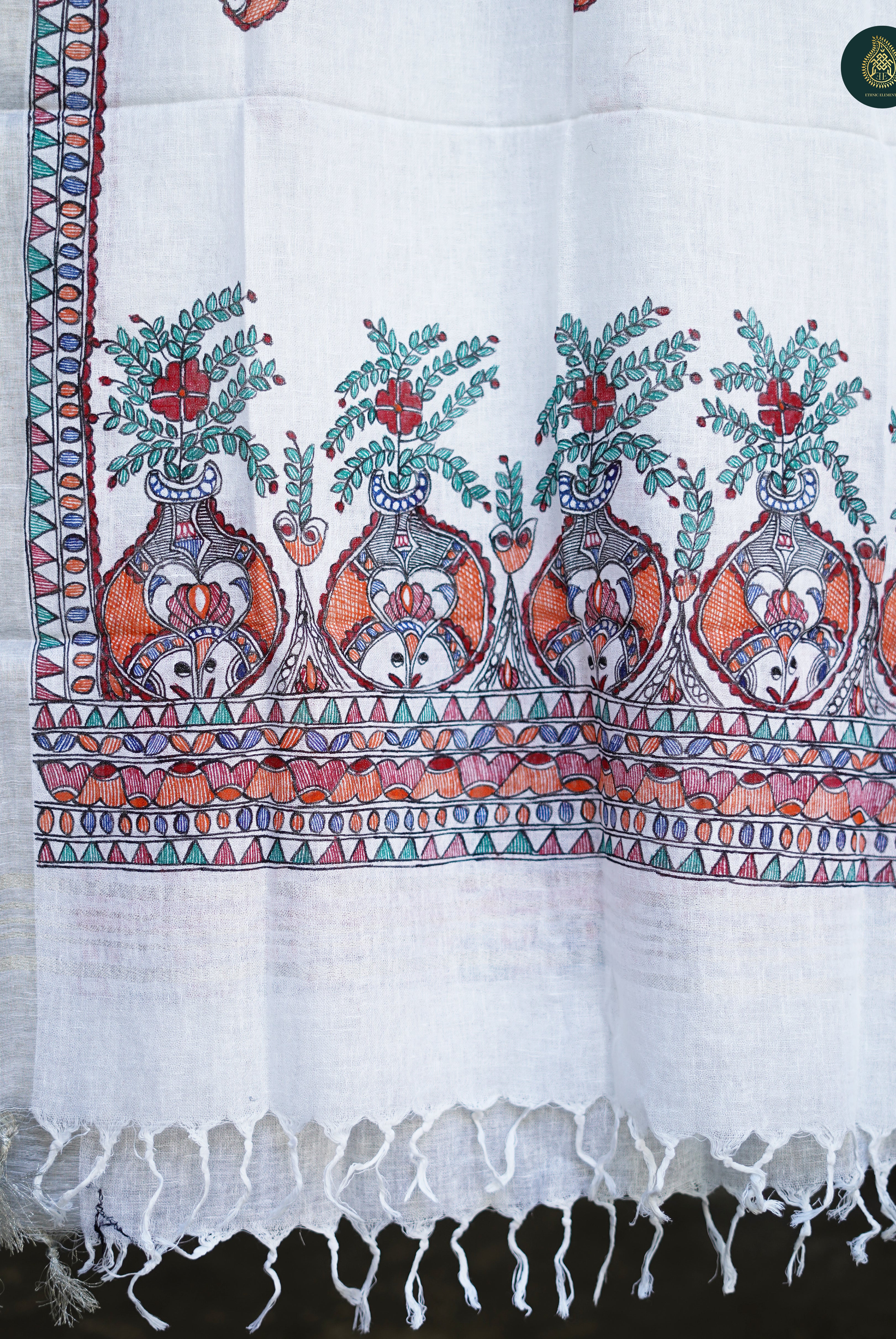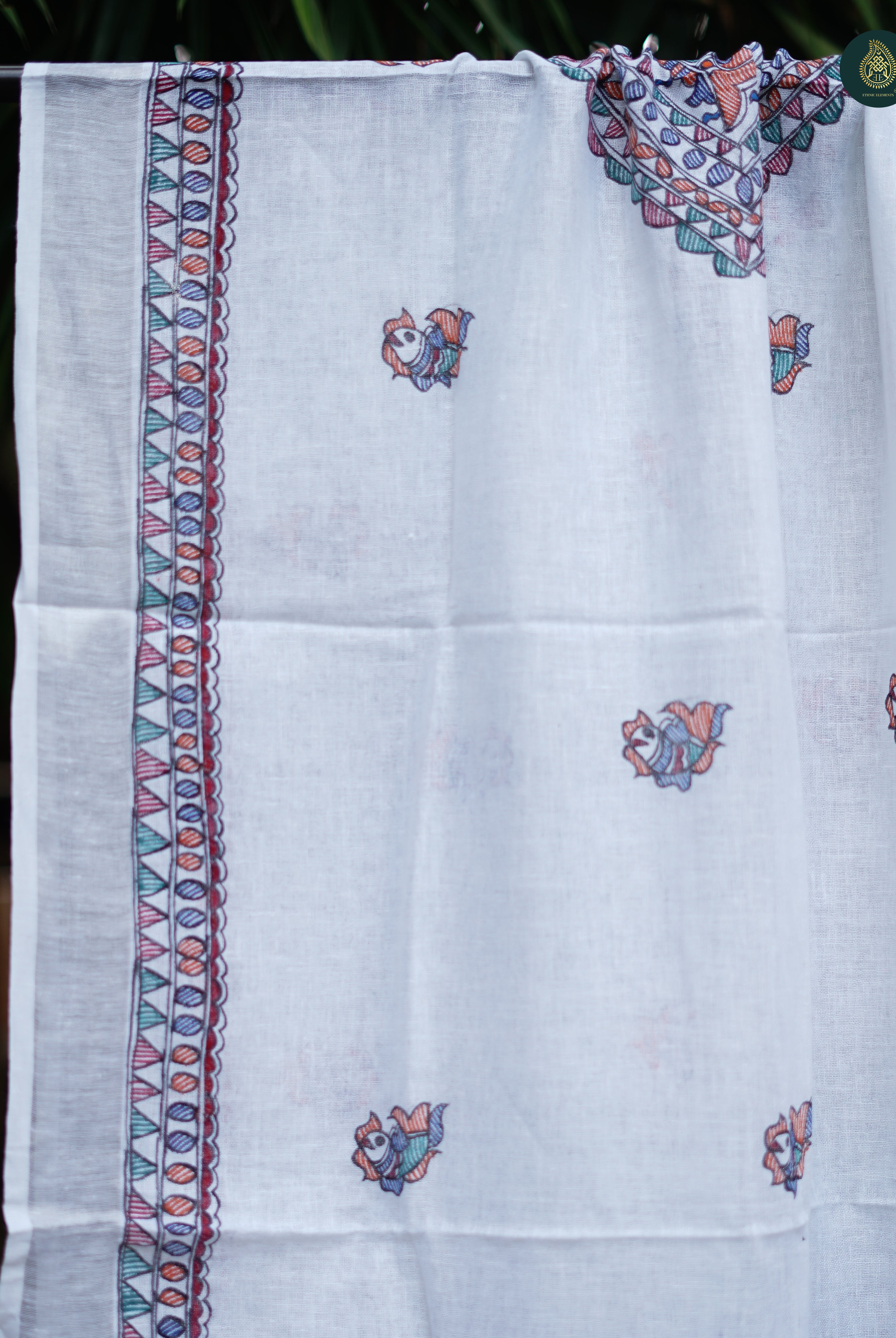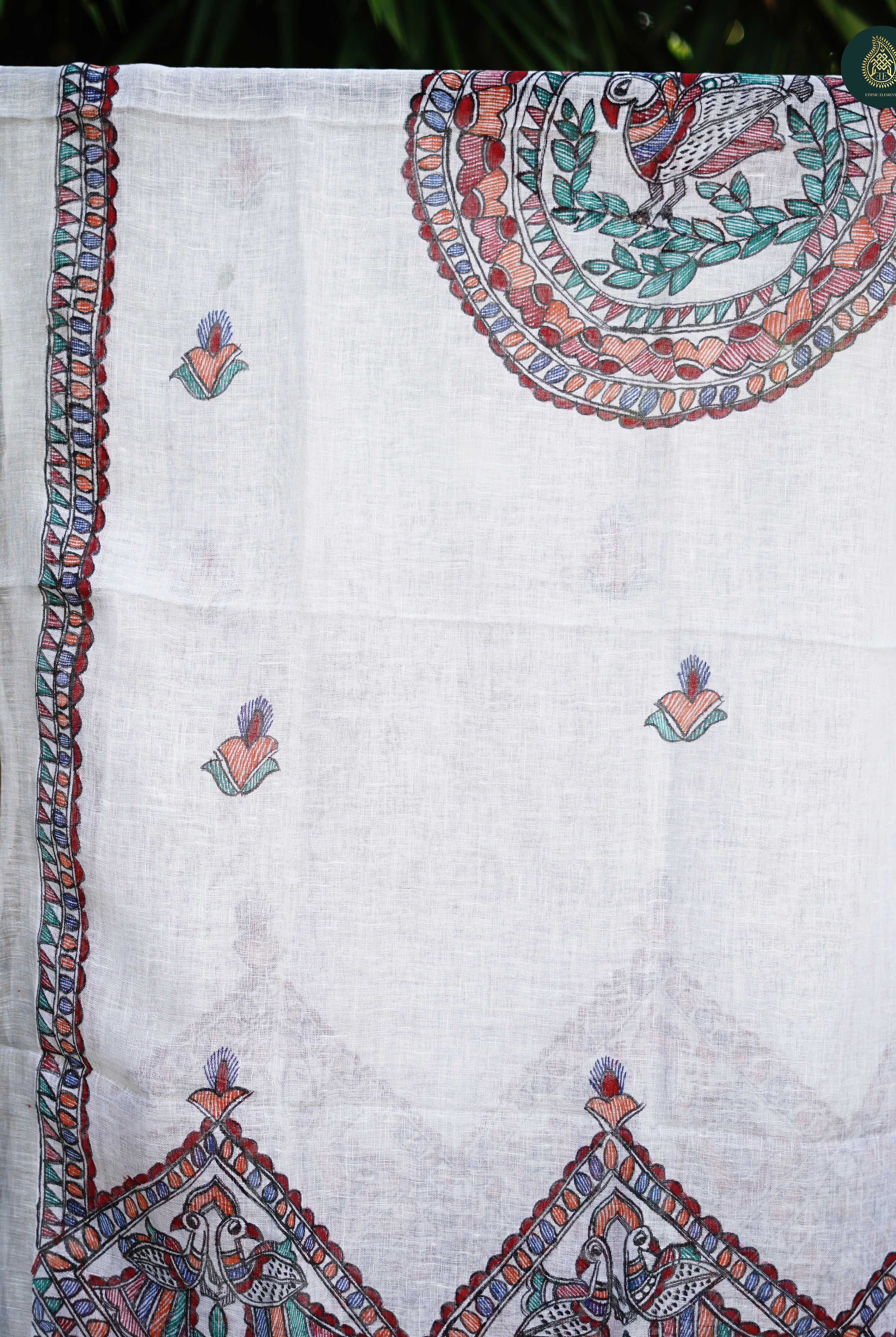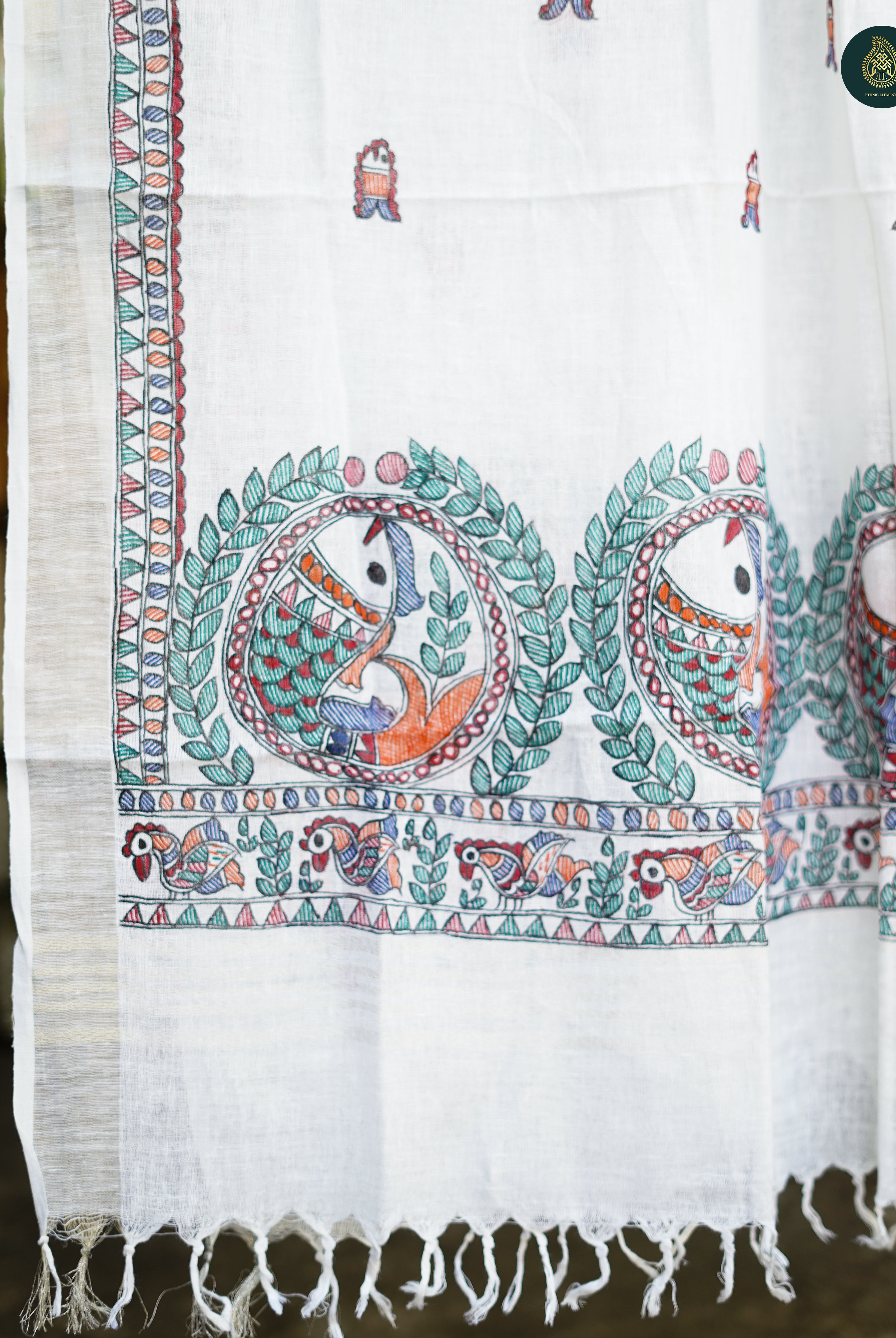 Authentic Original Hand-Painted Madhubani Suit Sets made from pure woven fabrics. Madhubani Art is a type of folk-art form. Each suit consists of line drawings filled with bright colors and contrasts or patterns. Only natural dyes and pigments are used for fabric color and painting.