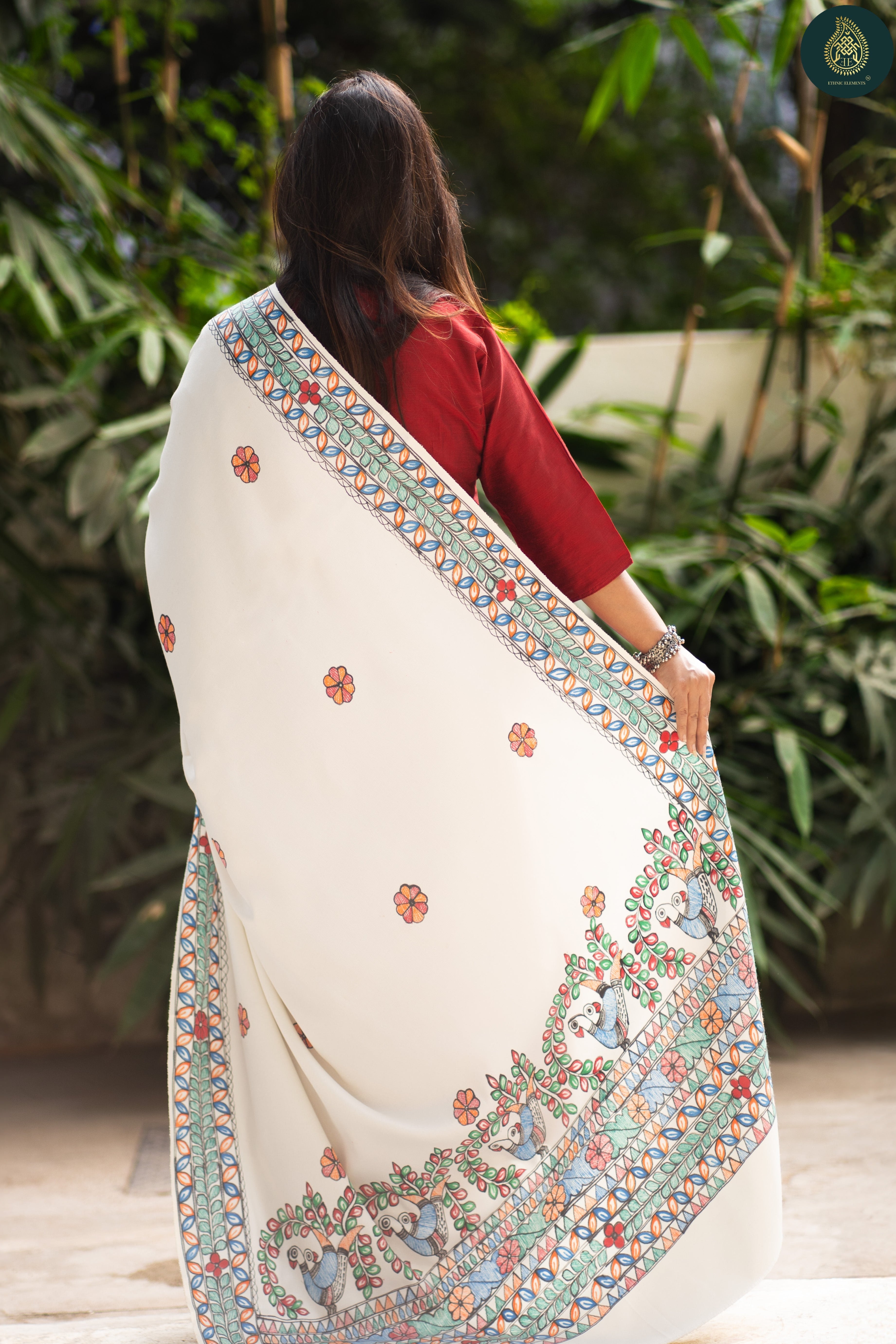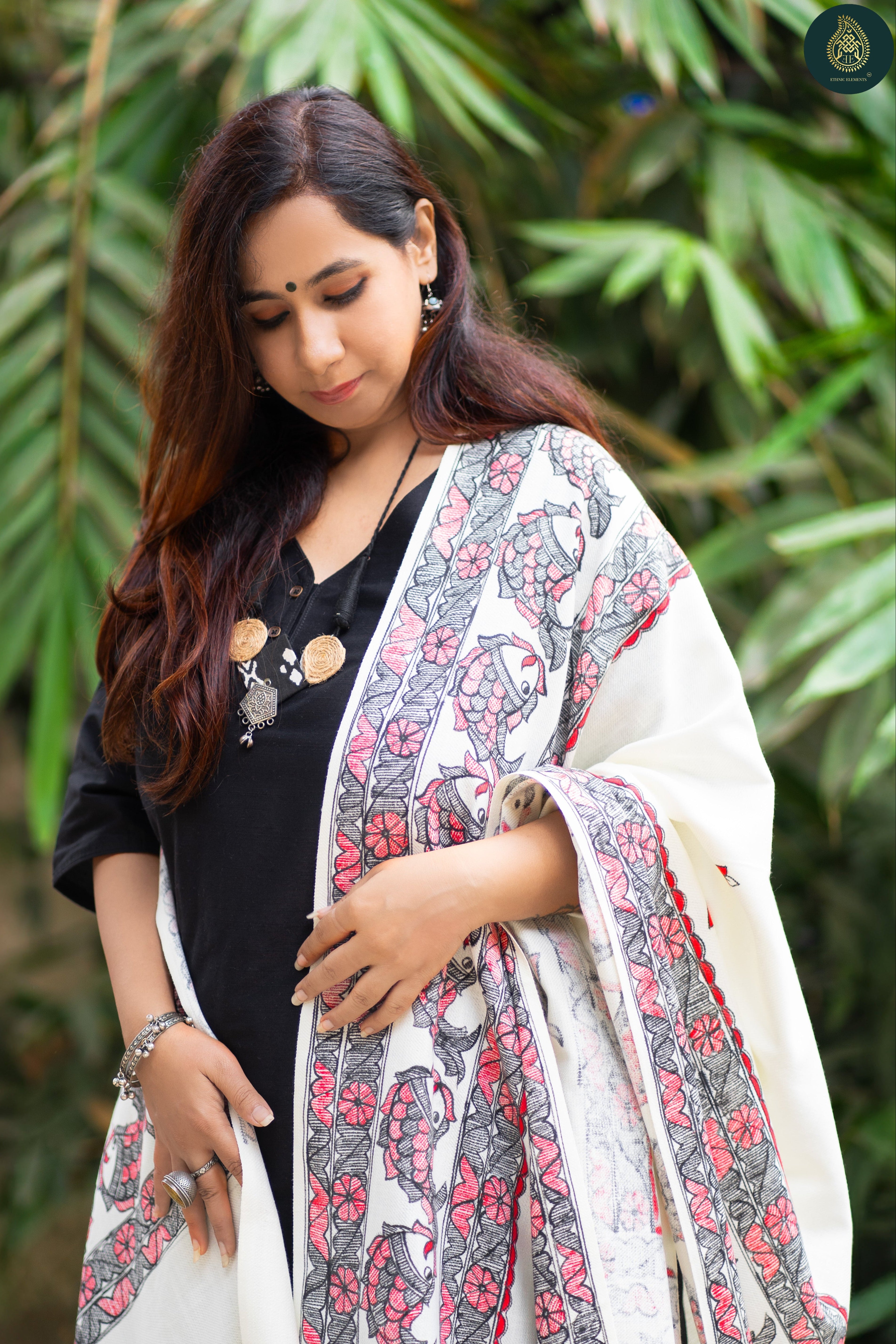Madhubani Cotton Kurta & Linen Dupatta Hand Painted Pacchie White Suit