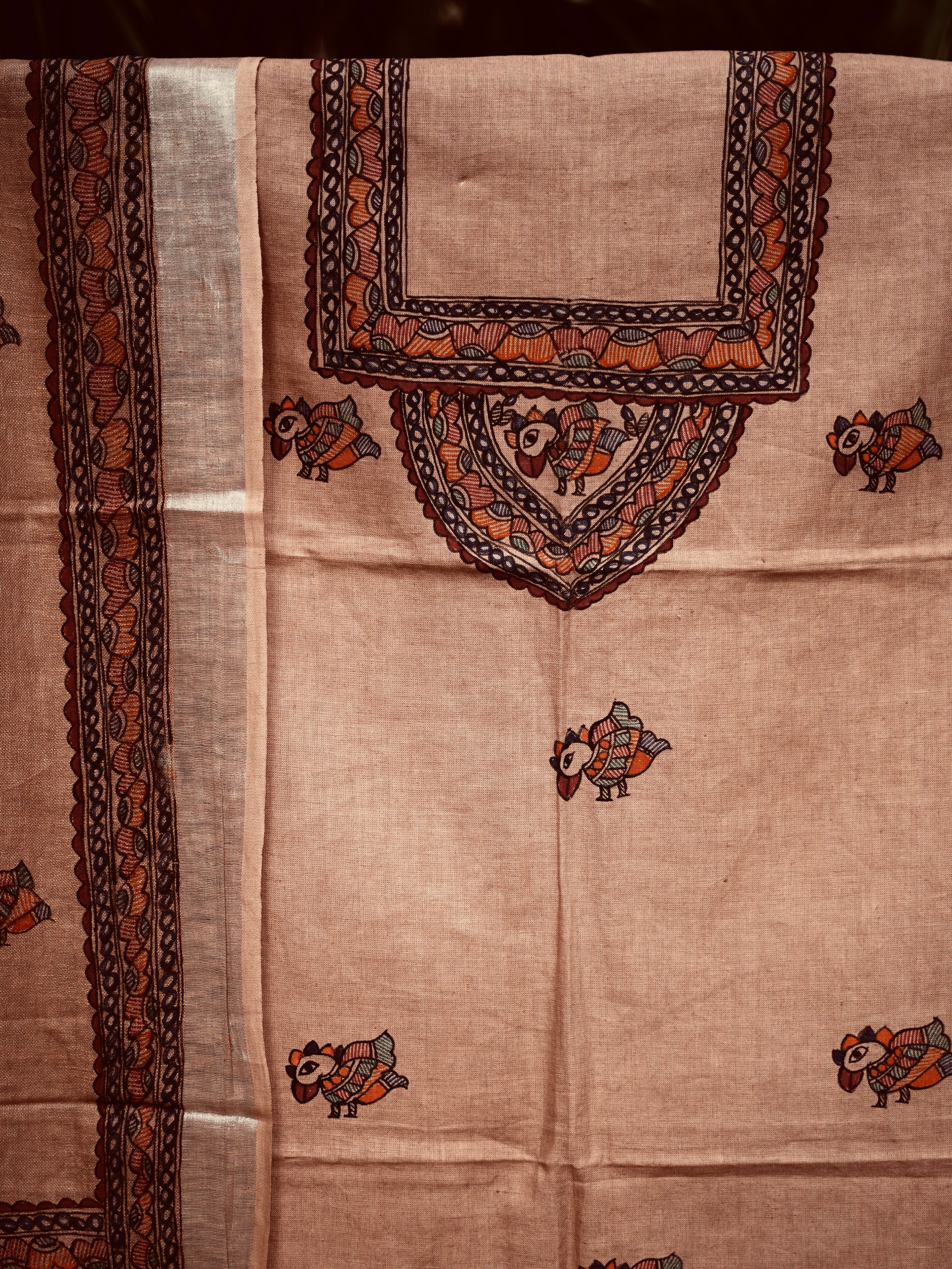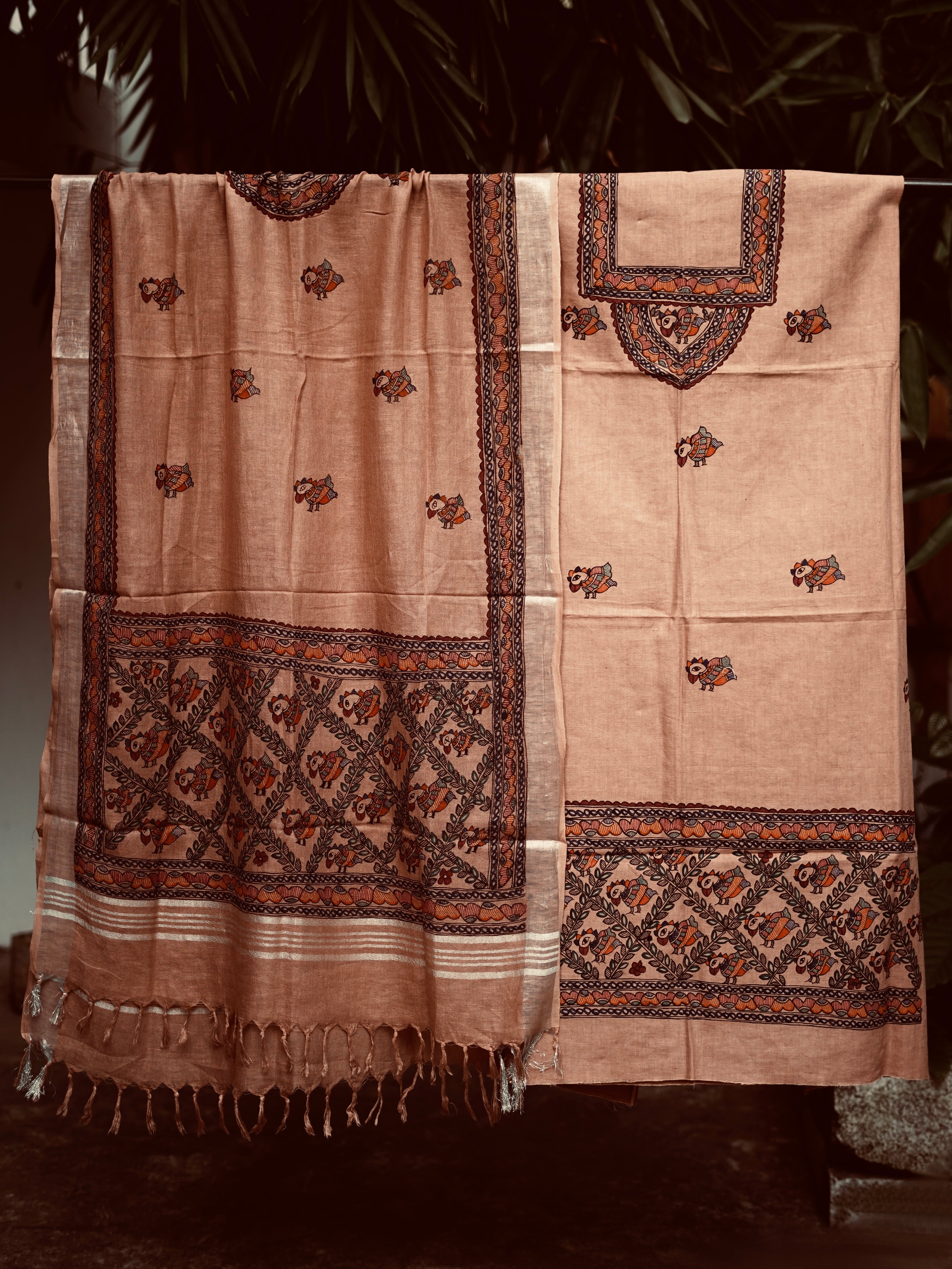 Madhubani Cotton Kurta & Linen Dupatta Hand Painted Cheak Crayola Suit