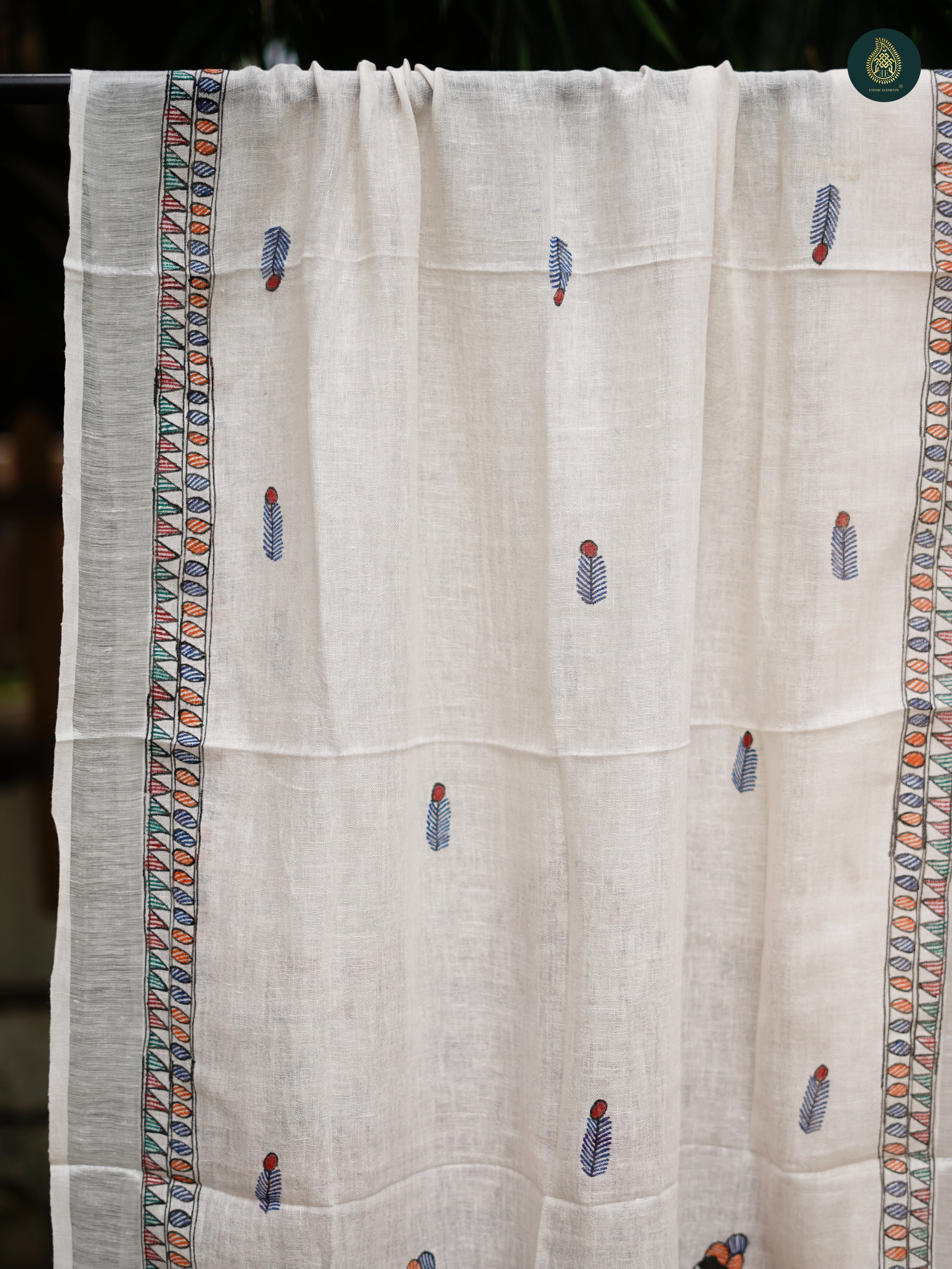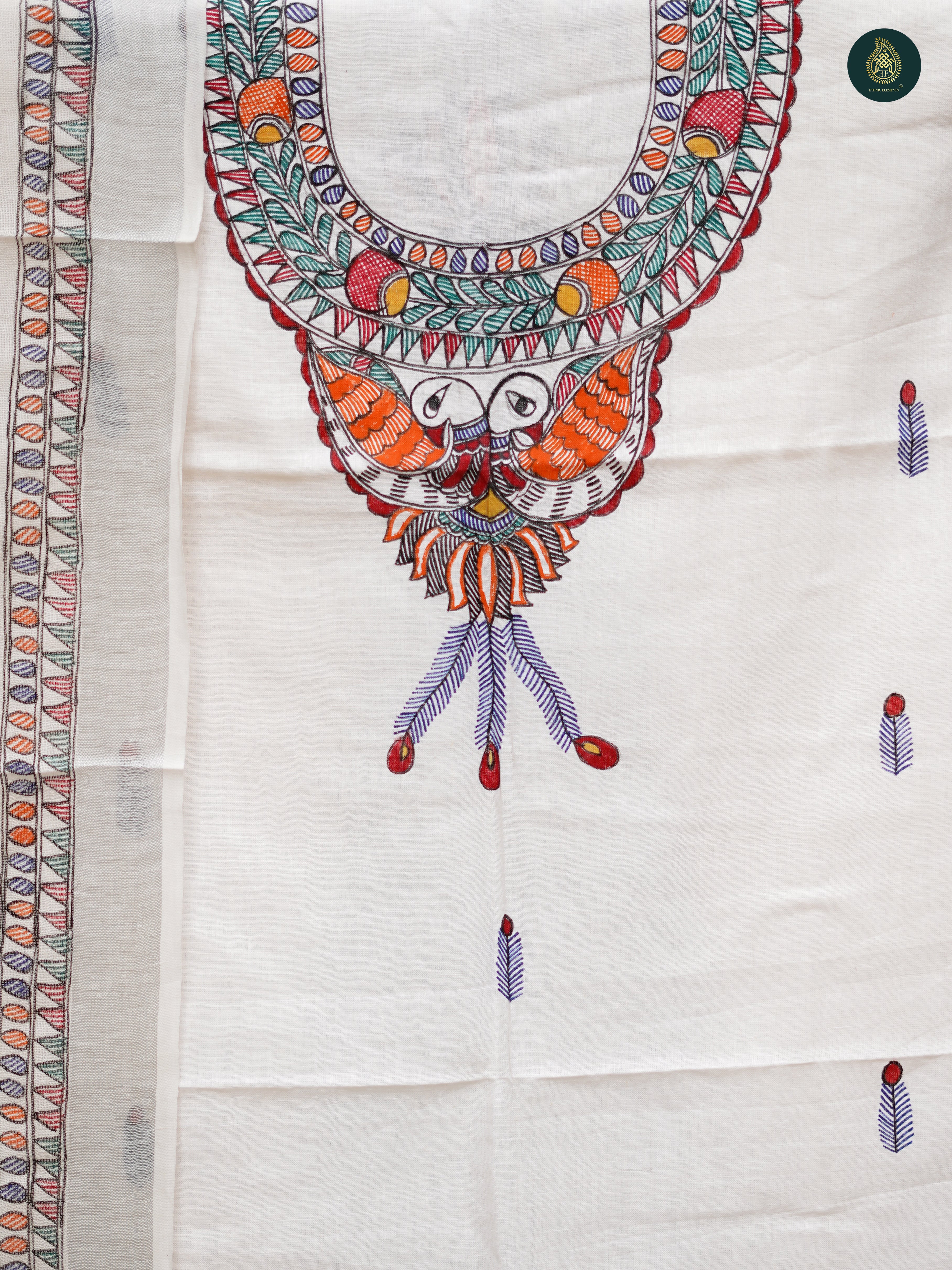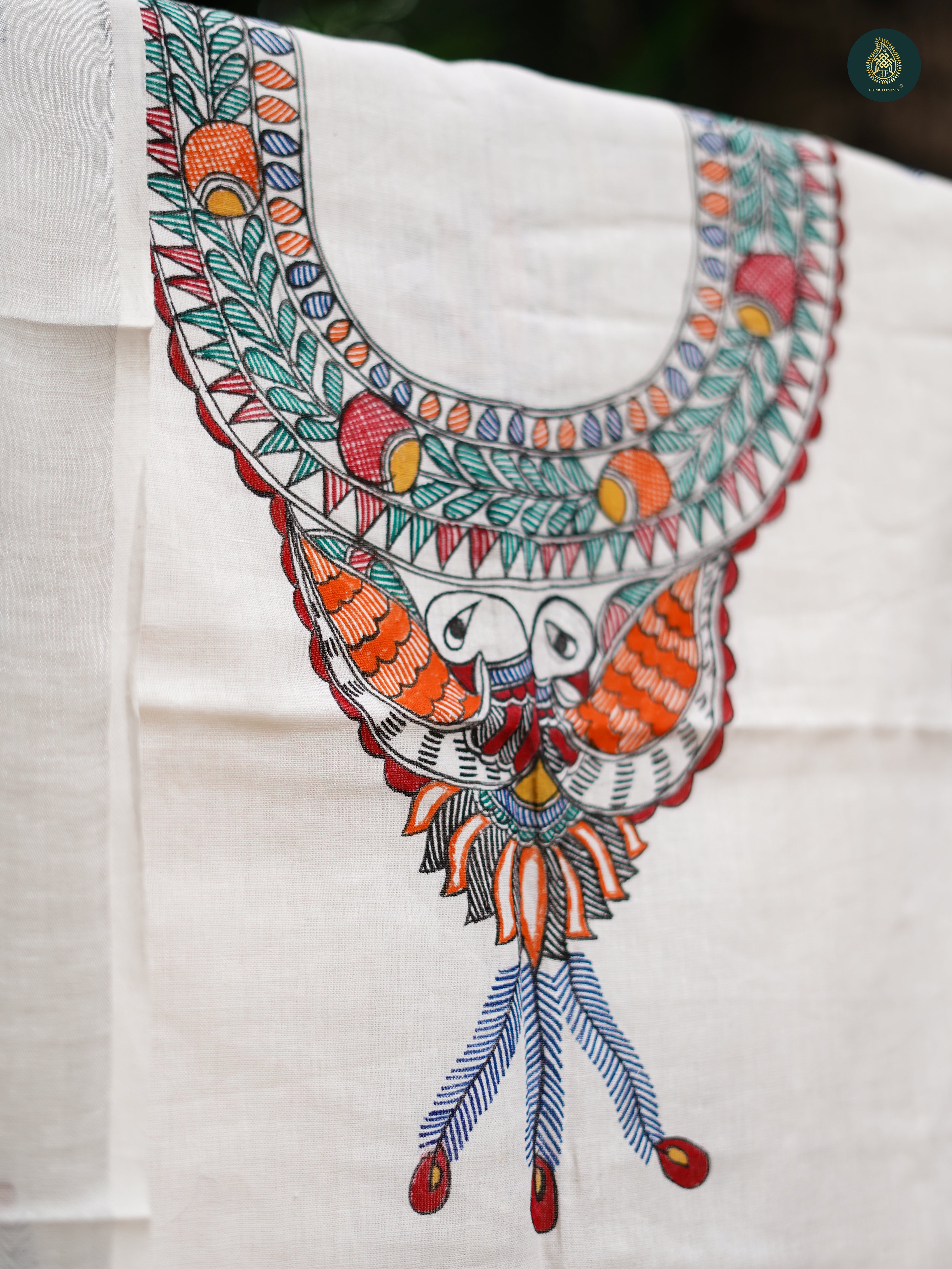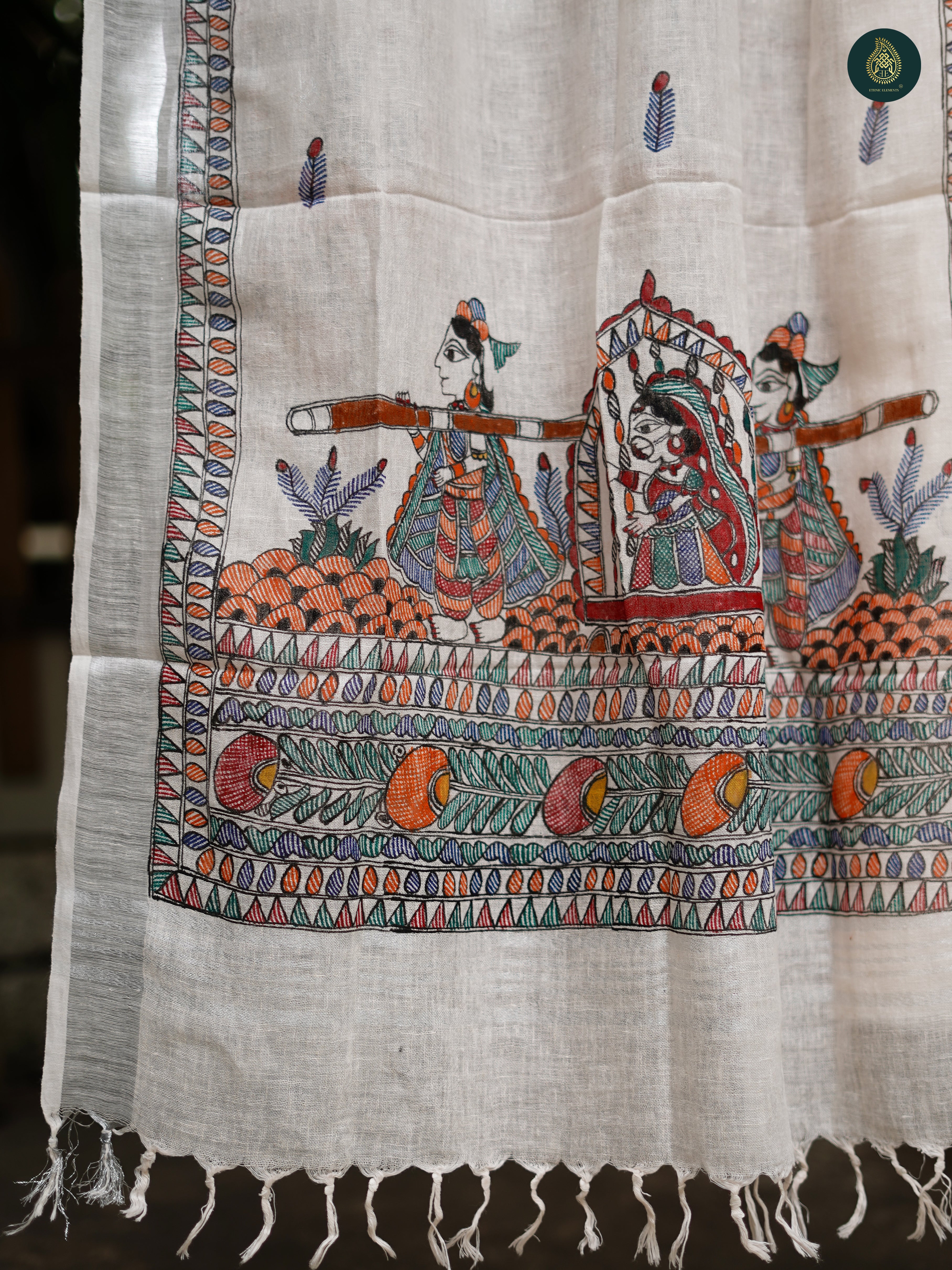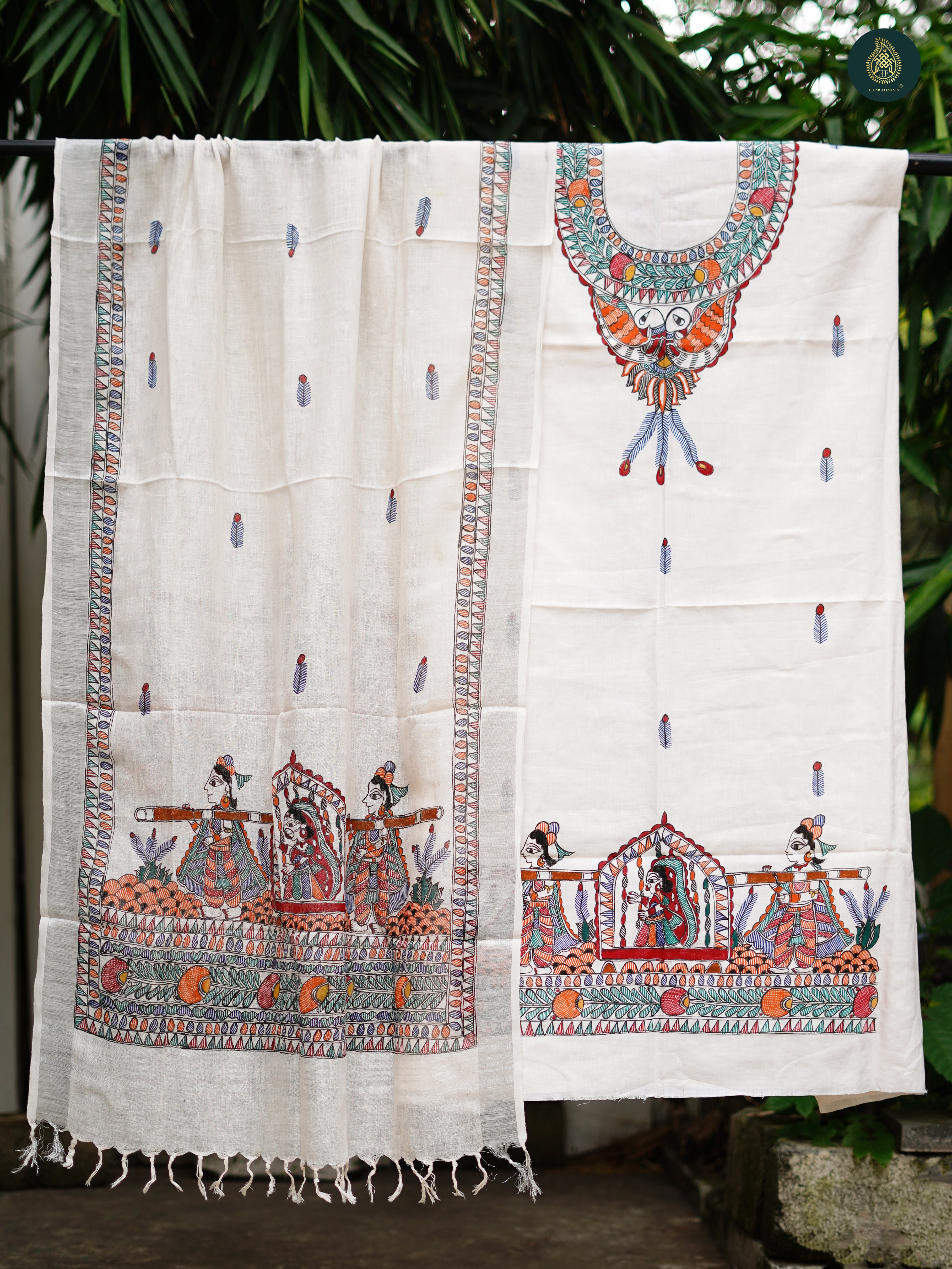 Dupatta- Featuring authentic Madhubani work, with intricate hand-painted designs and natural dyes, bringing timeless artistry to your look