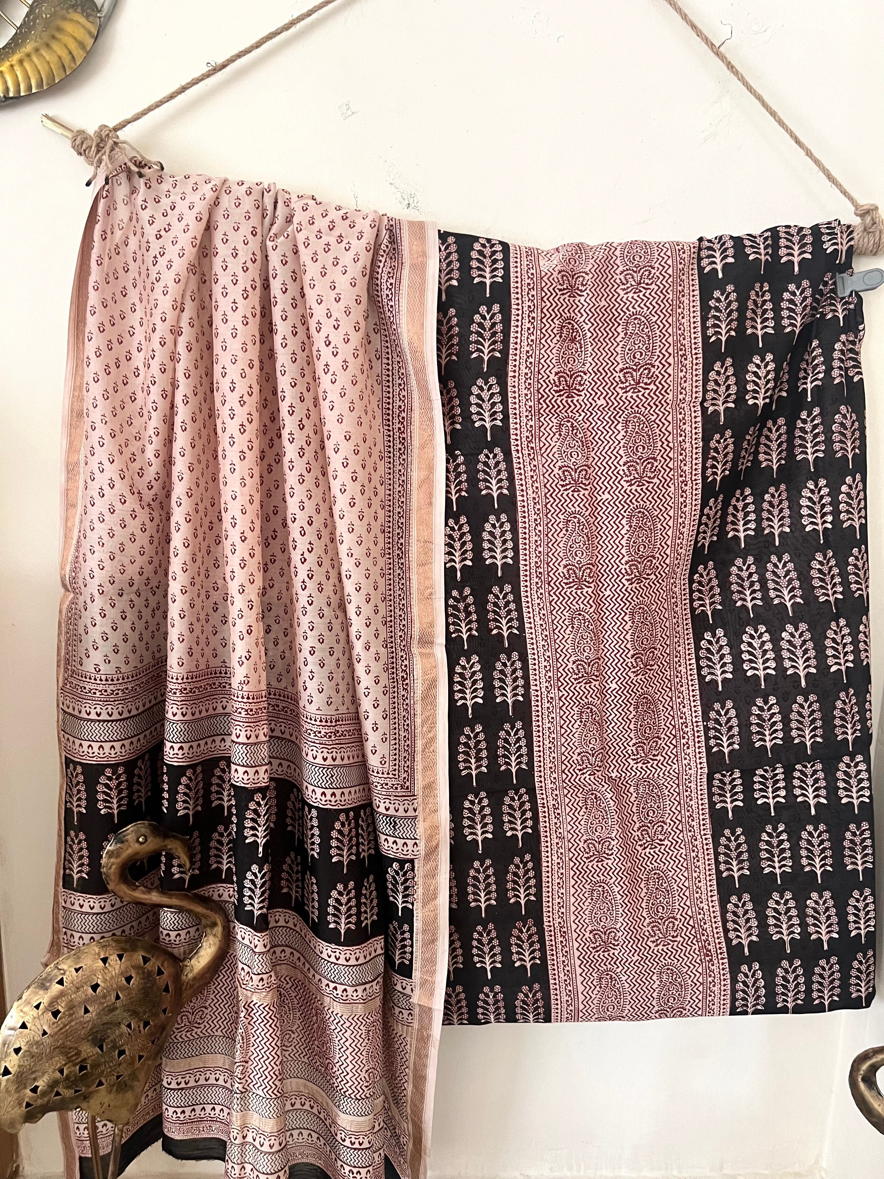 Maheshwari suit set with Bagh print. The kurta and dupatta are naturally dyed with Bagh print on them. The dupatta has tissue border. This is a 3-Pcs suit set with cotton bottoms. It is a festive wear suit set.