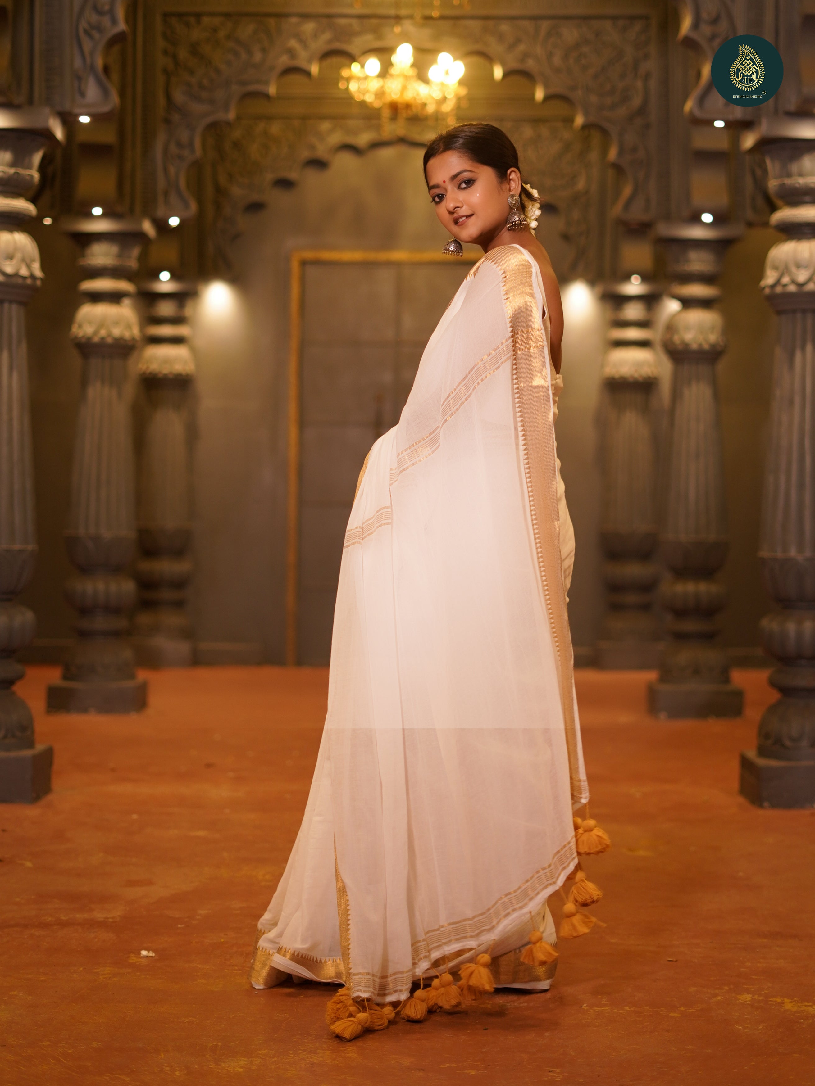 Milky White Golden Zari Stripped Mul Cotton Saree