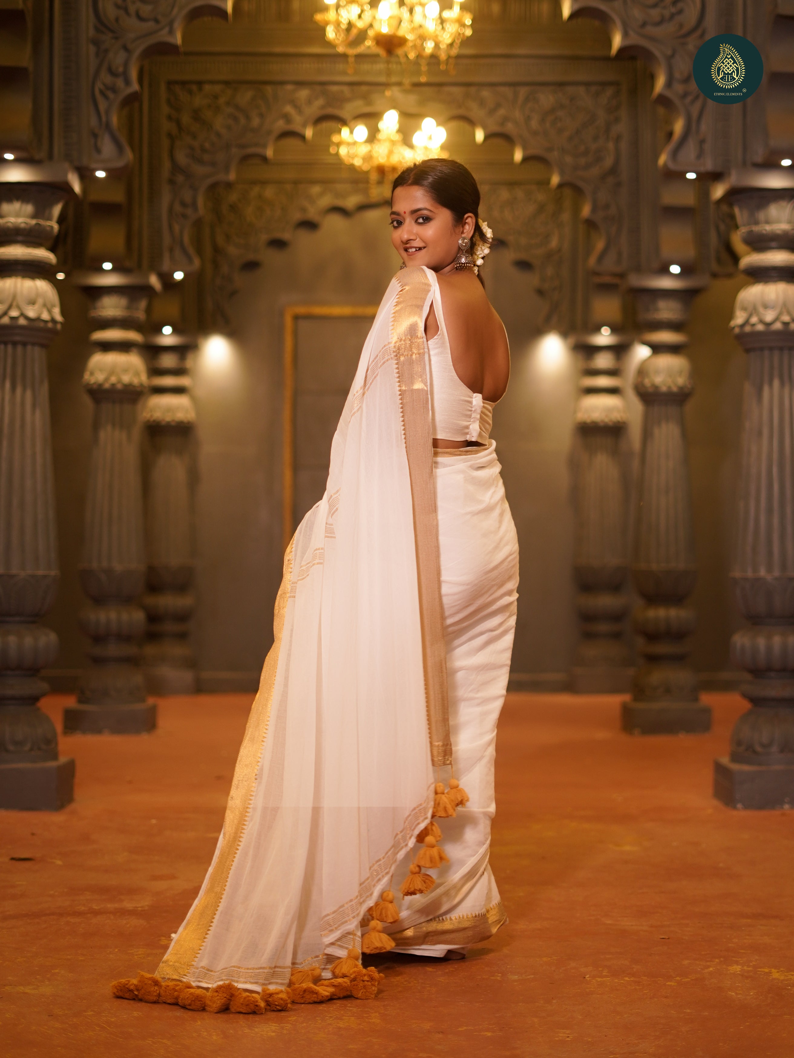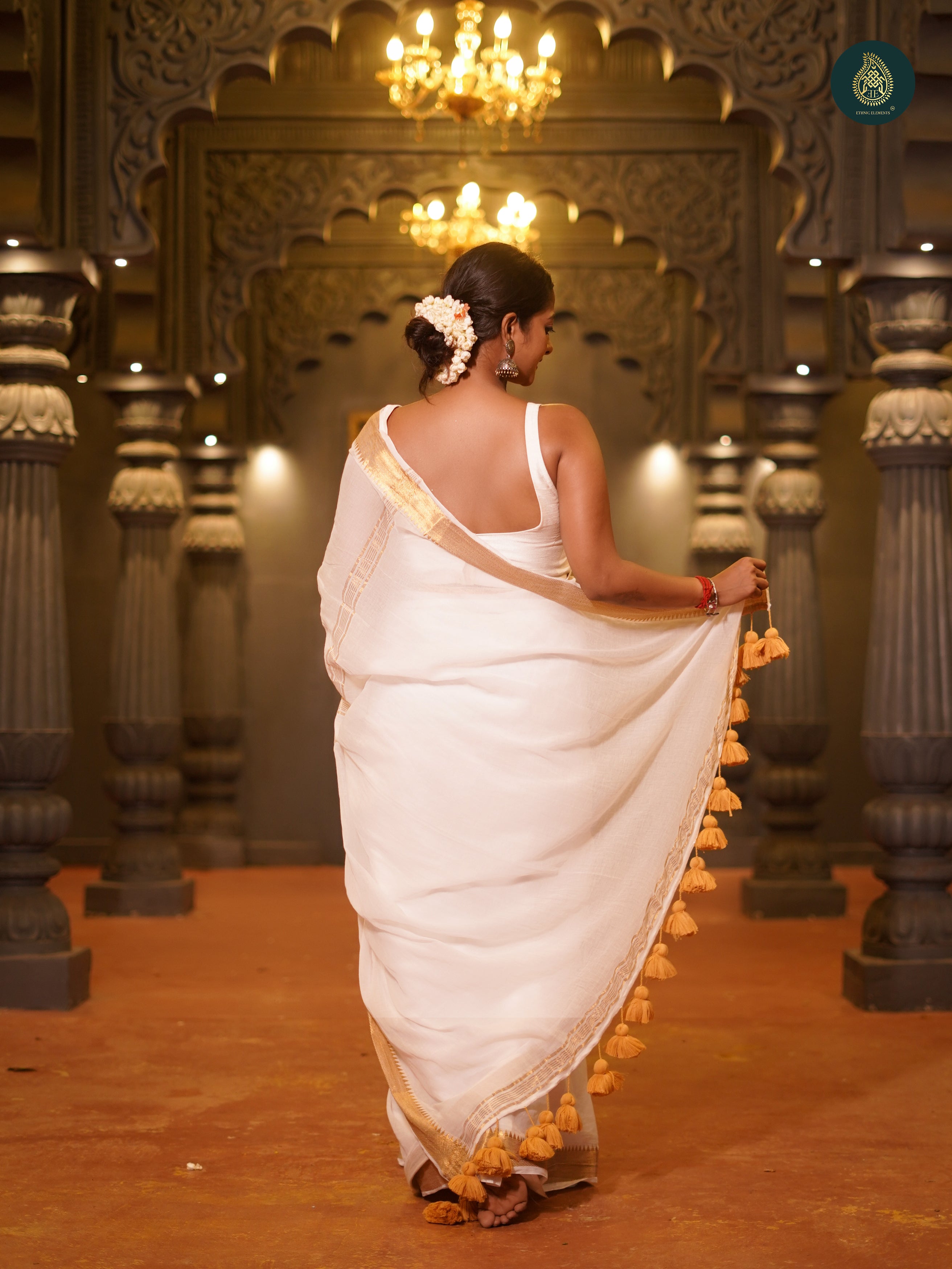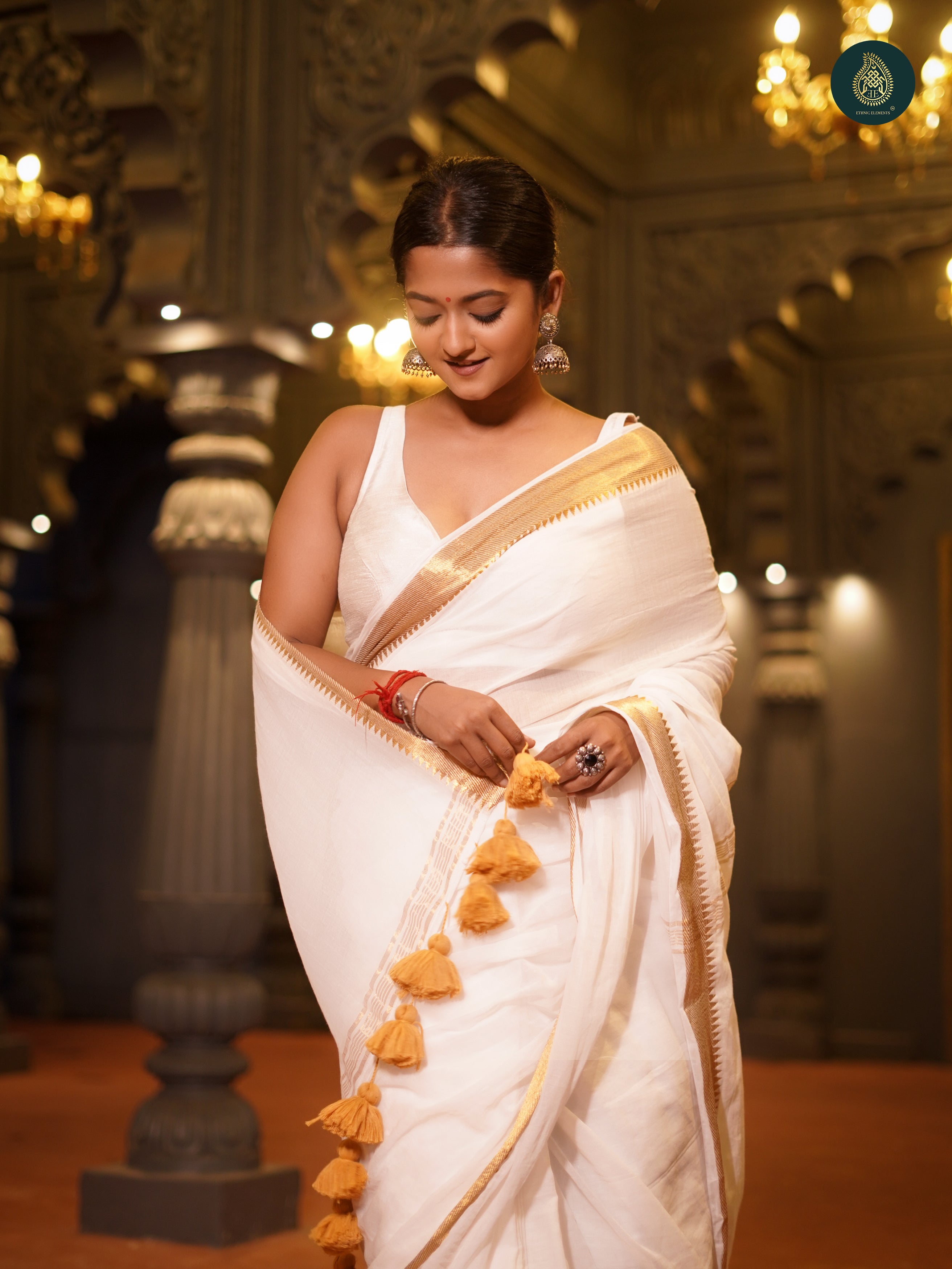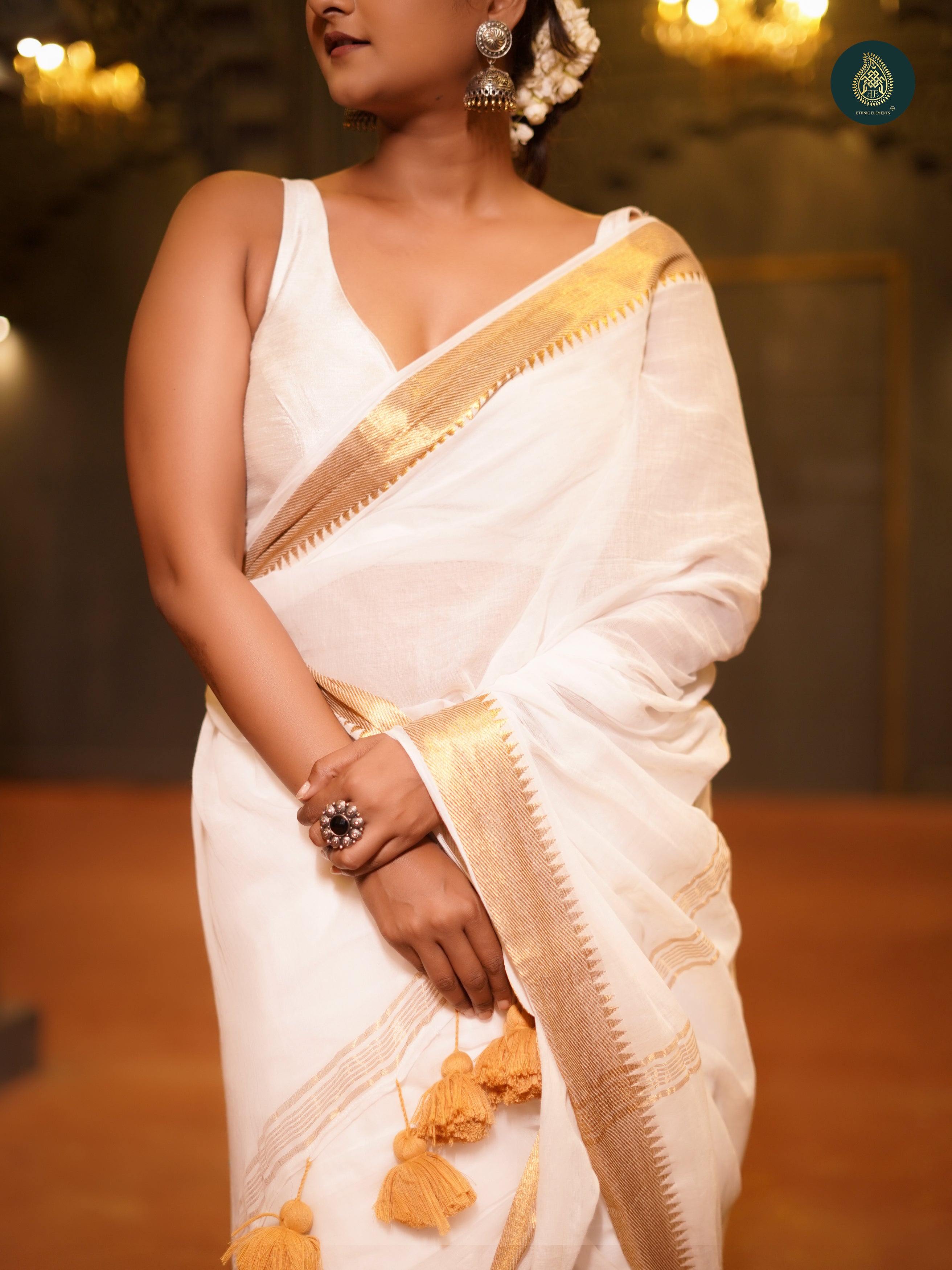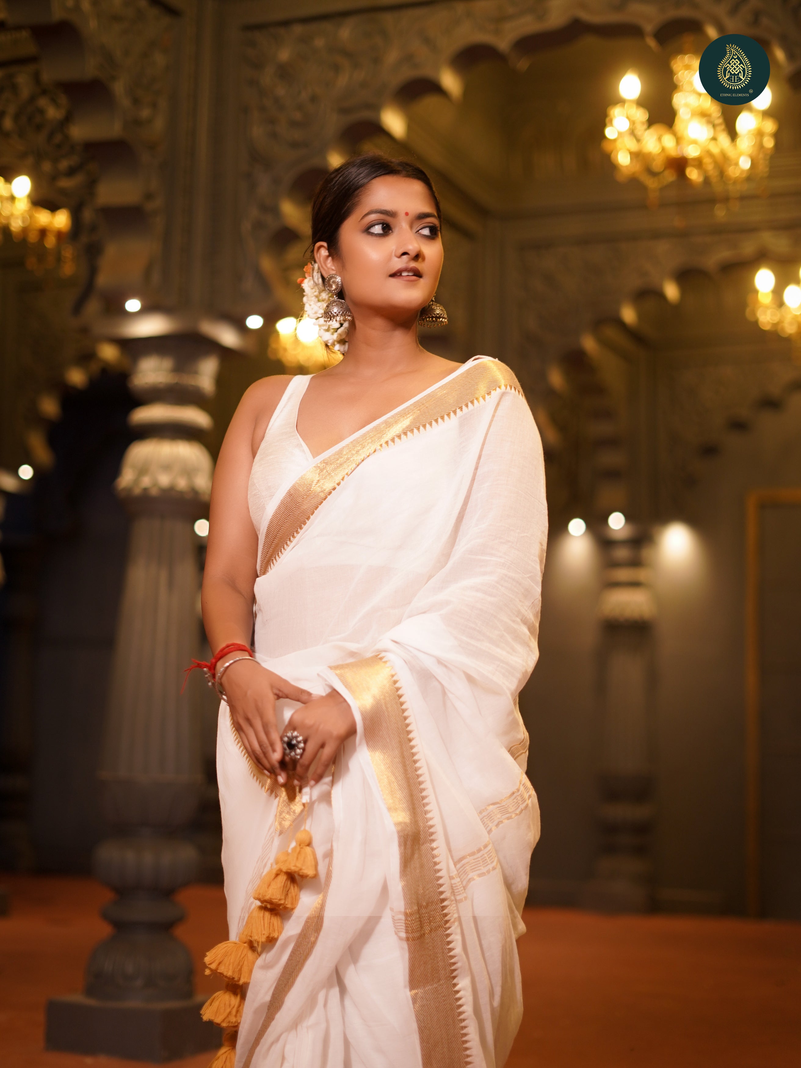 Coco White Thiruvonam Mul Cotton Solid Saree