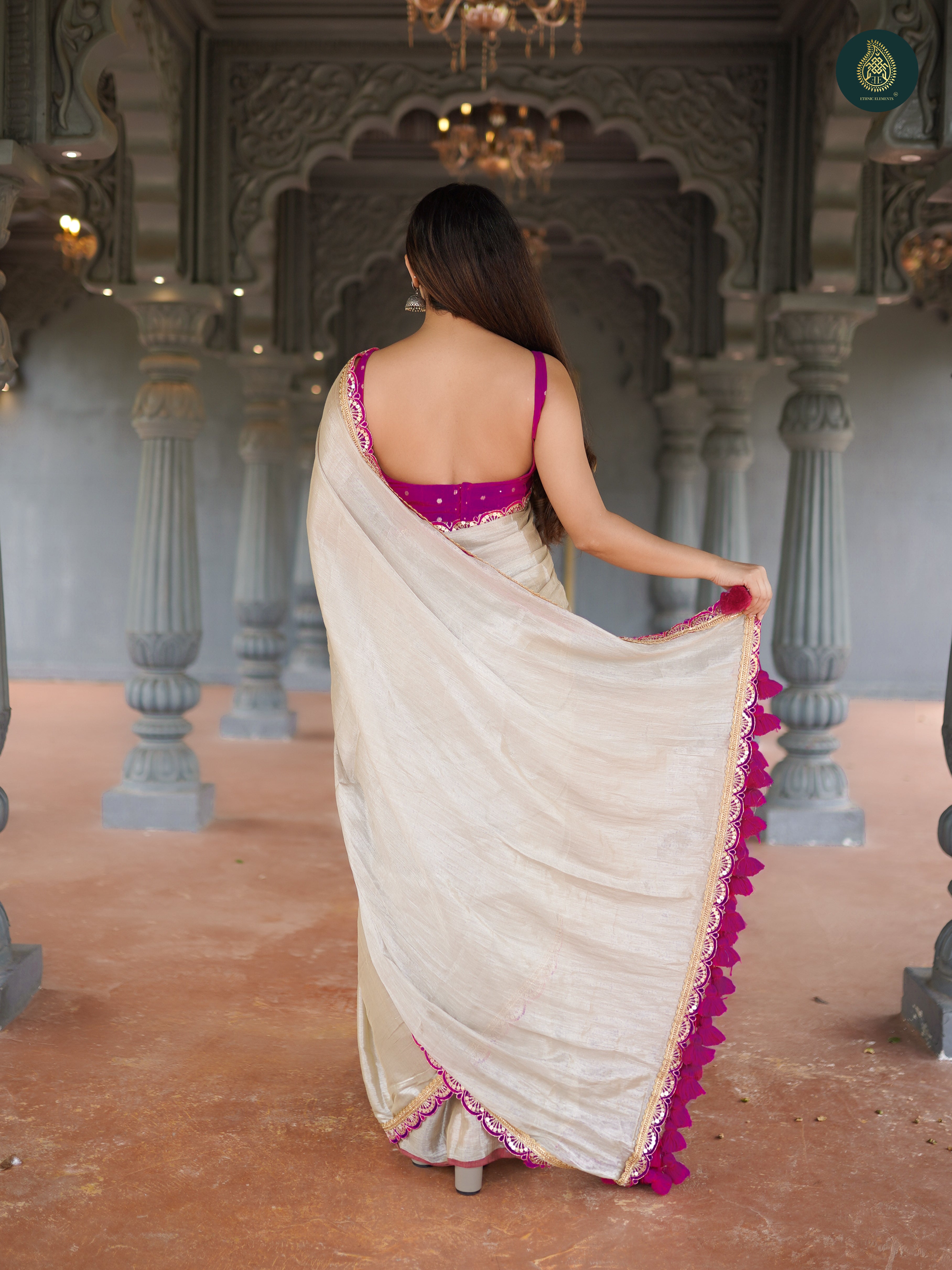 Crushed Tissue Saree with Crossstitched Embroidery – Gulnar Pink