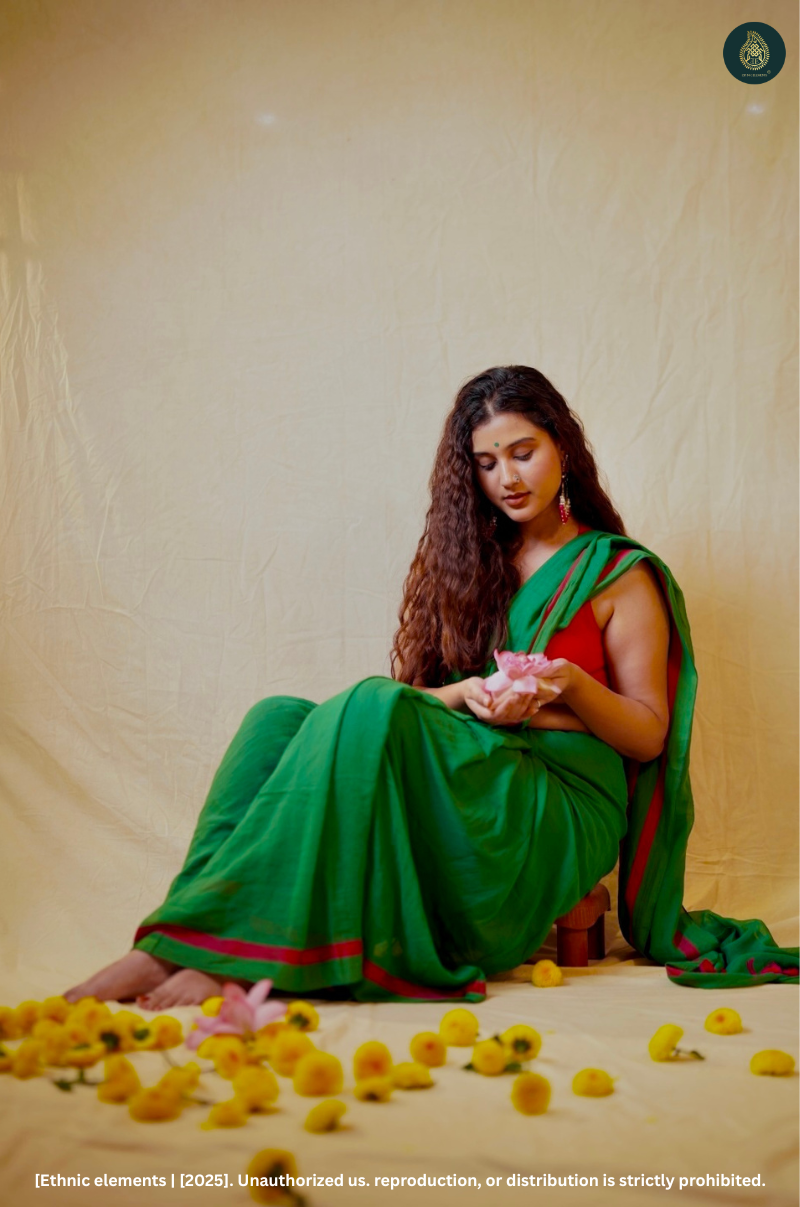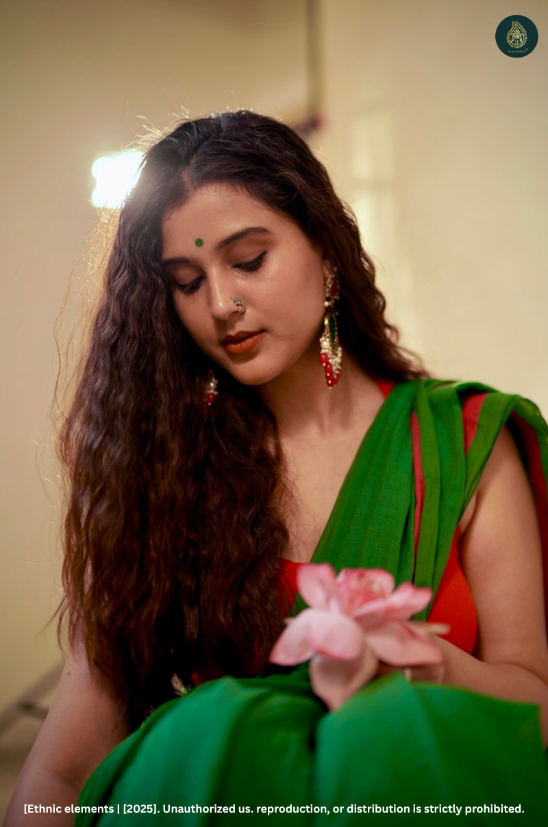 Style it with a gold zari blouse, bold green bangles, and jasmine in your hair. Ideal for intimate pujas or mehendi ceremonies.