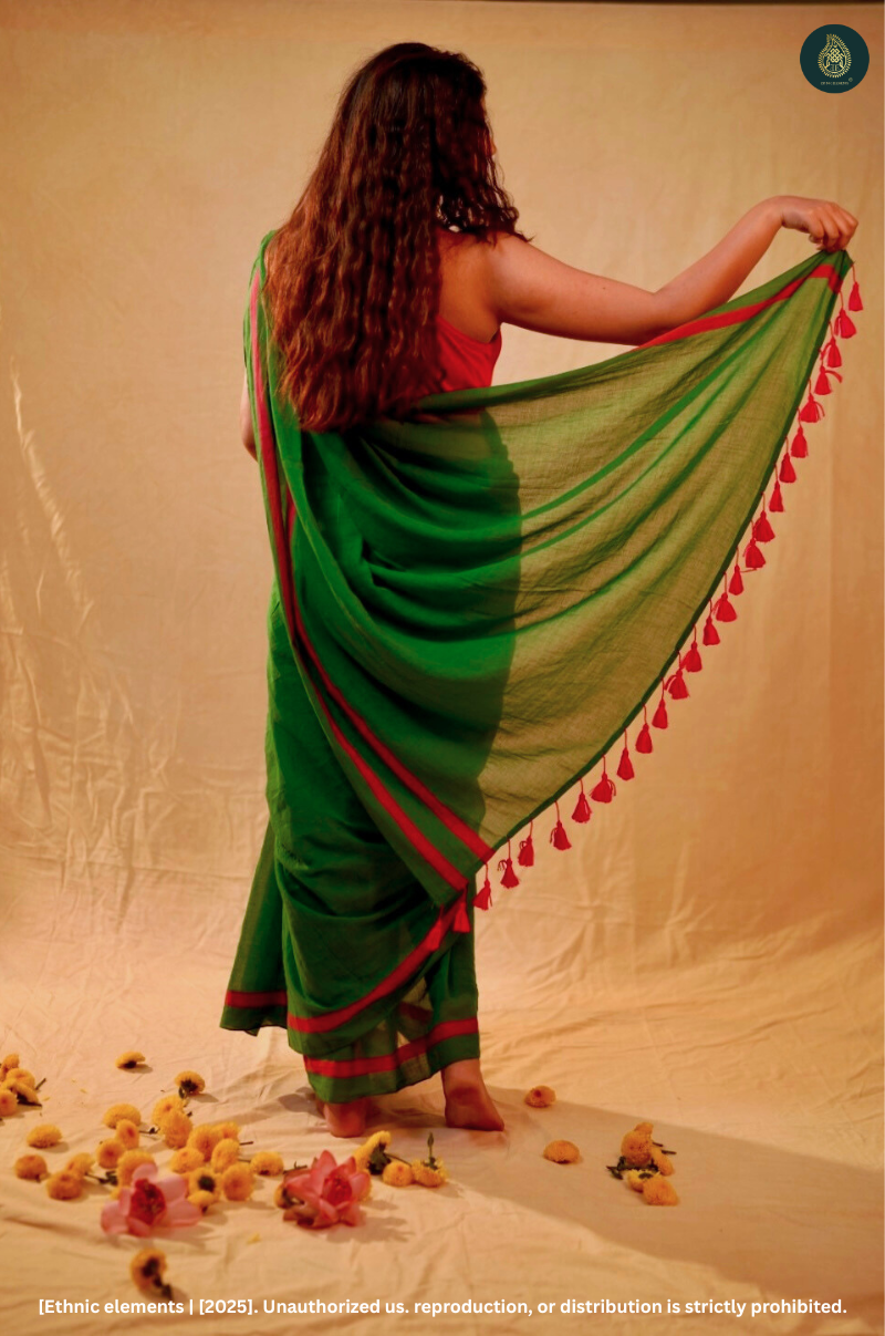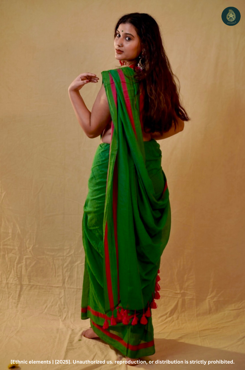 A refreshing splash of green softened with pink edges—this saree is as soothing as a walk through monsoon fields. Handwoven in buttery mul cotton, it features a parrot green body with deep pink striped borders and playful pink tassels on the pallu. Minimal yet spirited, it’s the kind of saree that speaks without saying too much.