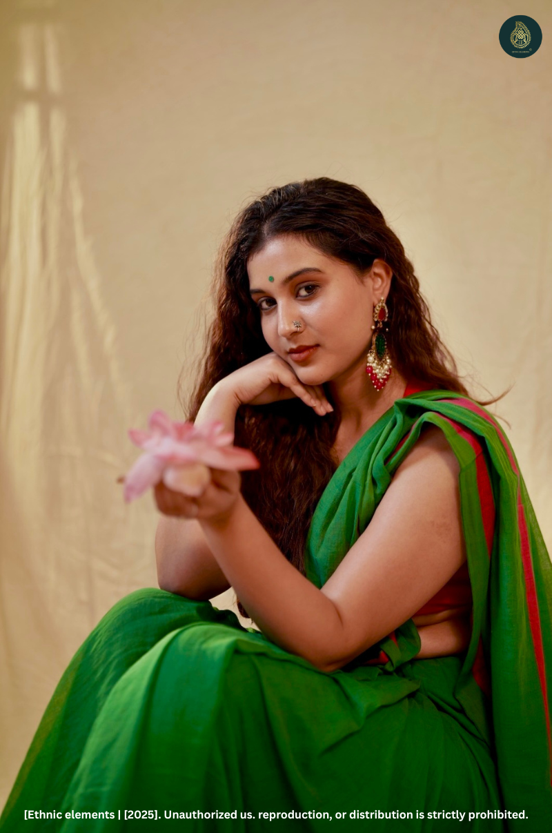 Pair with a matching green blouse or a pink khadi top. Add silver studs, a low bun, and a cotton tote for a fresh everyday look.
