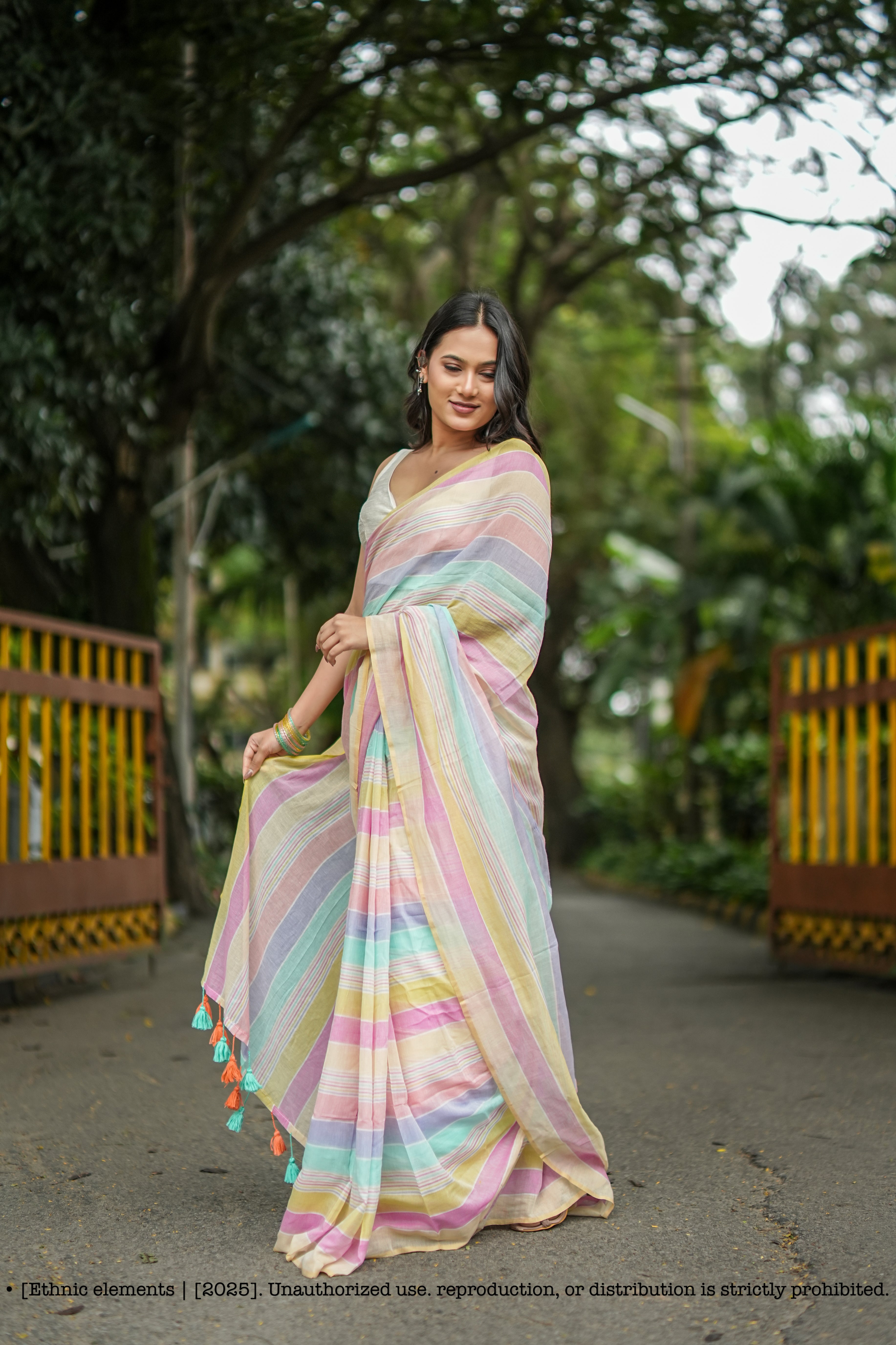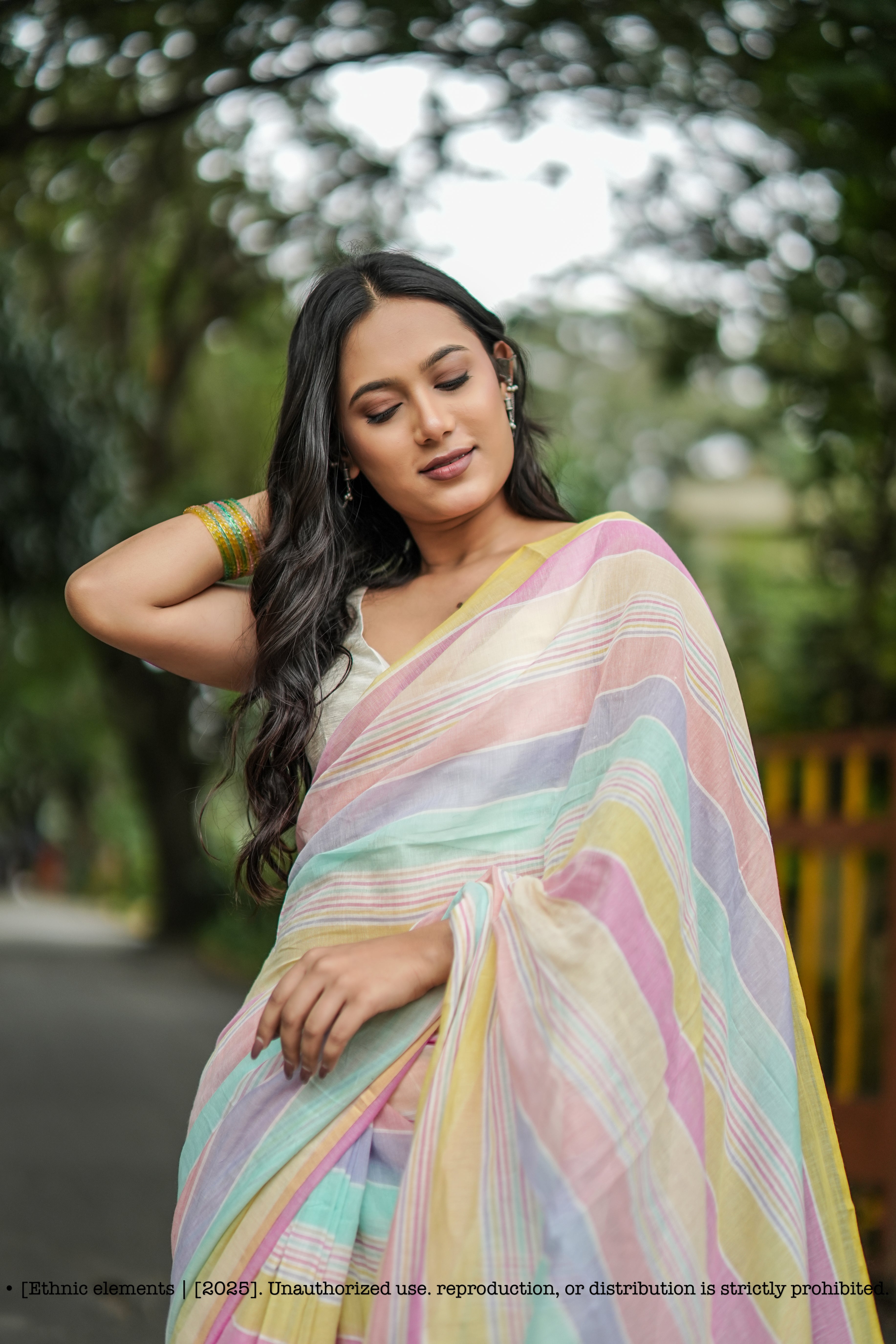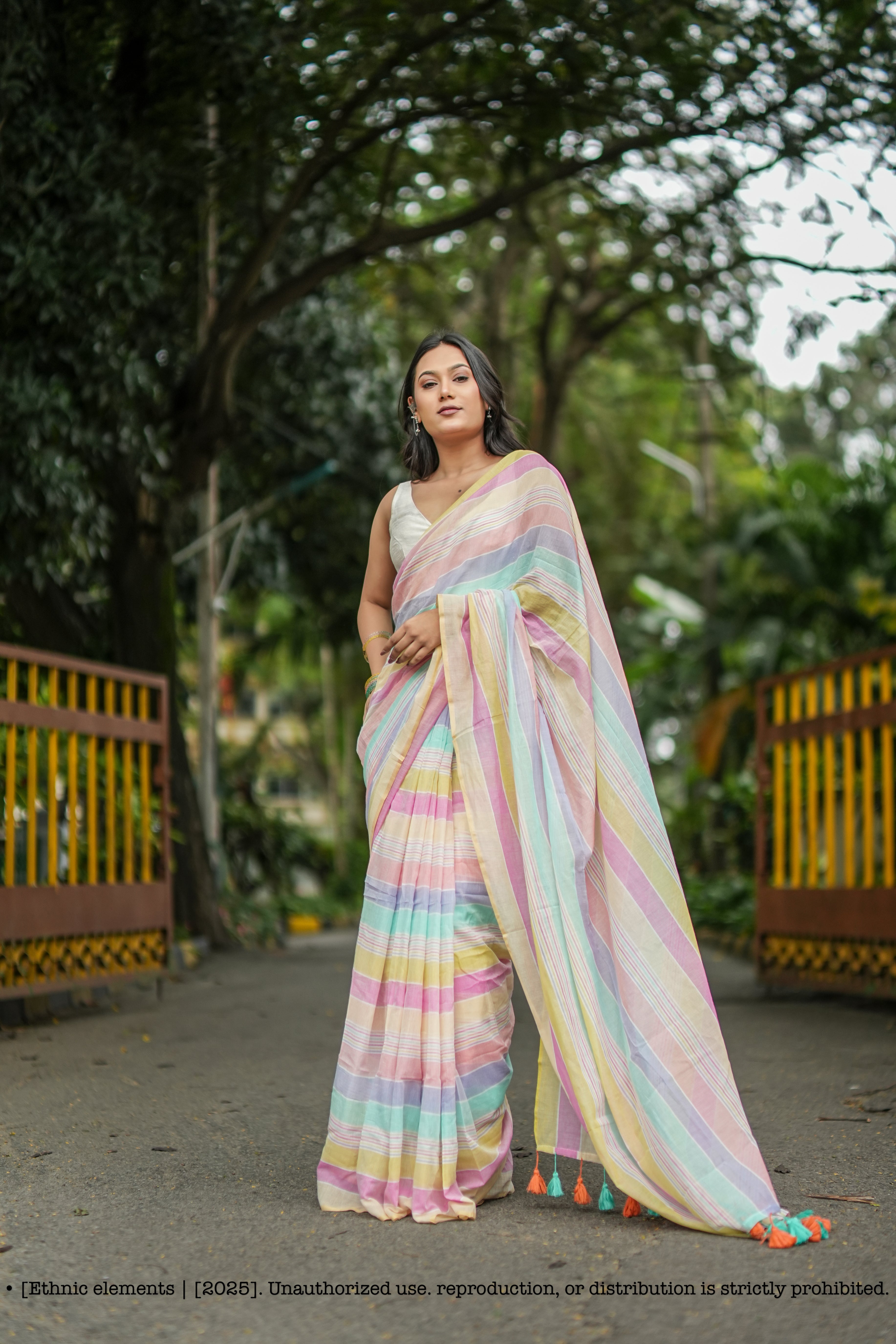 A burst of joy in every thread. This handwoven mul cotton saree brings together a pastel rainbow of stripes—peach, mint, lemon, lavender, and blush—reminding you of summer skies and ice-cold sorbet. Finished with candy-hued tassels on the pallu, it's playful without trying too hard.