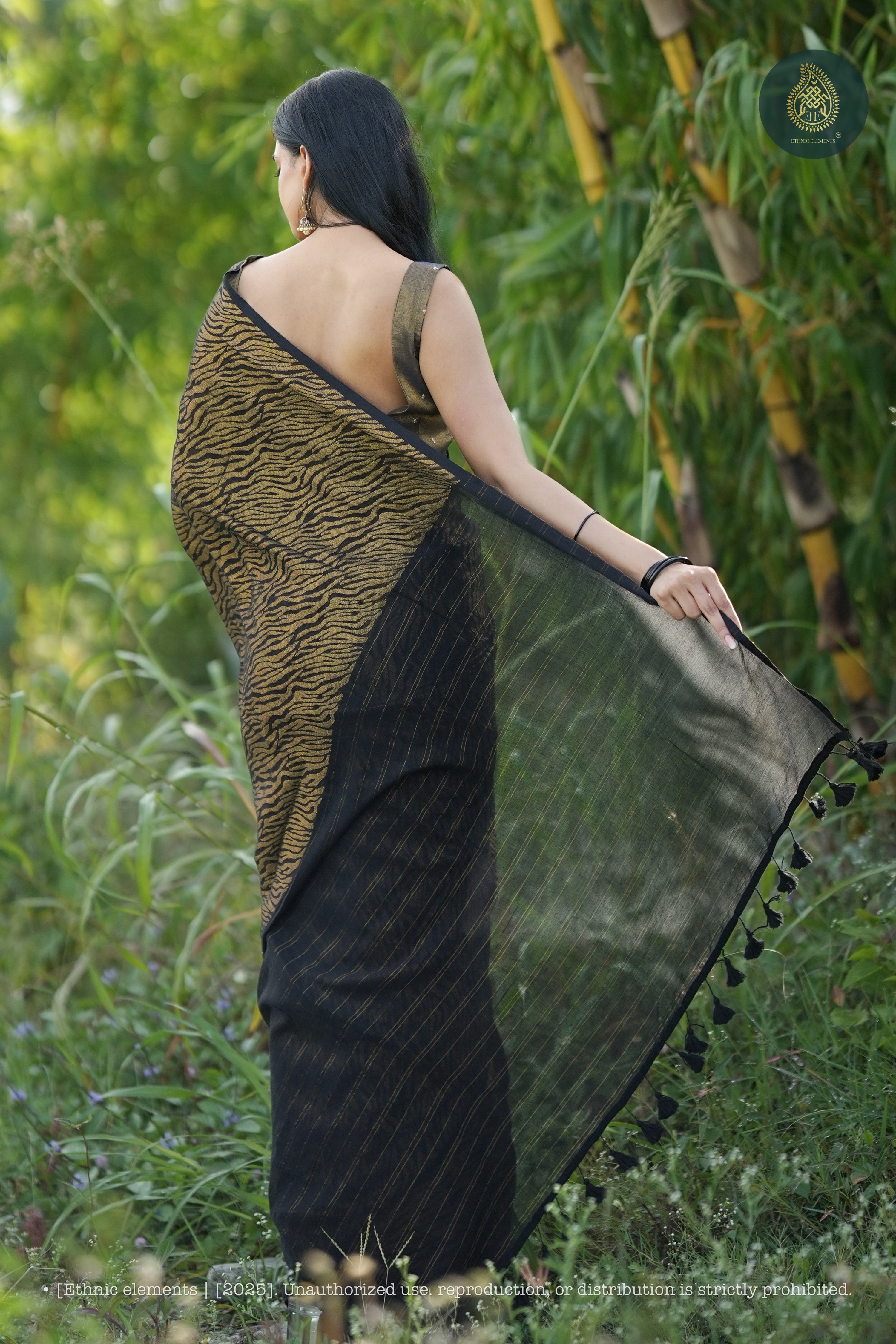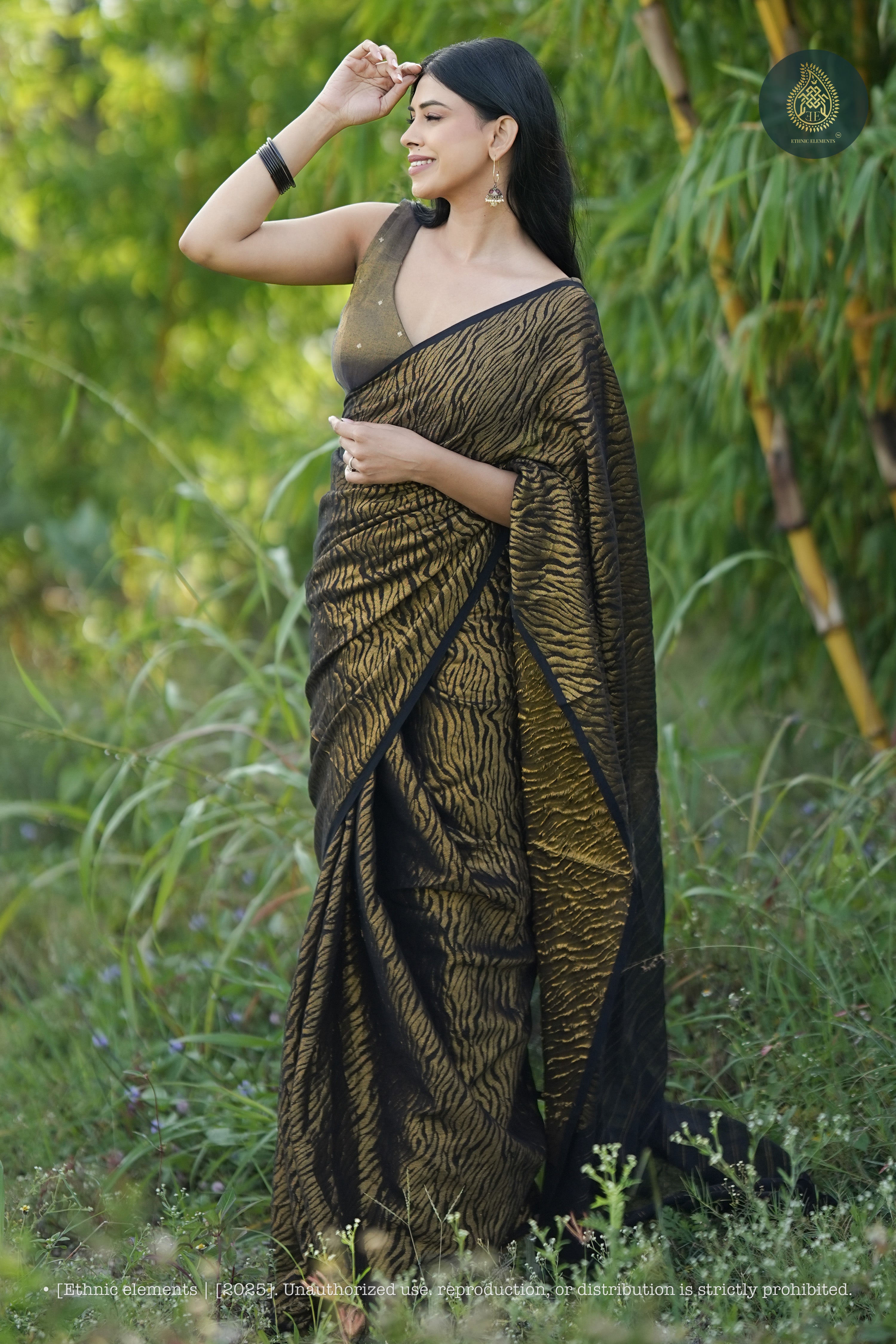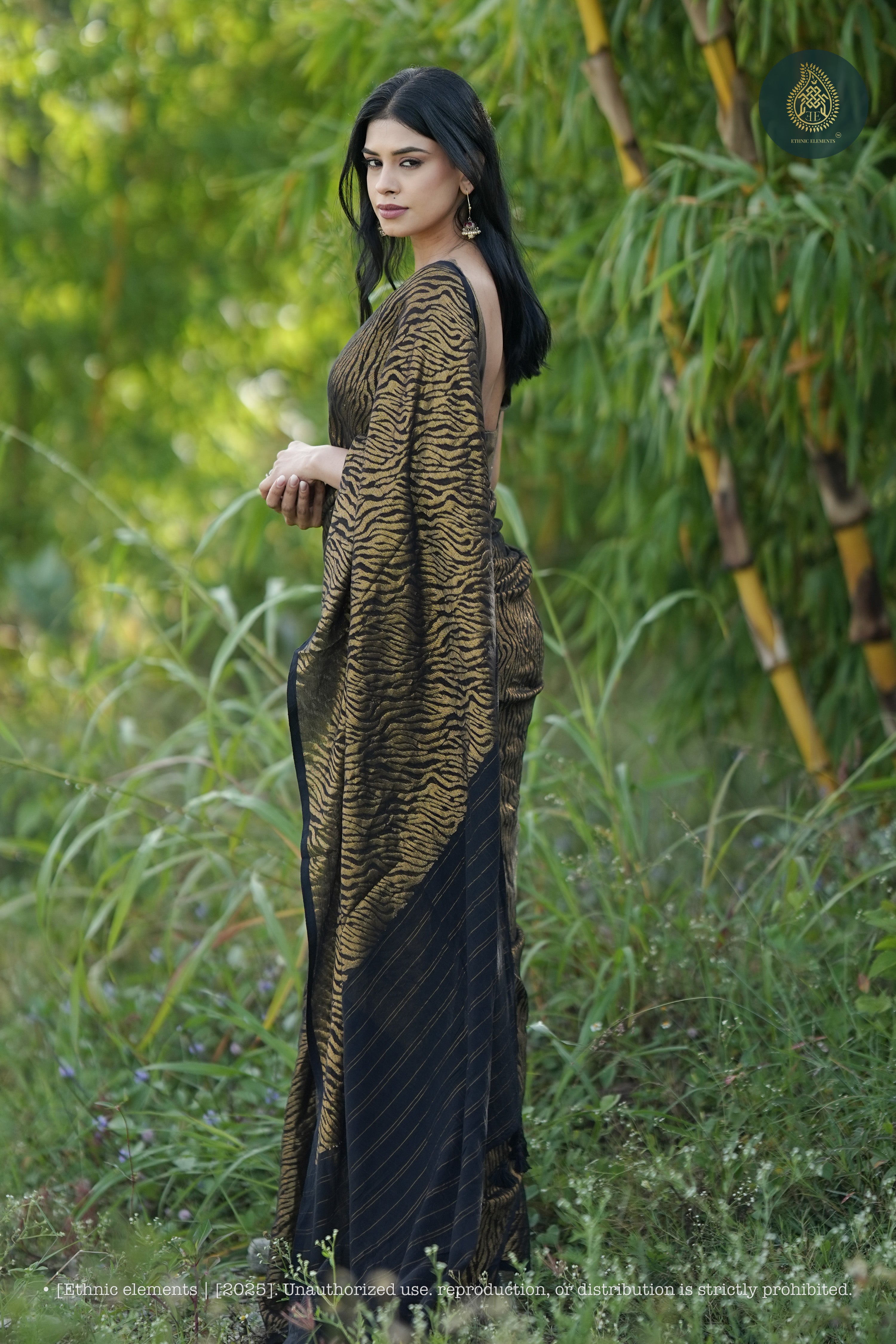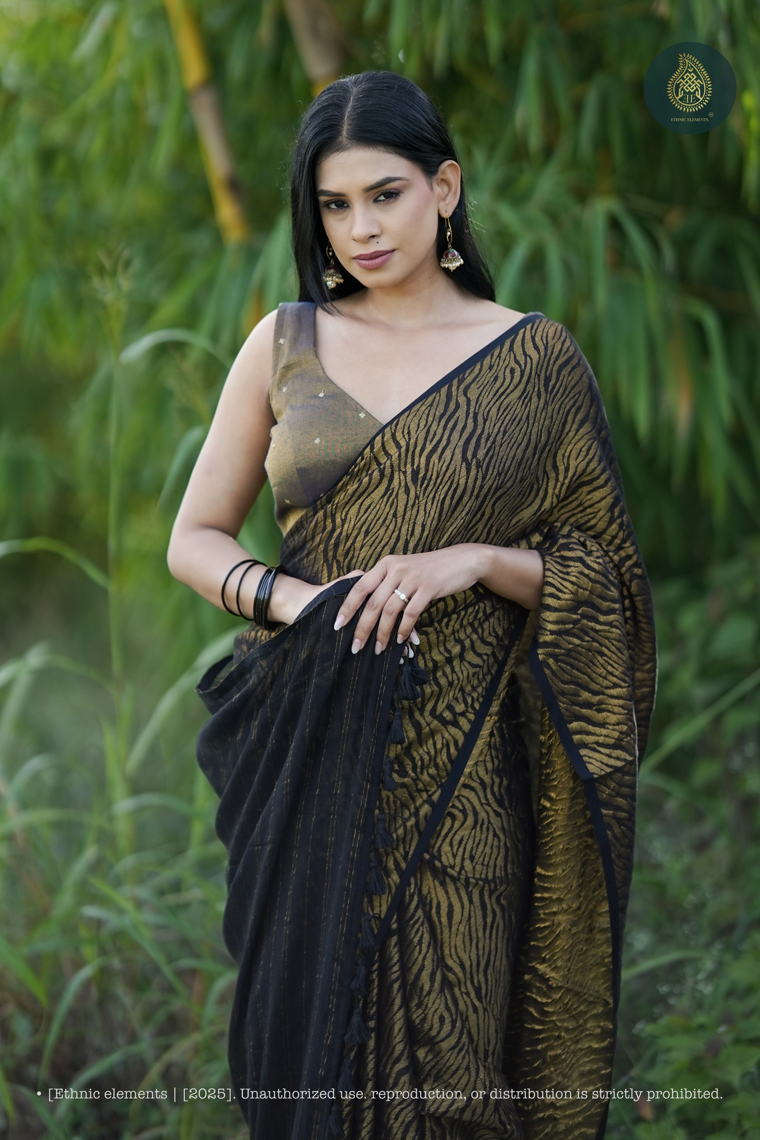 Draped in timeless elegance, the Midnight Muse Saree blends earthy sophistication with a touch of bold allure. Crafted in a deep black base with muted golden streaks inspired by nature’s textures, this saree exudes understated glamour. Its soft, fluid fabric falls beautifully, enhancing every movement with grace. Perfect for evening gatherings and festive occasions, it’s a statement in quiet luxury.