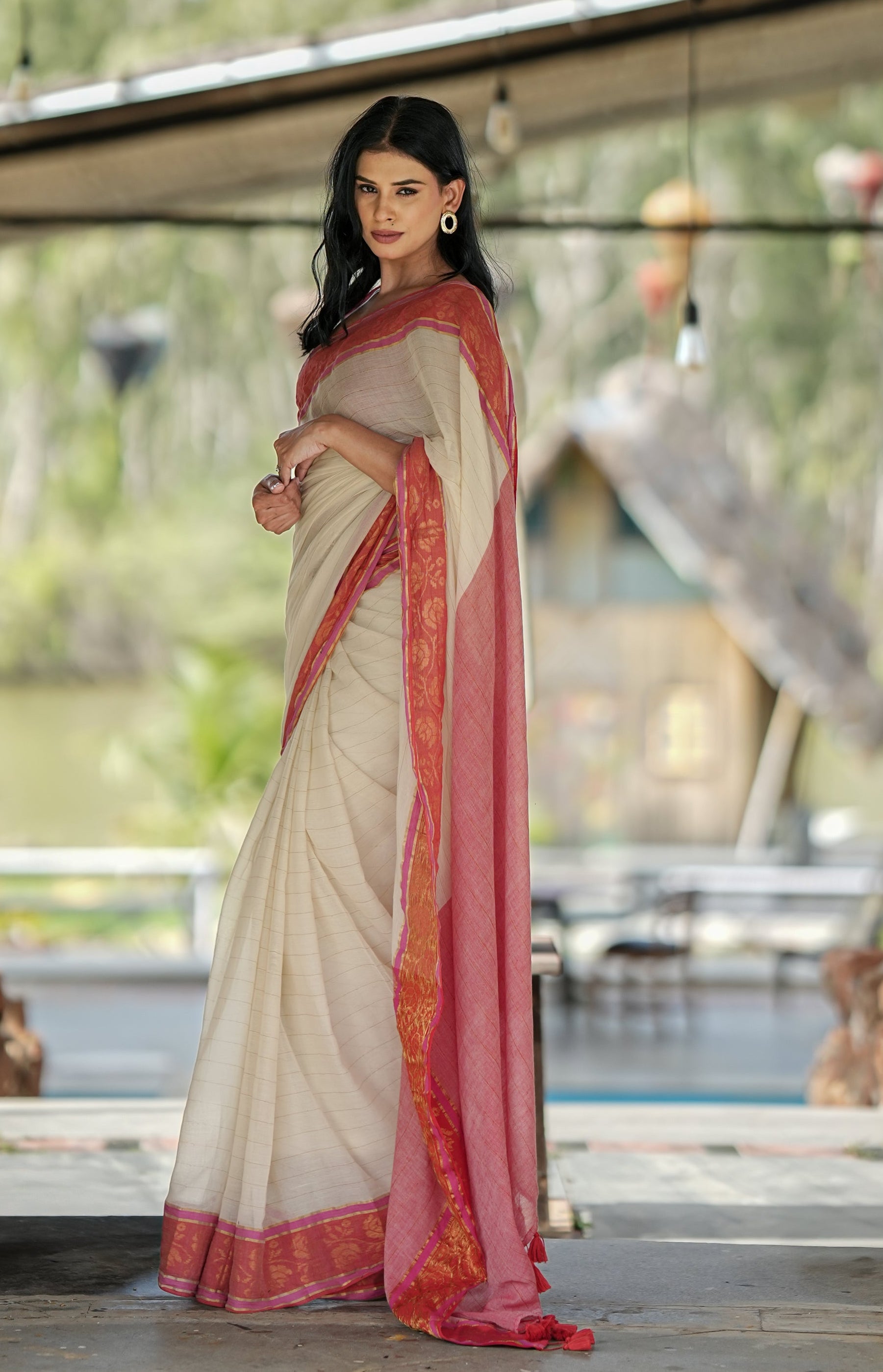 Step into timeless elegance with this exquisite ivory saree, its serene base brought to life by a vibrant reddish-pink zari border. The delicate shimmer of zari adds a festive glow, making it a piece that celebrates both tradition and grace. Classic yet versatile, this saree is perfect for weddings, festive gatherings, or when you simply wish to embody understated grandeur.