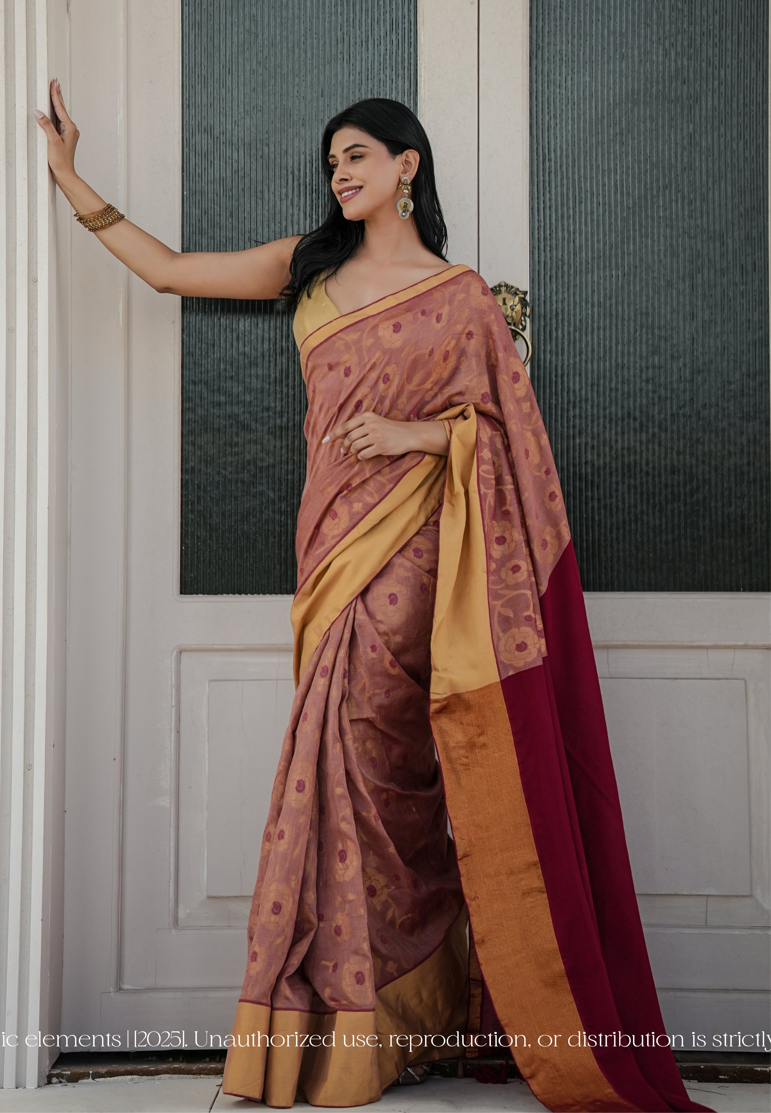 A saree woven in rose-tinted nostalgia, with borders dipped in gold and evenings marooned in memory.
