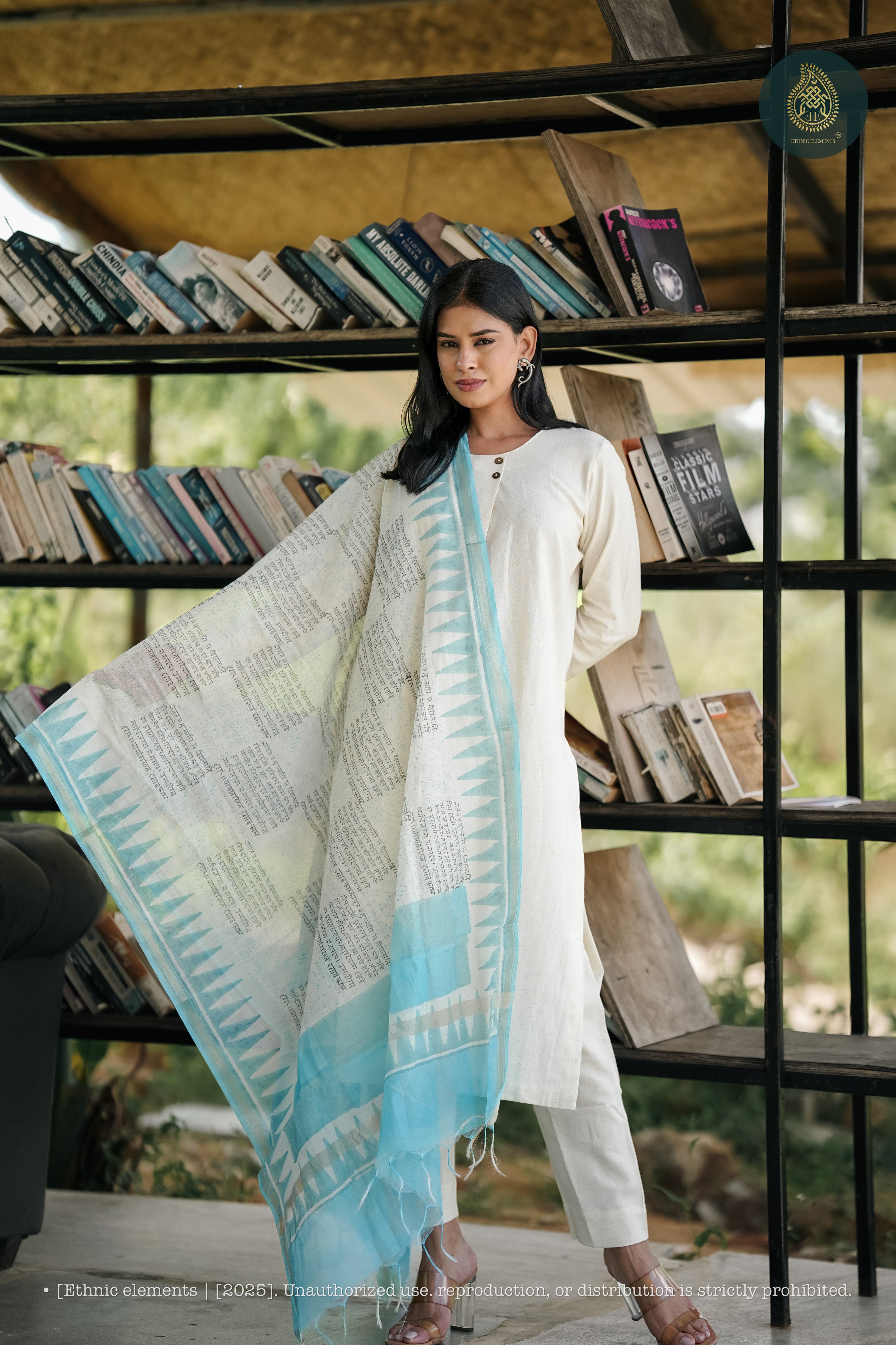 Dupatta: Cotton hand block printed dupatta featuring authentic written motifs bordered with a soft blue print — a tribute to traditional artistry