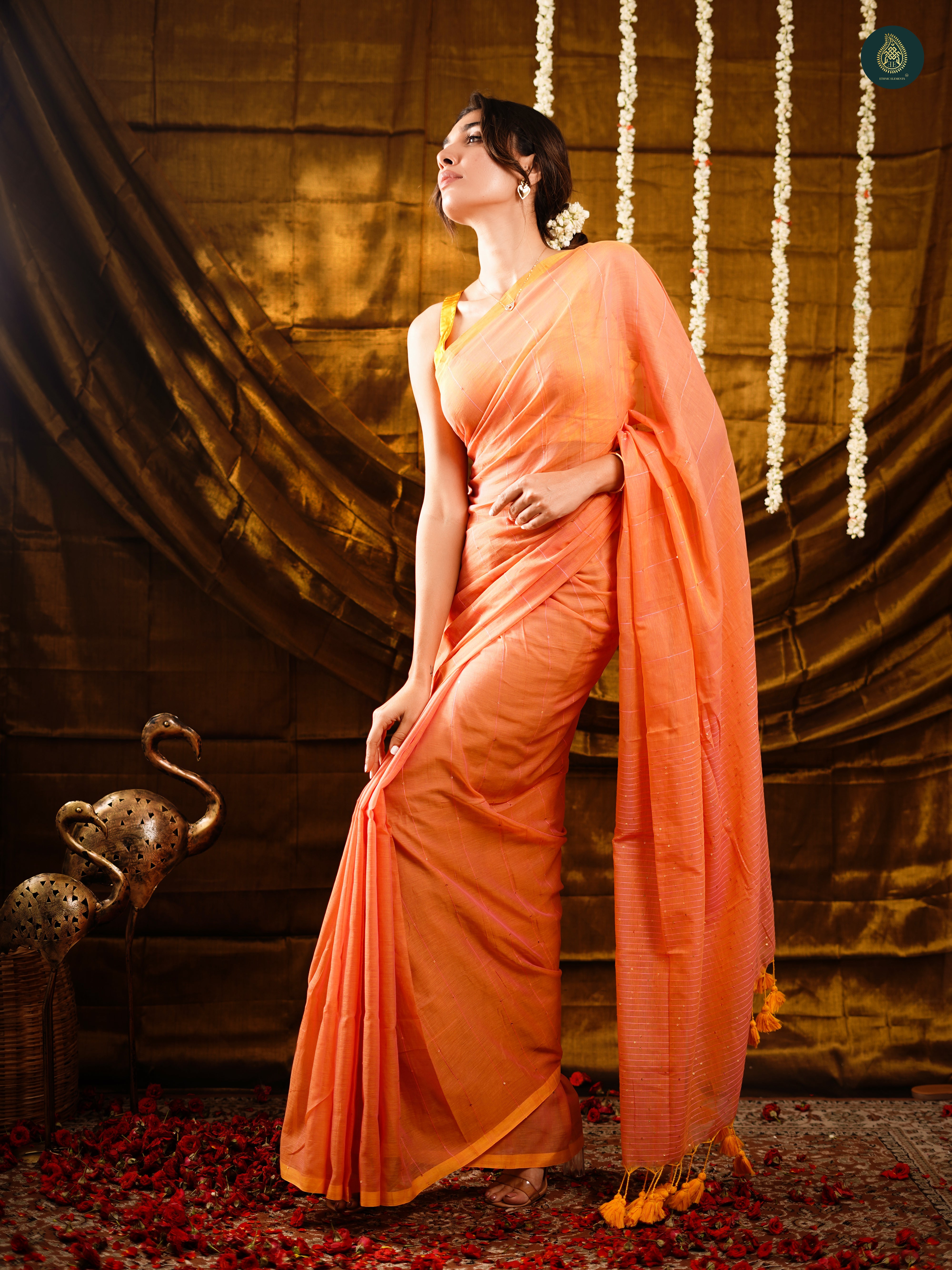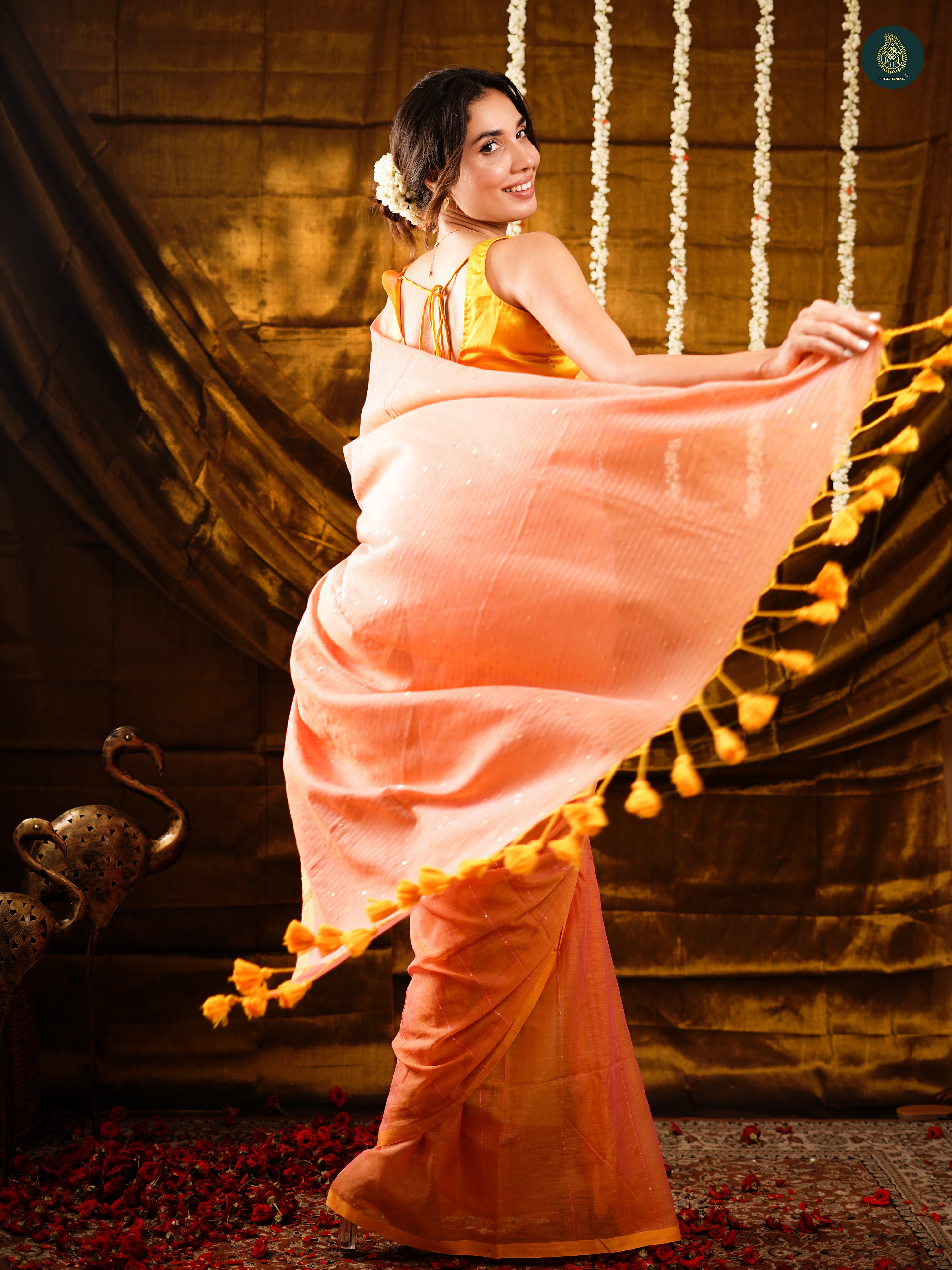 Indulge in the regal charm of our pure Mul cotton Sequence designer saree, expertly woven with meticulous precision using the traditional Jonaki weaving technique, and adorned with opulent handmade tassels on the pallu. Jonaki weaving is a heritage technique known for its intricate craftsmanship, adding a unique layer of refinement and cultural significance to the saree. This technique plays a vital role in preserving traditional artistry, making each saree not only a fashion statement but a celebration of time-honored weaving heritage. Offered without a blouse piece, this exquisite saree allows you the freedom to pair it with your favorite styles. A stunning fusion of timeless artistry and modern sophistication, it embodies the essence of royal grace.