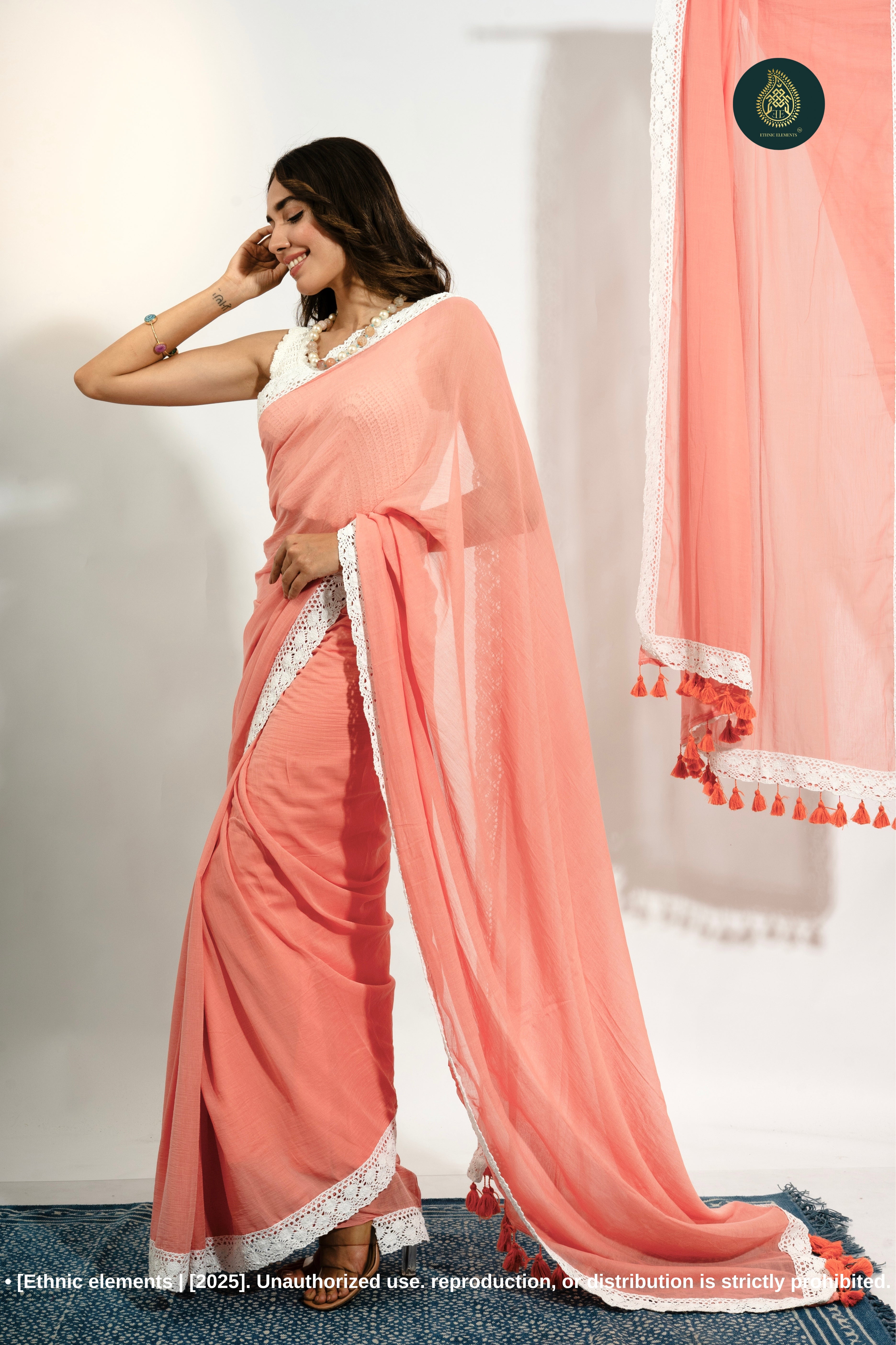 Drape yourself in effortless sophistication with our Mul Cotton Handloom Saree, thoughtfully designed for comfort and style. Crafted from lightweight, breathable cotton, this saree is perfect for the summer season, offering an airy and soft feel that ensures all-day ease. Accentuated with a delicate crochet lace border and handmade tassels, this saree blends tradition with contemporary elegance. Please note, this saree comes without a blouse.