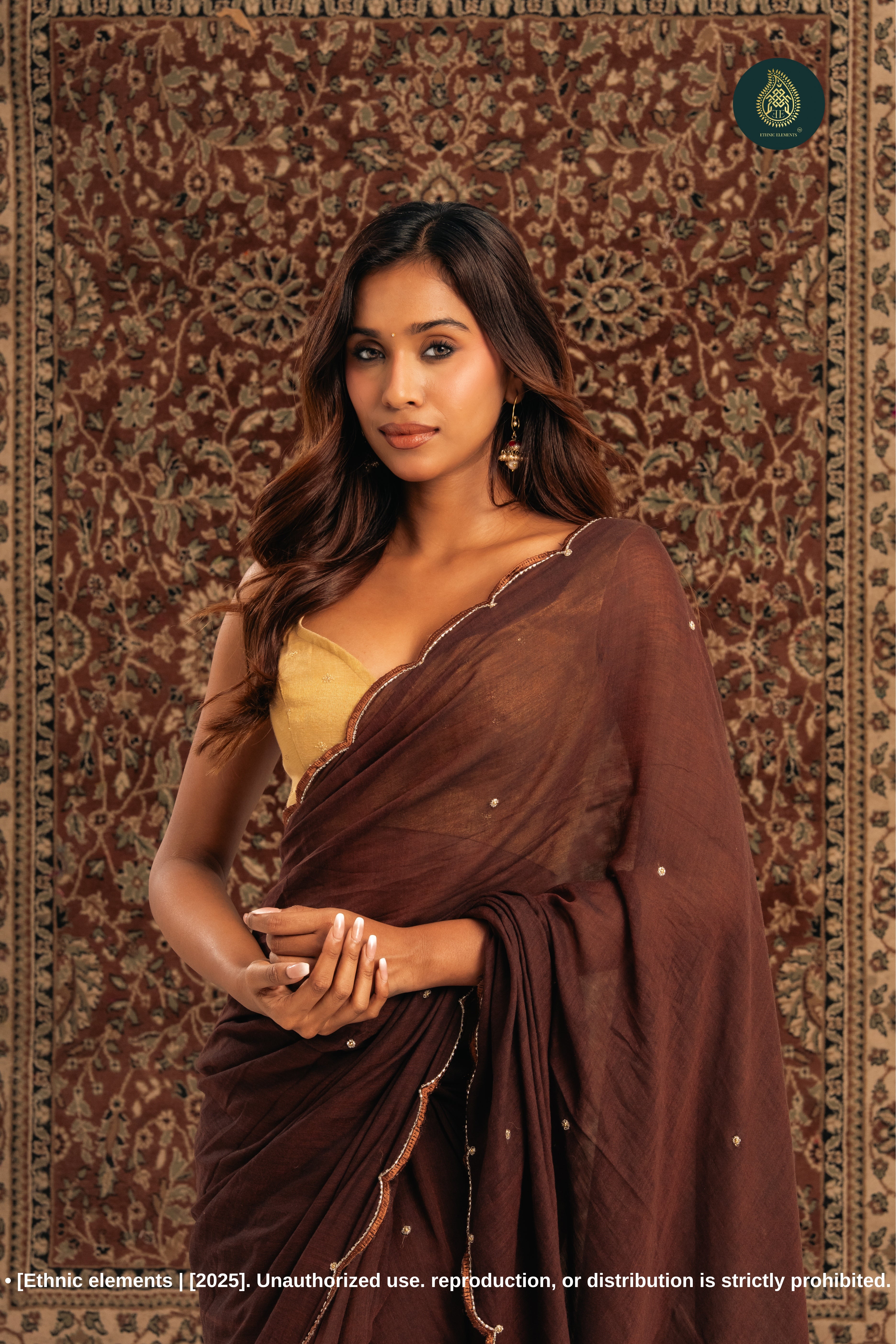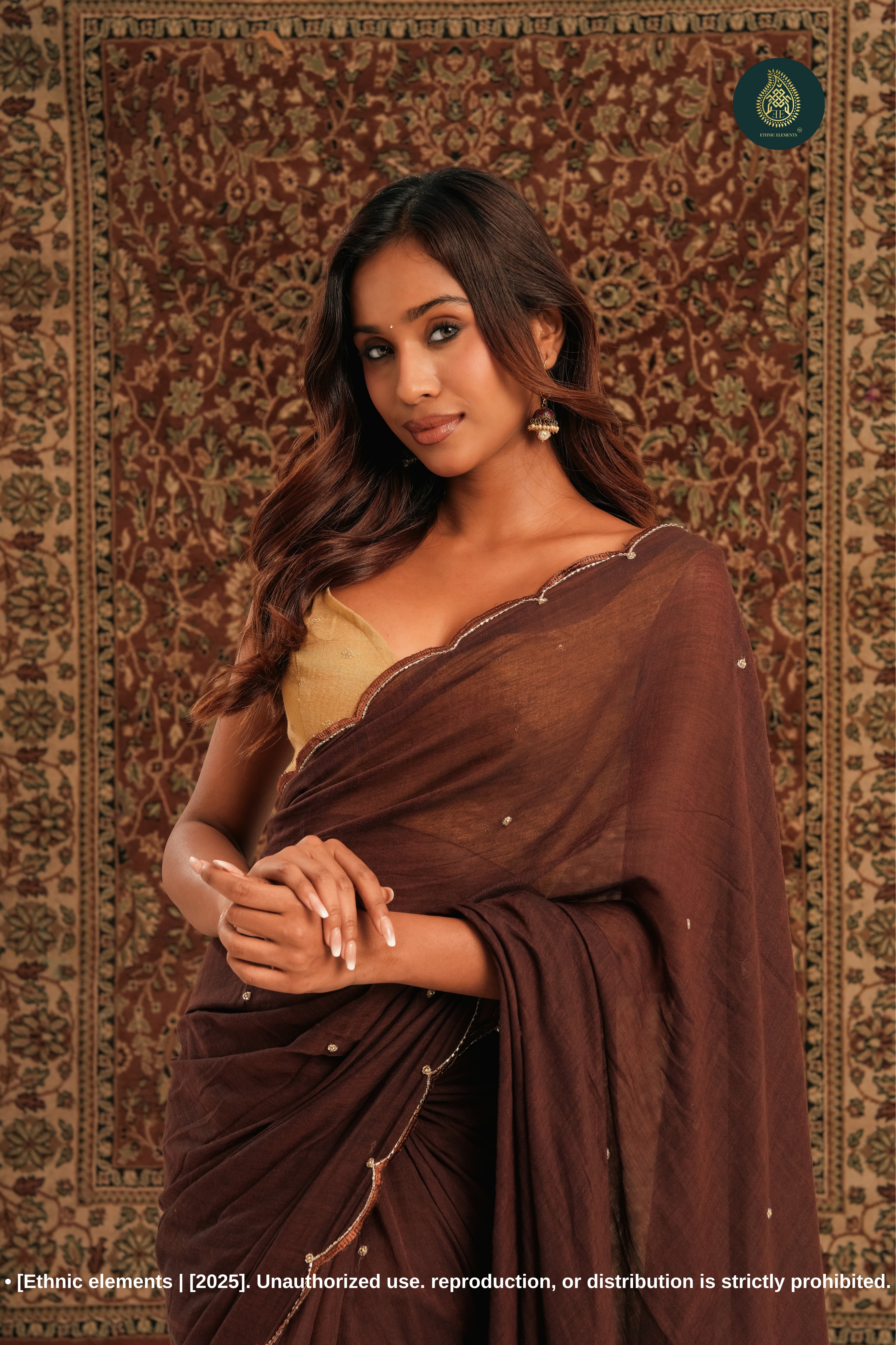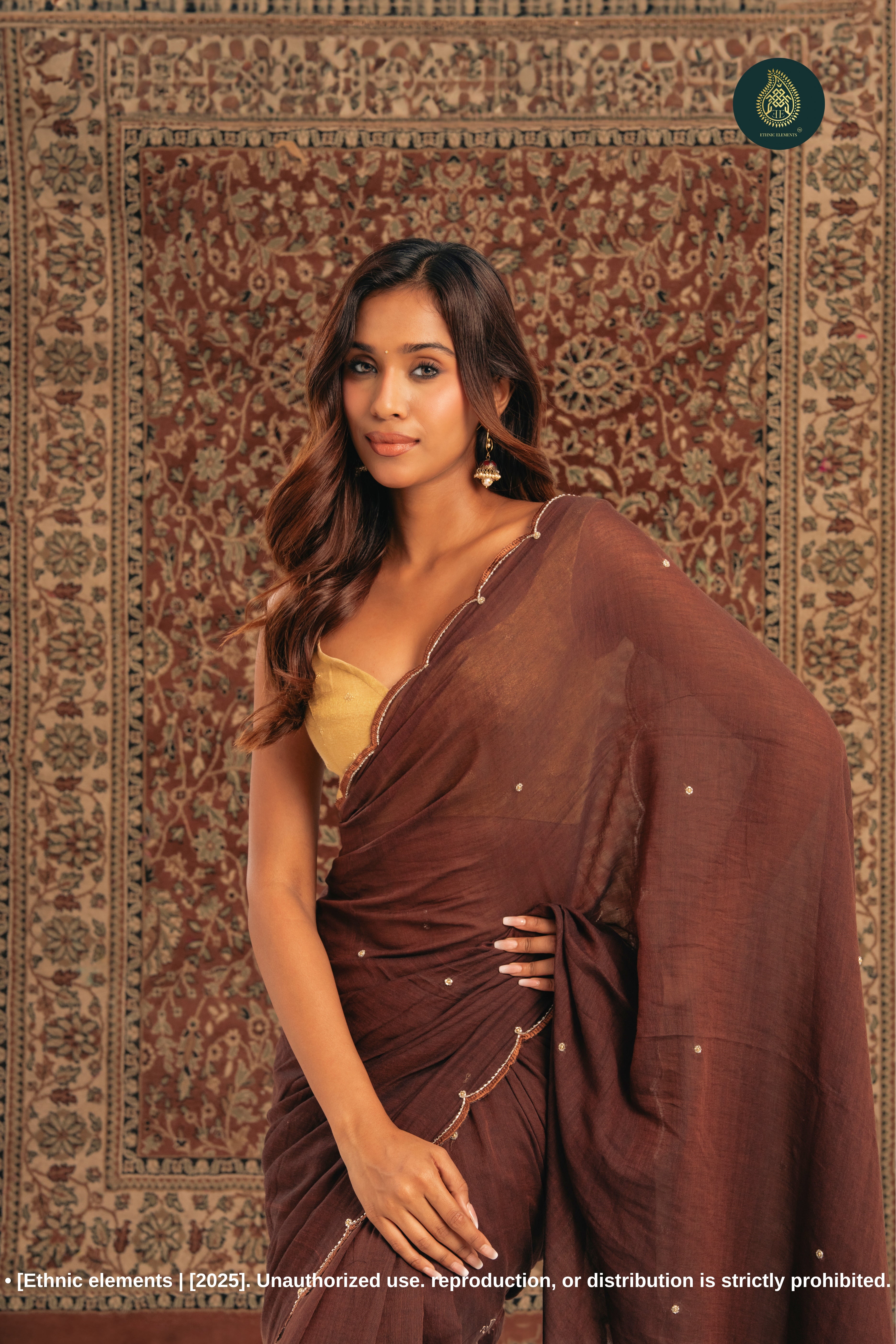 Handcrafted Zardozi & Cutdana Mul Cotton Saree - Cinnamon Brown