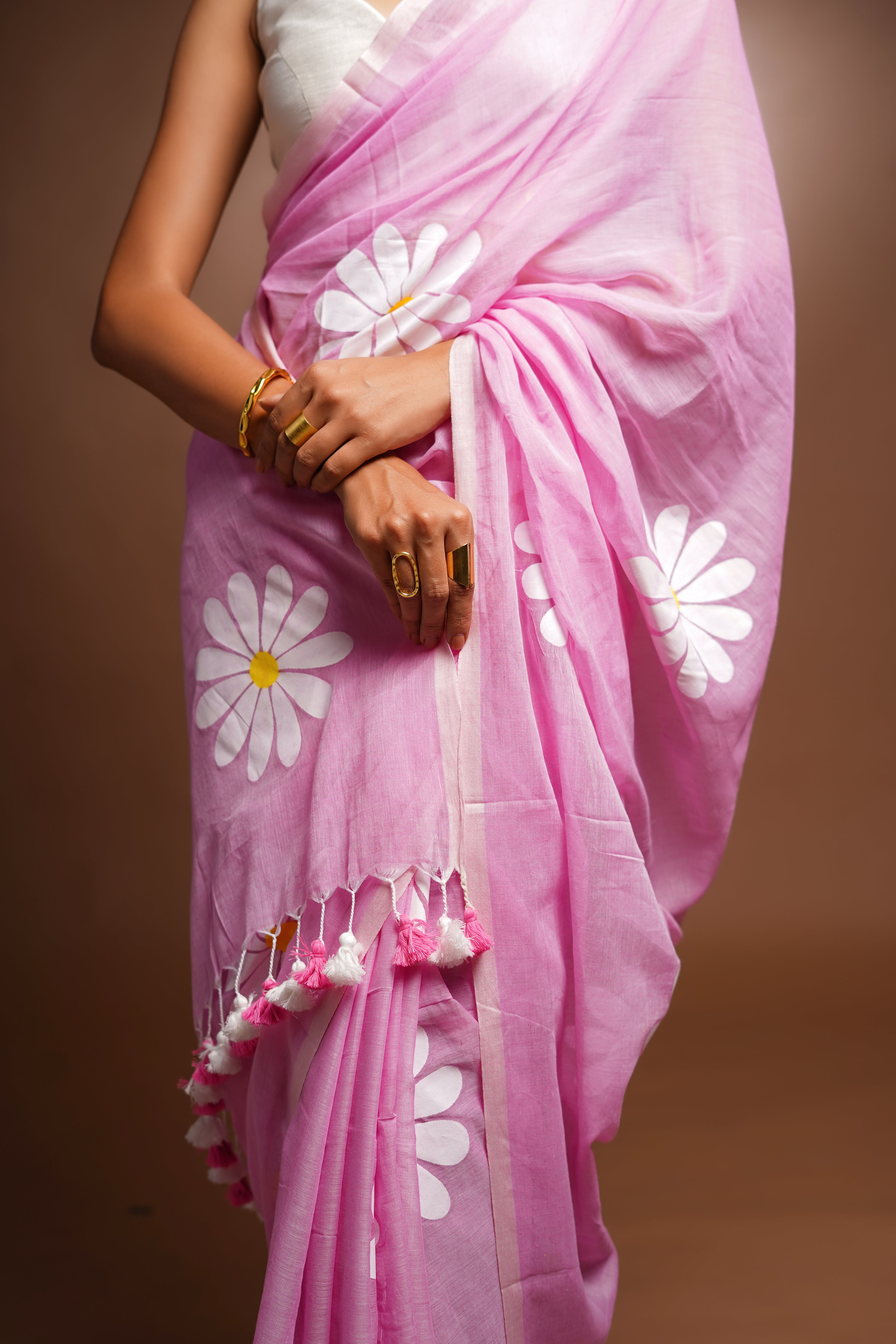 Handpainted original mul cotton saree with handmade tassels on the pallu. Very soft and light weight sarees with floral designs painted by hands. This saree does NOT have a blouse piece.