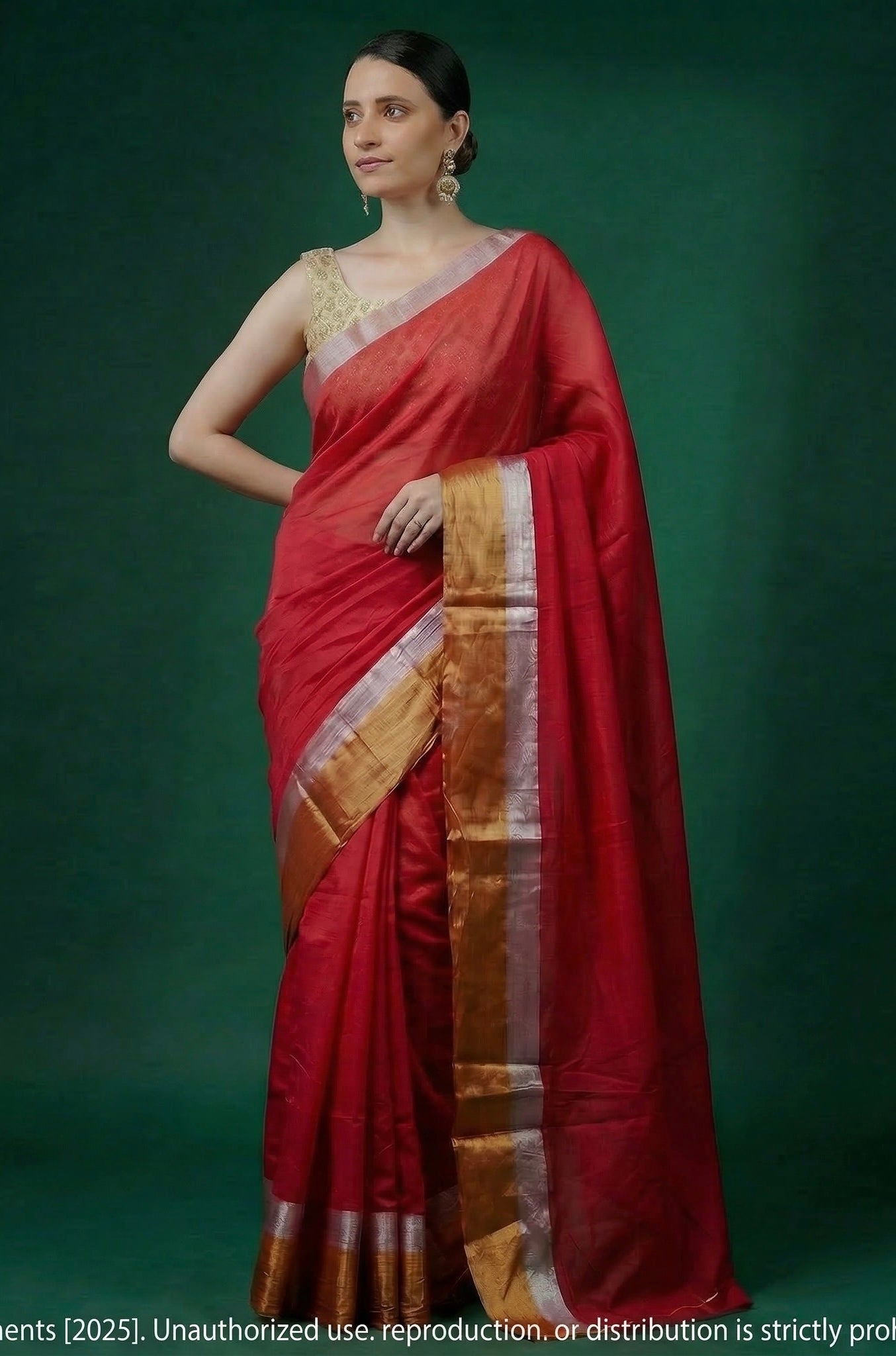 Bold, timeless, and arresting in its beautythis Red Tissue Saree is a celebration of contrasts. The rich red body of the saree is woven in fine Hand Woven tissue, giving it a weightless drape and a subtle metallic sheen. Along the edges, a luminous silver and gold panel triple-tone border glows like liquid silk, adding a vibrant frame to the understated black.