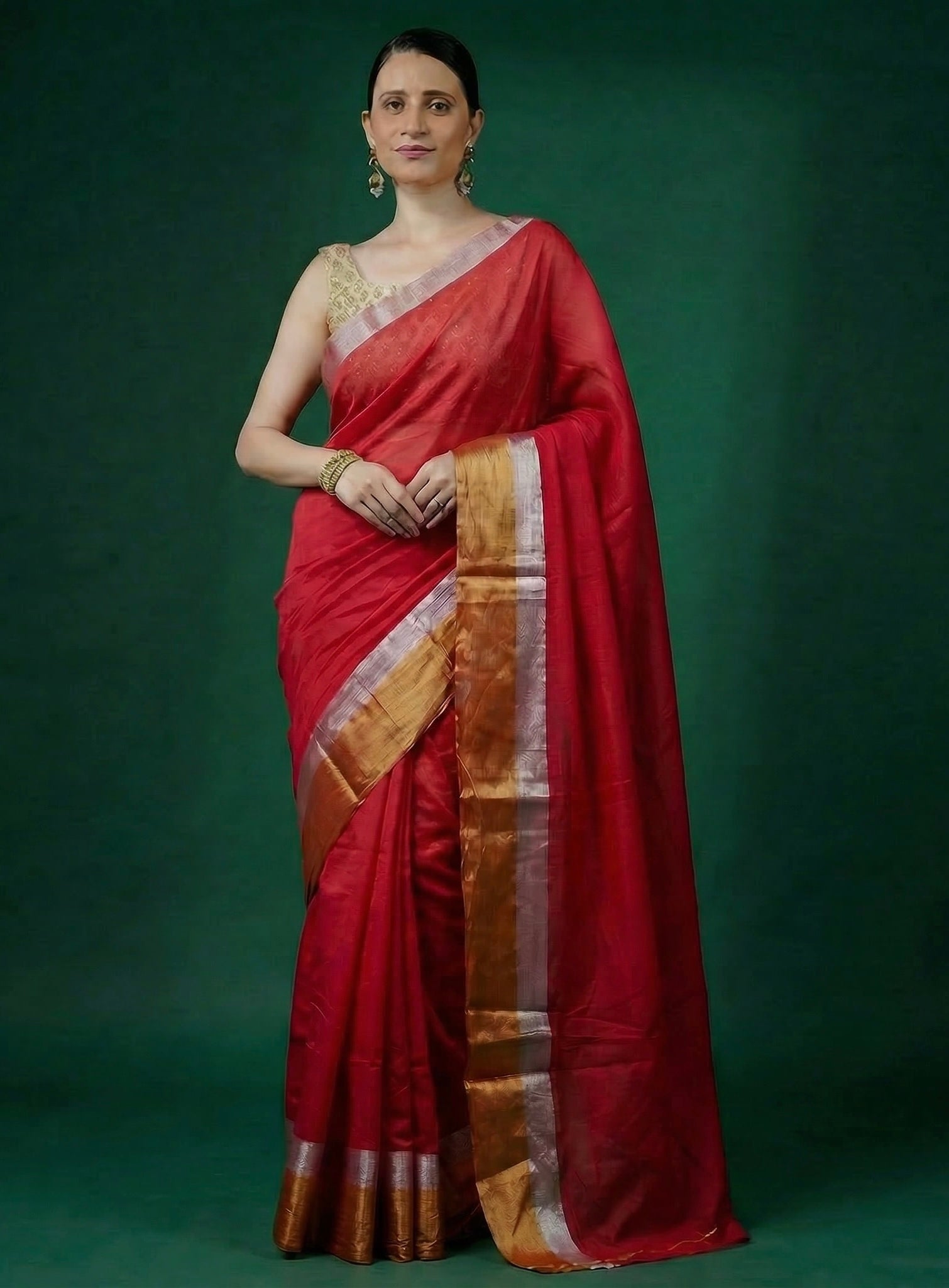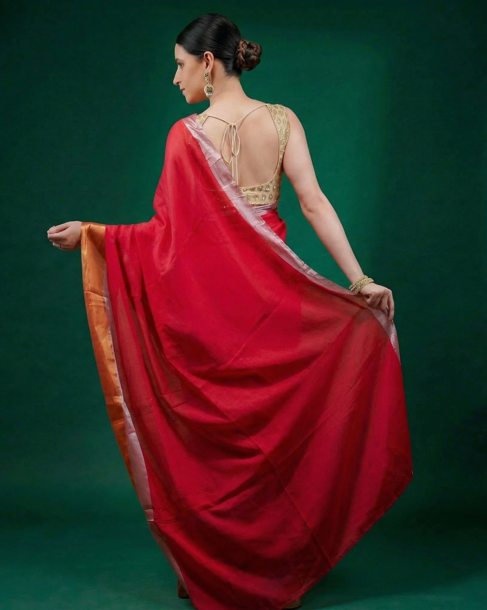 - Power Classic: Pair with a plain gold or silver or matching red blouse in raw silk or tissue, bold jhumkas, and a sleek bun. A small red or stone syud bindi adds finishing drama.