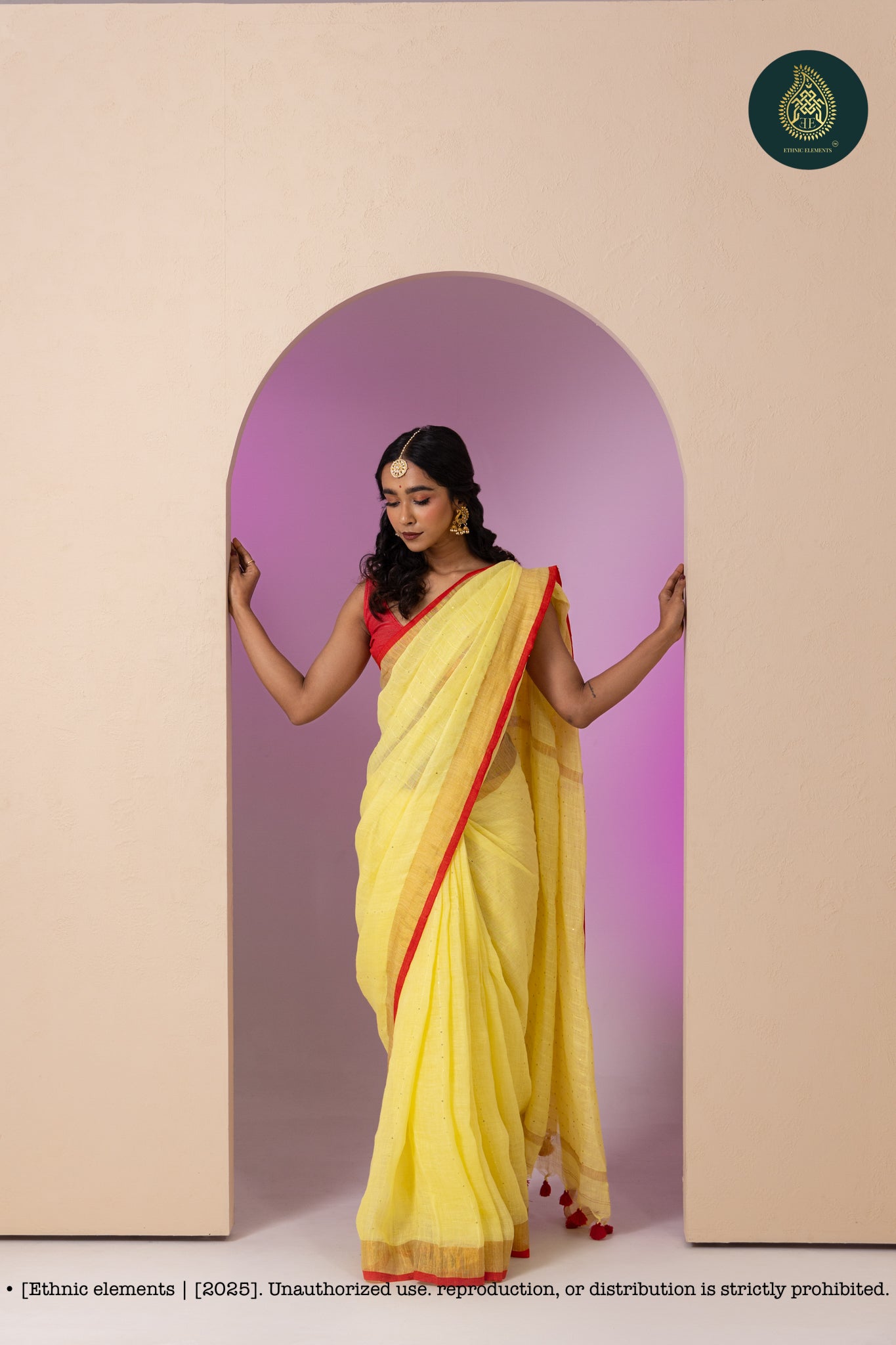Experience the elegance of traditional craftsmanship with our Pure Woven Linen Saree, intricately designed with an all-over sequin weave. This lightweight and breathable saree is perfect for festive occasions and everyday elegance. Please note, this saree comes without a blouse.