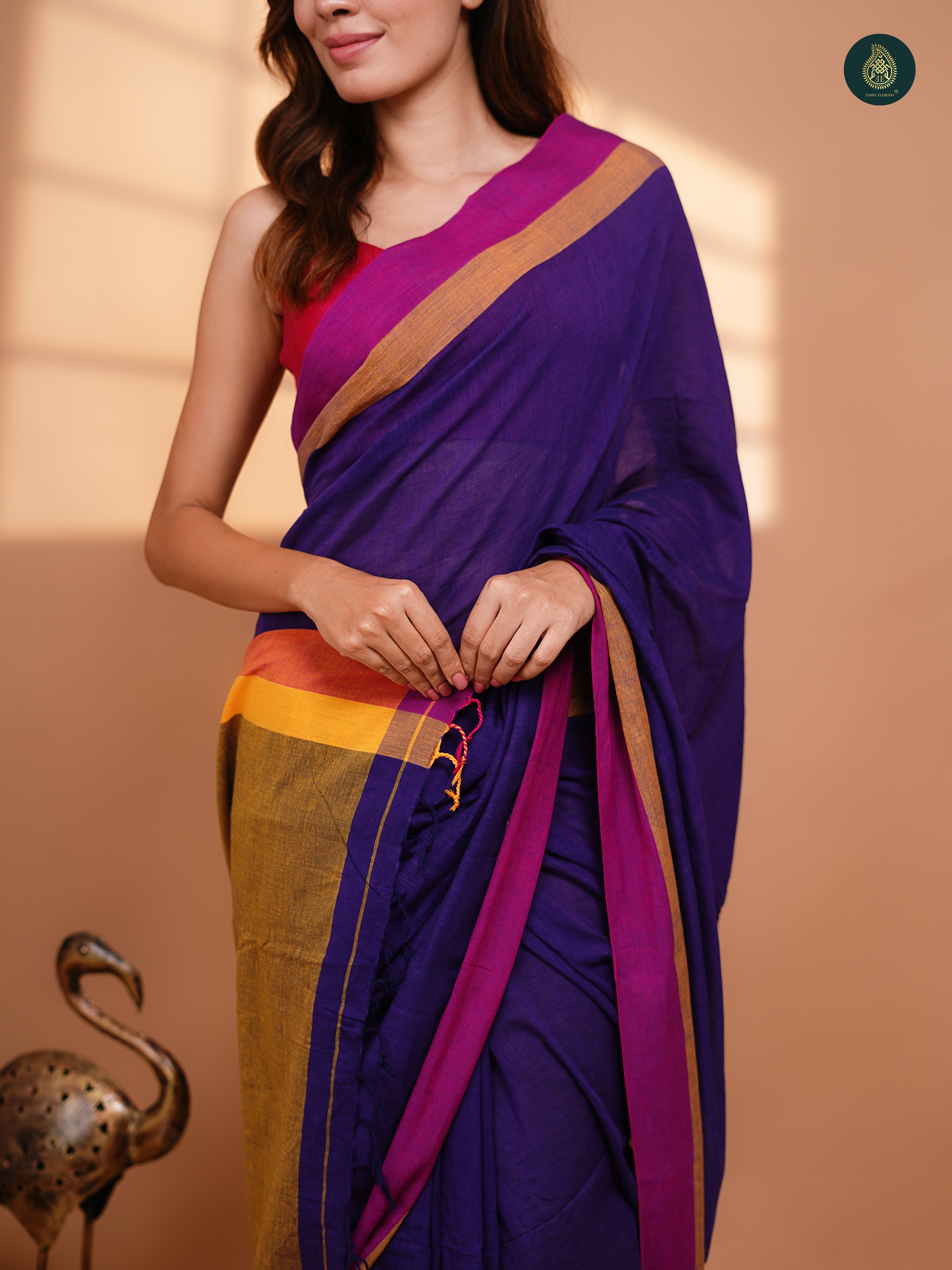 Add elegance to your wardrobe with this Mul Cotton Color Block Saree, featuring vibrant hues and handmade tassels on the pallu. Lightweight and breathable, it's perfect for daily wear, office, or special occasions. Please note, the saree comes without a blouse.