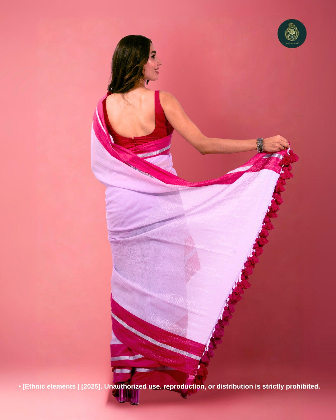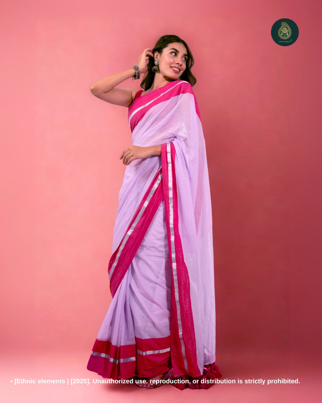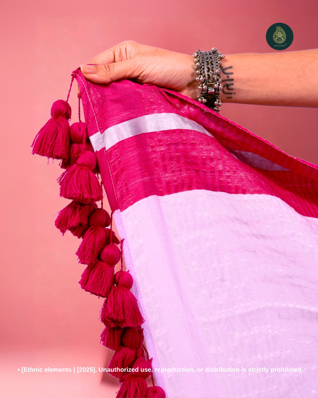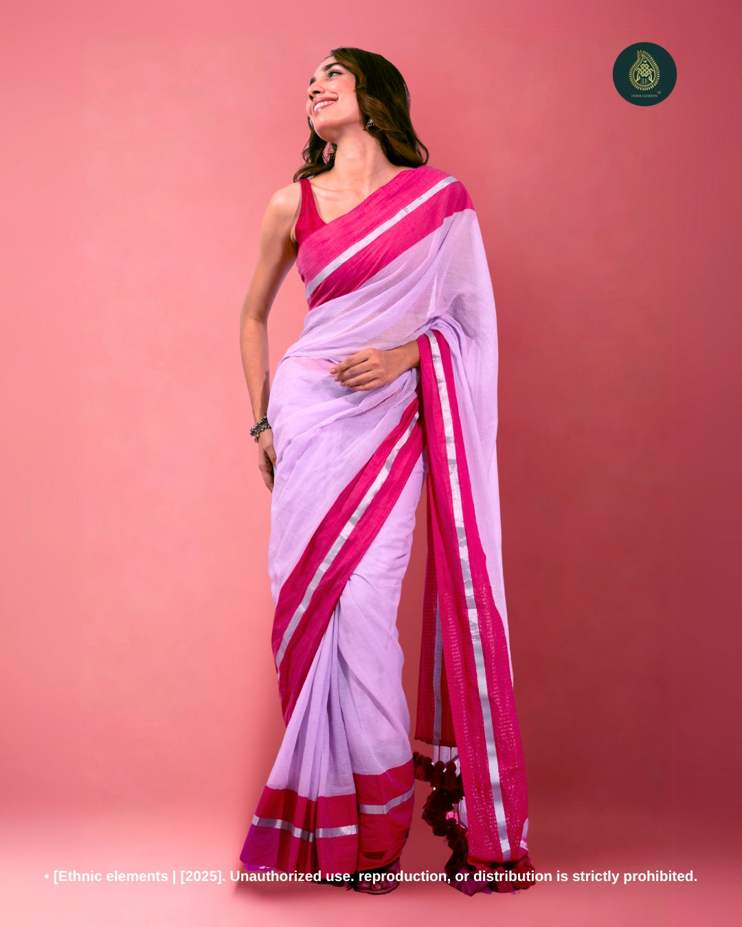 Elevate your everyday style with our Mul Cotton Handloom Saree, thoughtfully crafted for comfort, grace, and traditional flair. Made from pure, breathable Mul Cotton, this saree features a rich contrast border and zari weaving on the border and pallu, adding a subtle sparkle to its minimal aesthetic. Finished with big handmade tassels, it brings a festive touch to your wardrobe while remaining lightweight and easy to wear. Please note, this saree comes without a blouse.