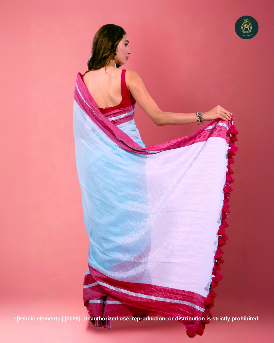 Elevate your everyday style with our Mul Cotton Handloom Saree, thoughtfully crafted for comfort, grace, and traditional flair. Made from pure, breathable Mul Cotton, this saree features a rich contrast border and zari weaving on the border and pallu, adding a subtle sparkle to its minimal aesthetic. Finished with big handmade tassels, it brings a festive touch to your wardrobe while remaining lightweight and easy to wear. Please note, this saree comes without a blouse.