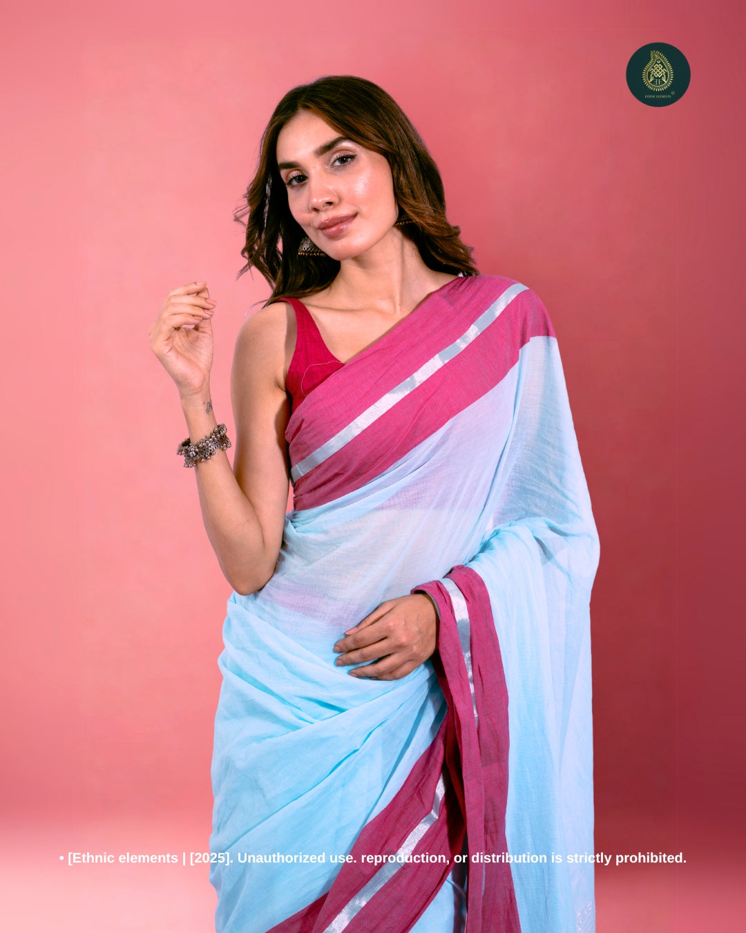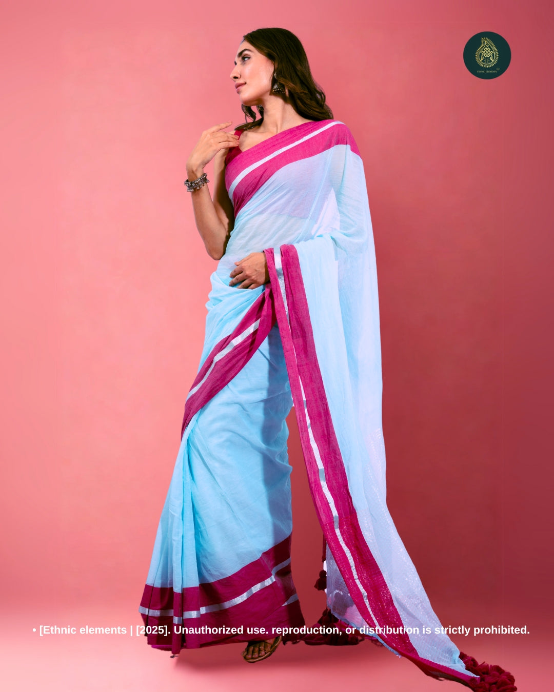 Mul Cotton Saree with Contrast Border Zari Aura - Icy Breeze