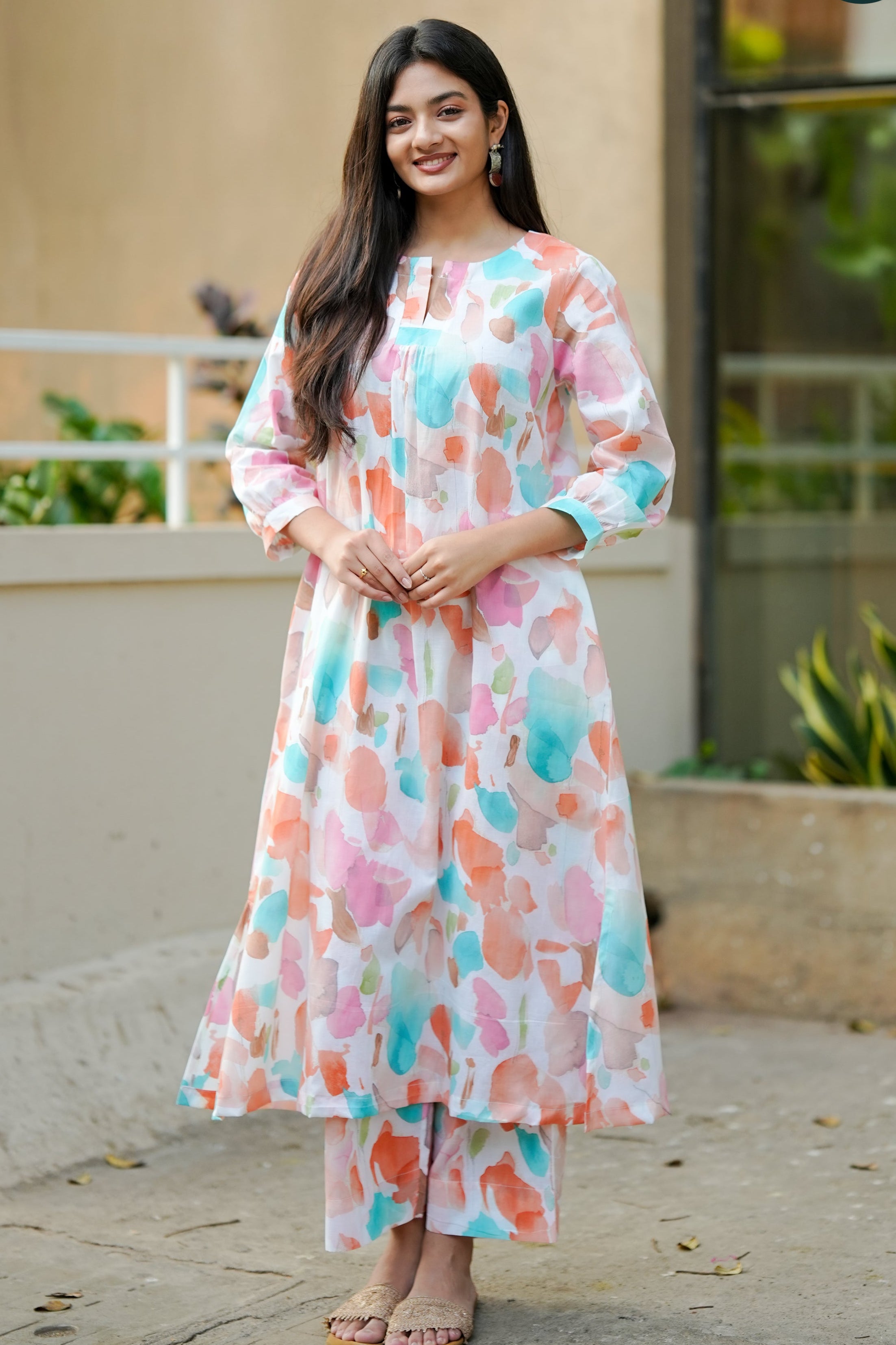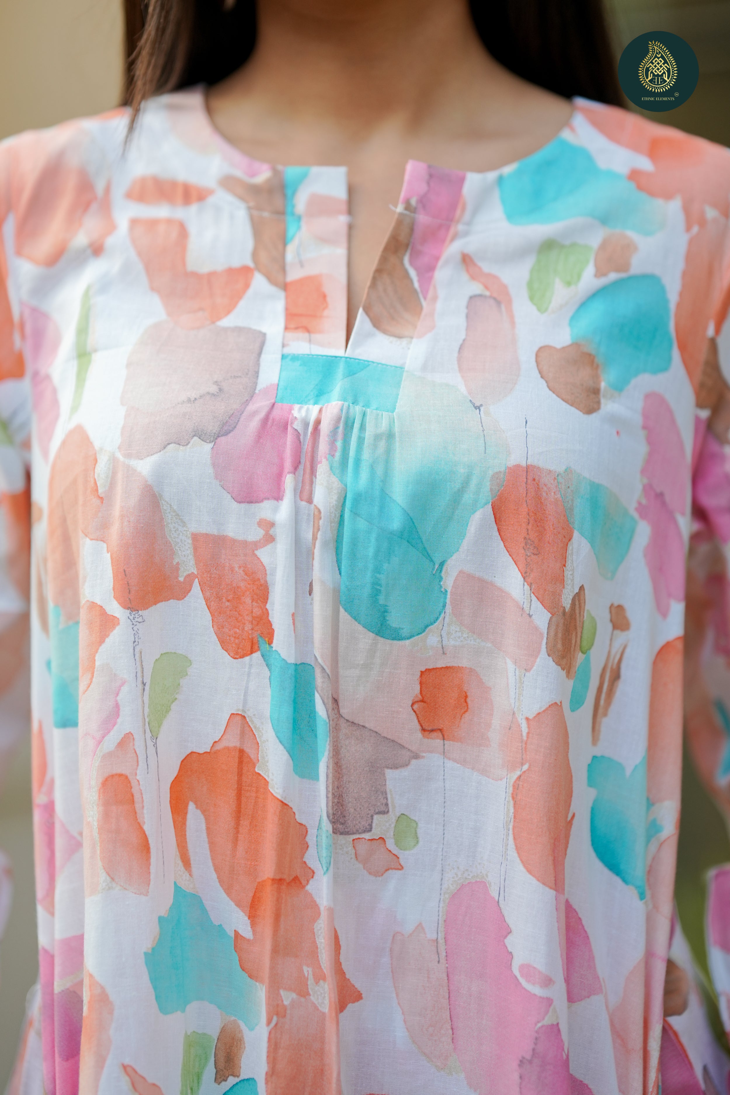 Our Brush Muse hand-painted inspired premium printed cotton 2Pc stitched suit set is your daily go to set.  With front round neck with v neck slide and centre gathering this straight fit kurta parallel pant set offer a comfortable and smart look which you can carry in office or any casual evening. Pair it up with some accessaries and you favourite flats or comfortable slip ons and you are all set.