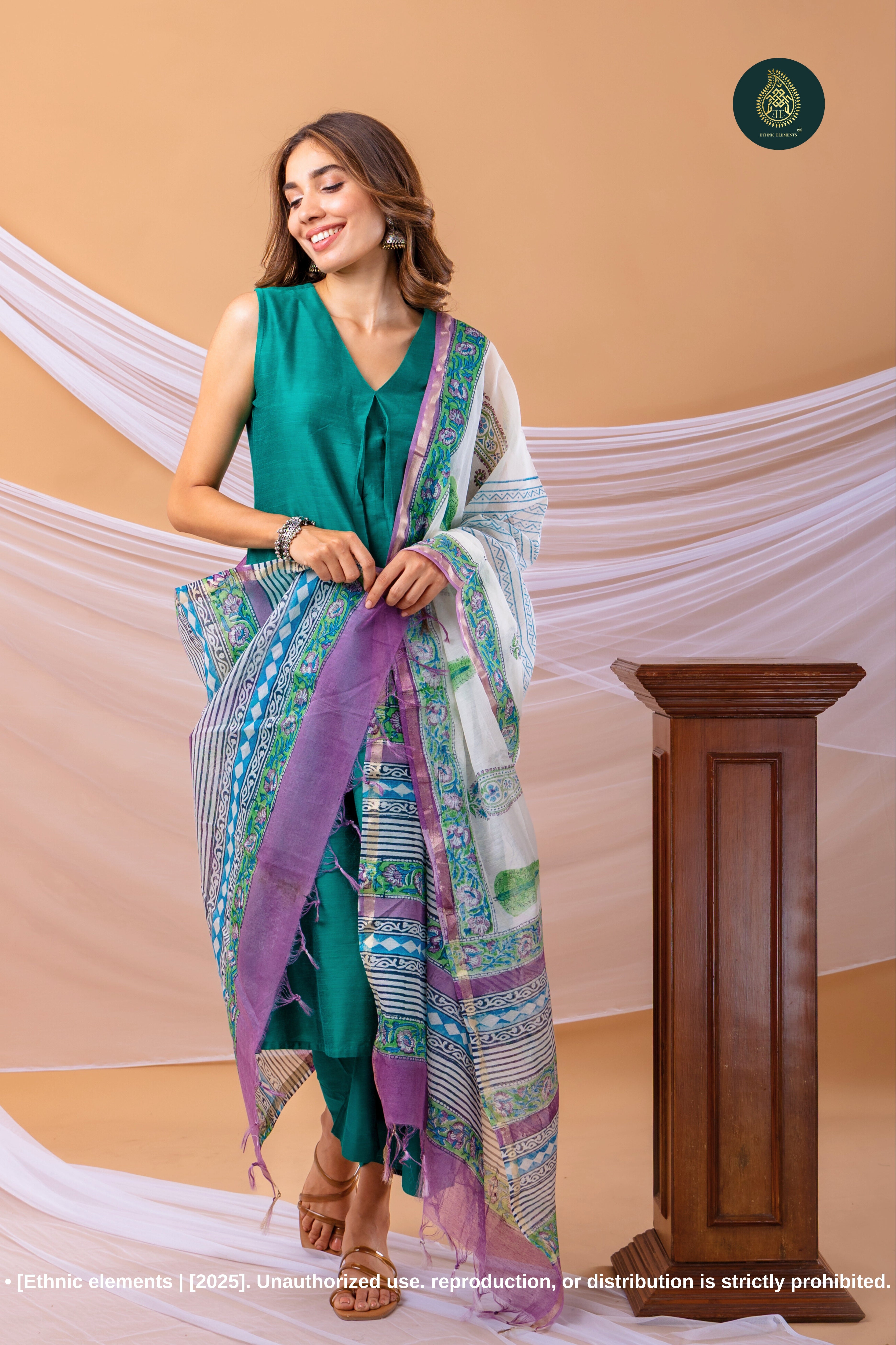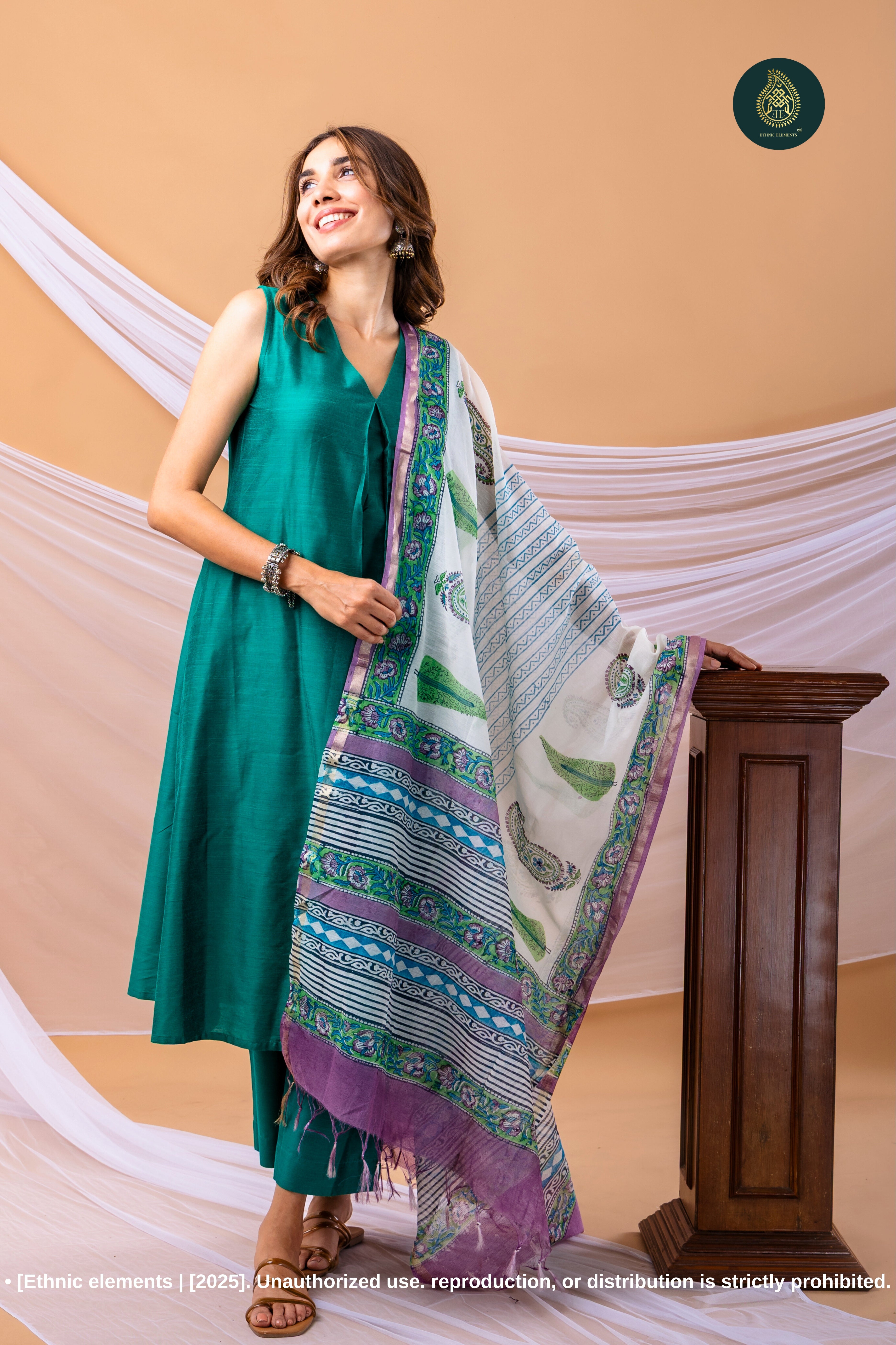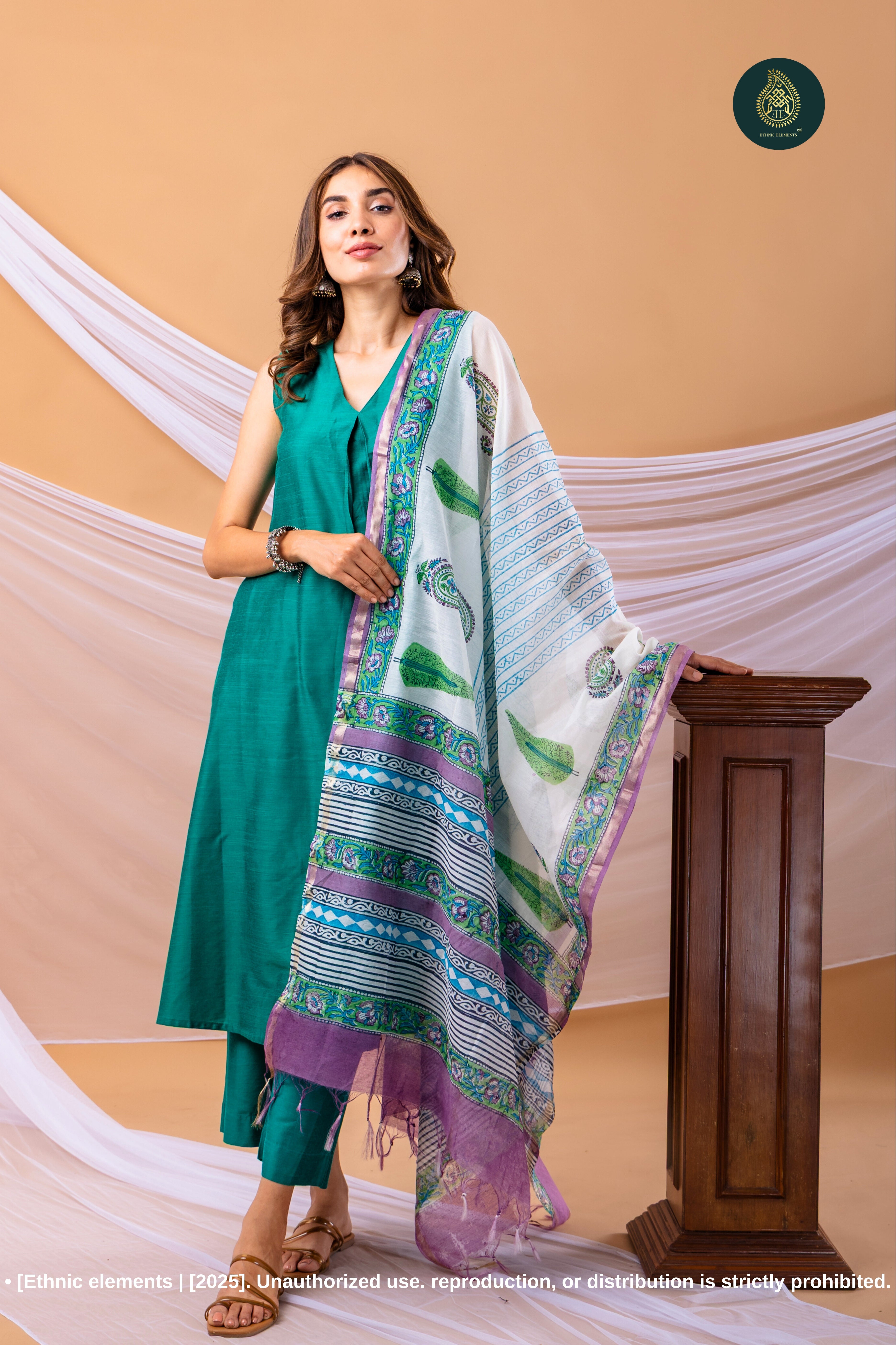Feel effortlessly beautiful in this uniquely designed and thoughtfully crafted set. The rich green angrakha-style kurta paired with matching pants and a beautifully woven  sanganeri hand block printed dupatta creates a look that’s timeless, graceful, and easy to carry from day to evening. Perfect for daily elegance or special occasions.