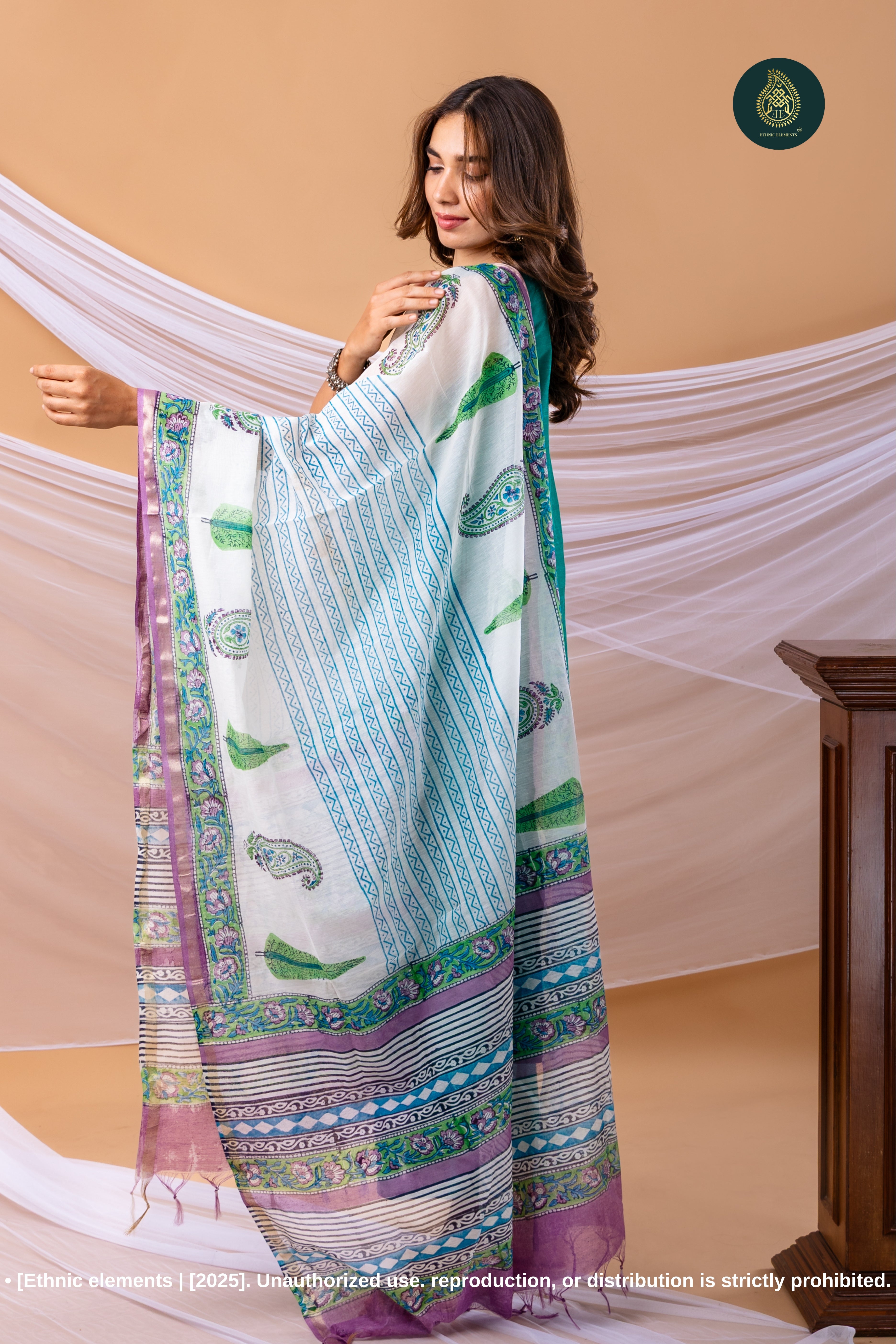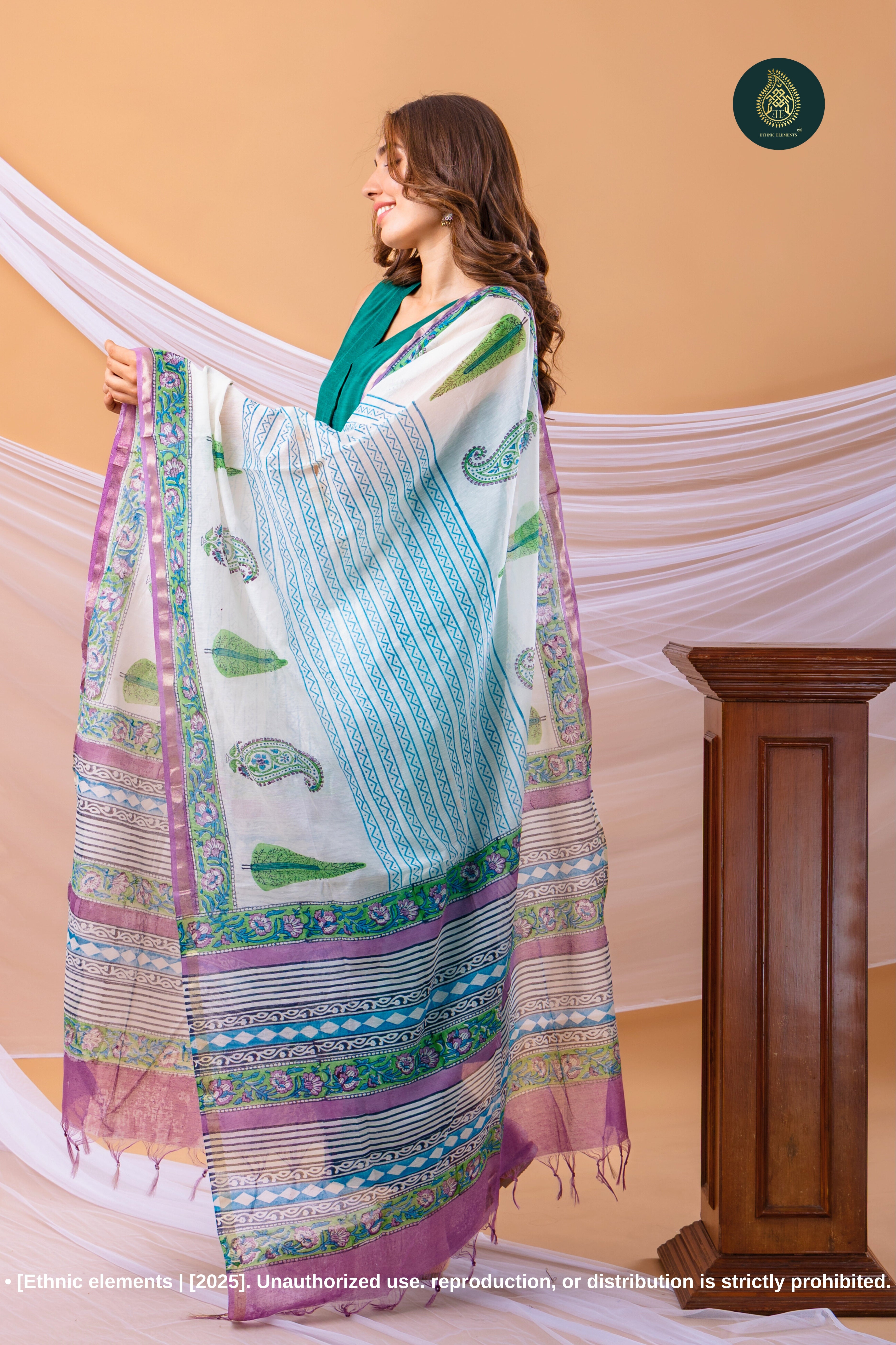 Dupatta: Cotton sanganeri hand block printed dupatta featuring authentic floral motifs bordered with a soft reddish orange weave — a tribute to traditional artistry
