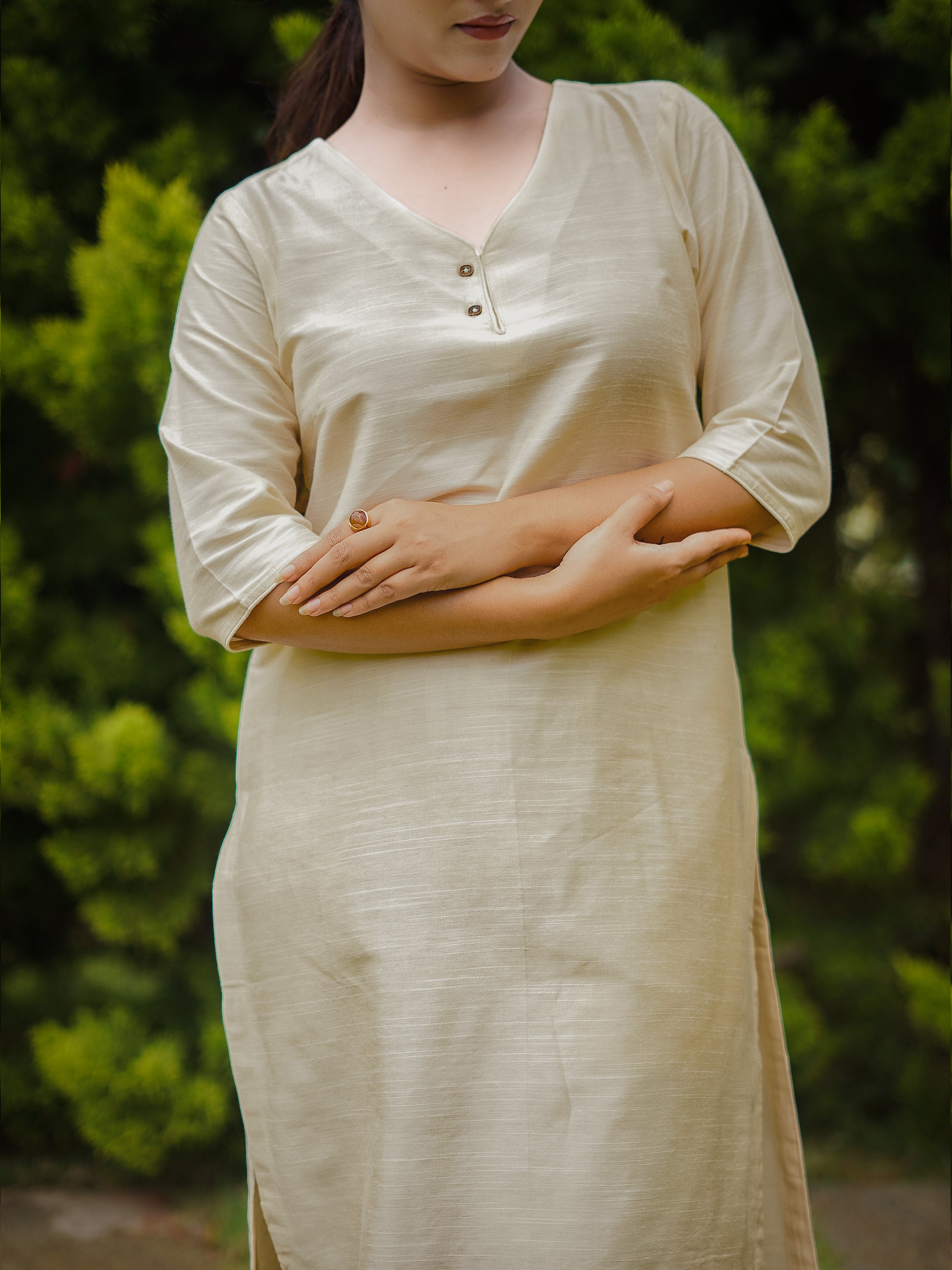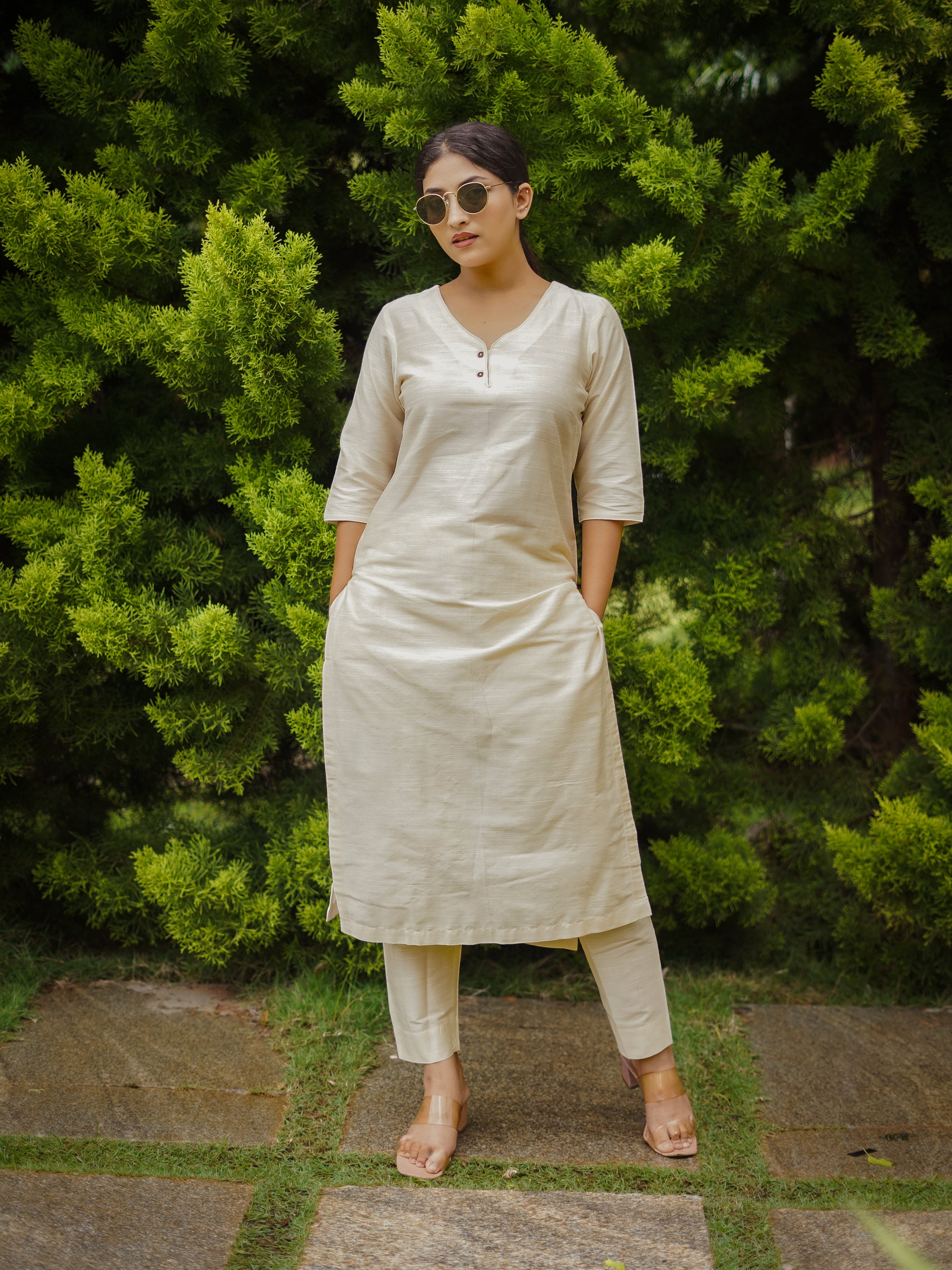 Feel effortlessly beautiful in this uniquely designed and crafted set, featuring a cotton silk kurta and tailored bottoms. This suit makes you comfortable and easy to carry all day. A pair which is perfect for your daily outing and a special occasion.