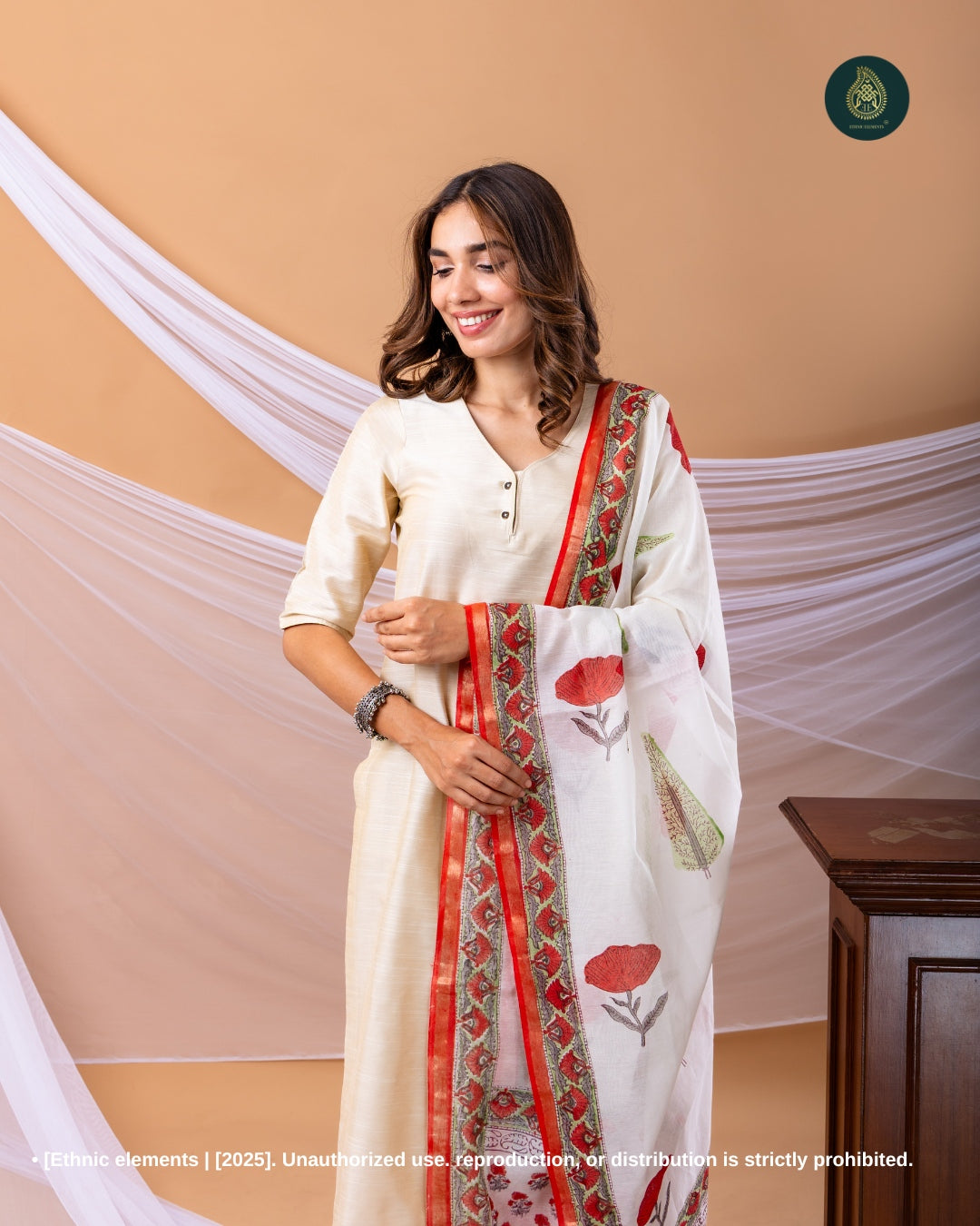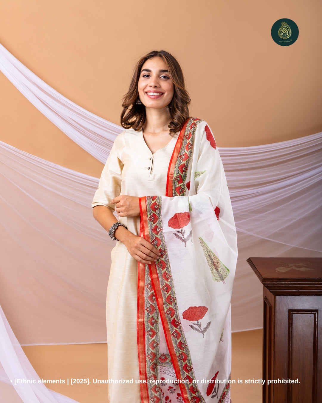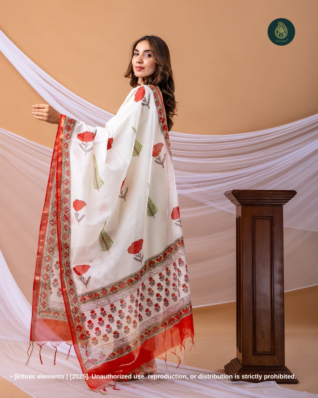 Dupatta: Cotton sanganeri hand block printed dupatta featuring authentic floral motifs bordered with a soft reddish orange weave — a tribute to traditional artistry