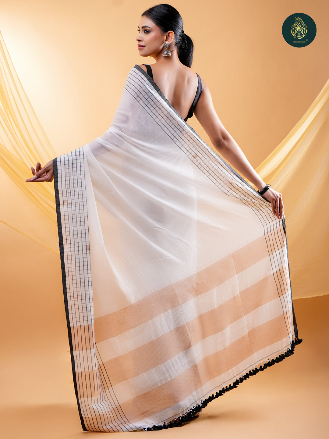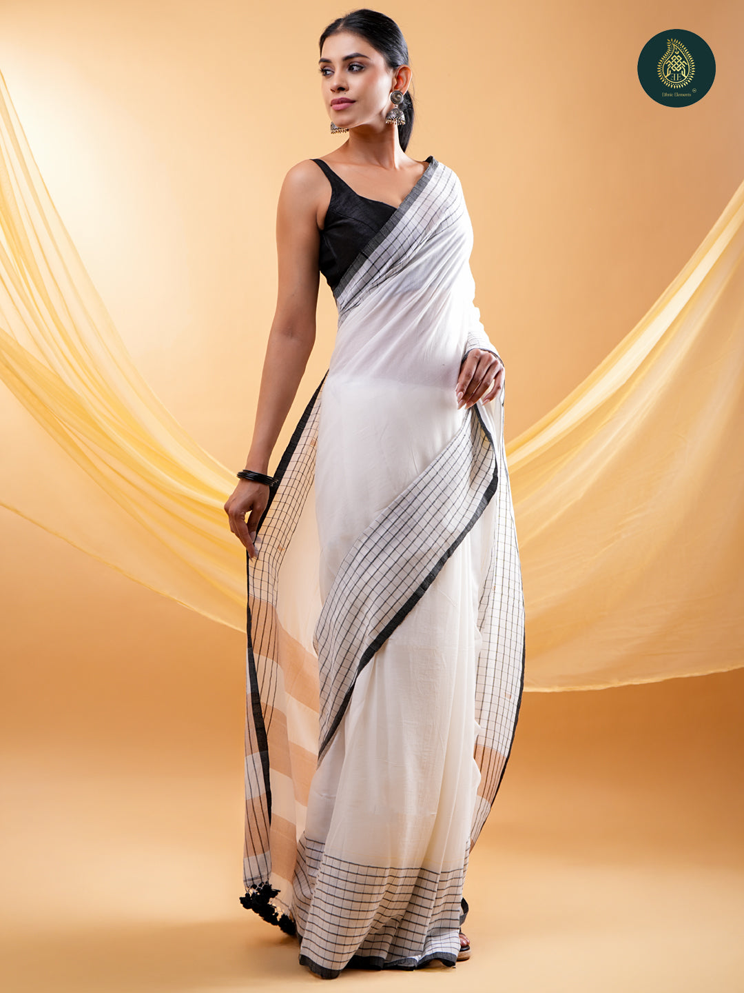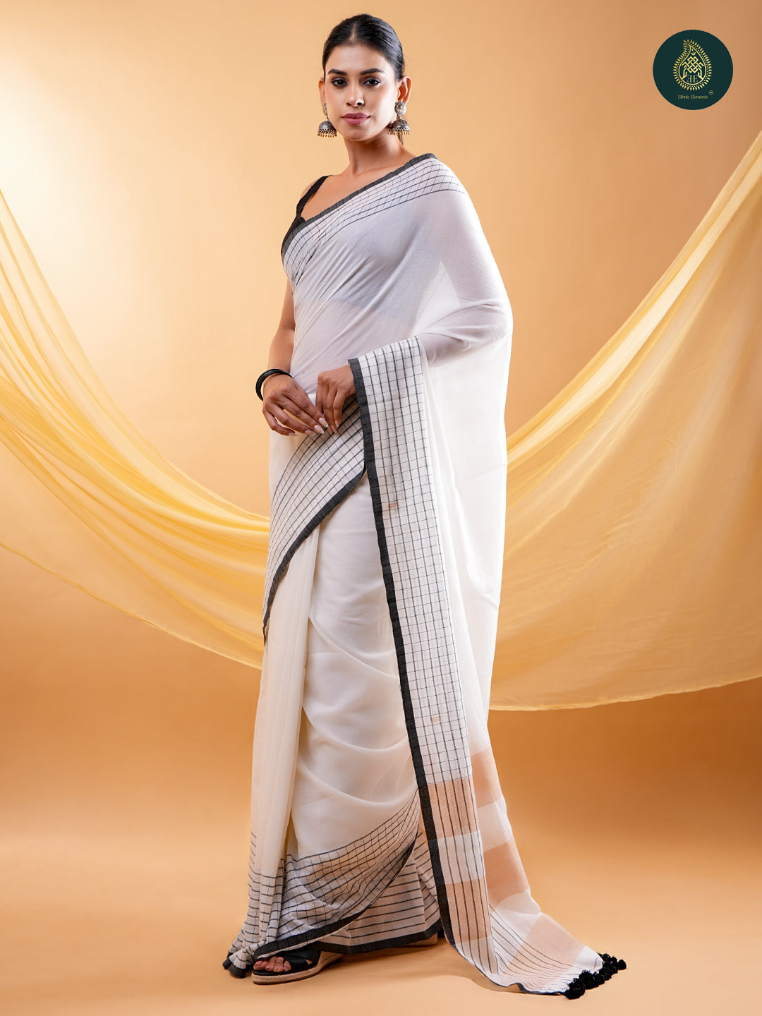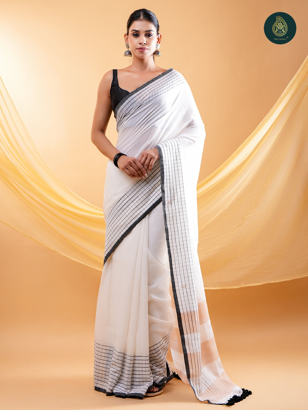 - Design Details: Crisp white base, structured grid and stripe border, and handcrafted black tassels on the pallu.