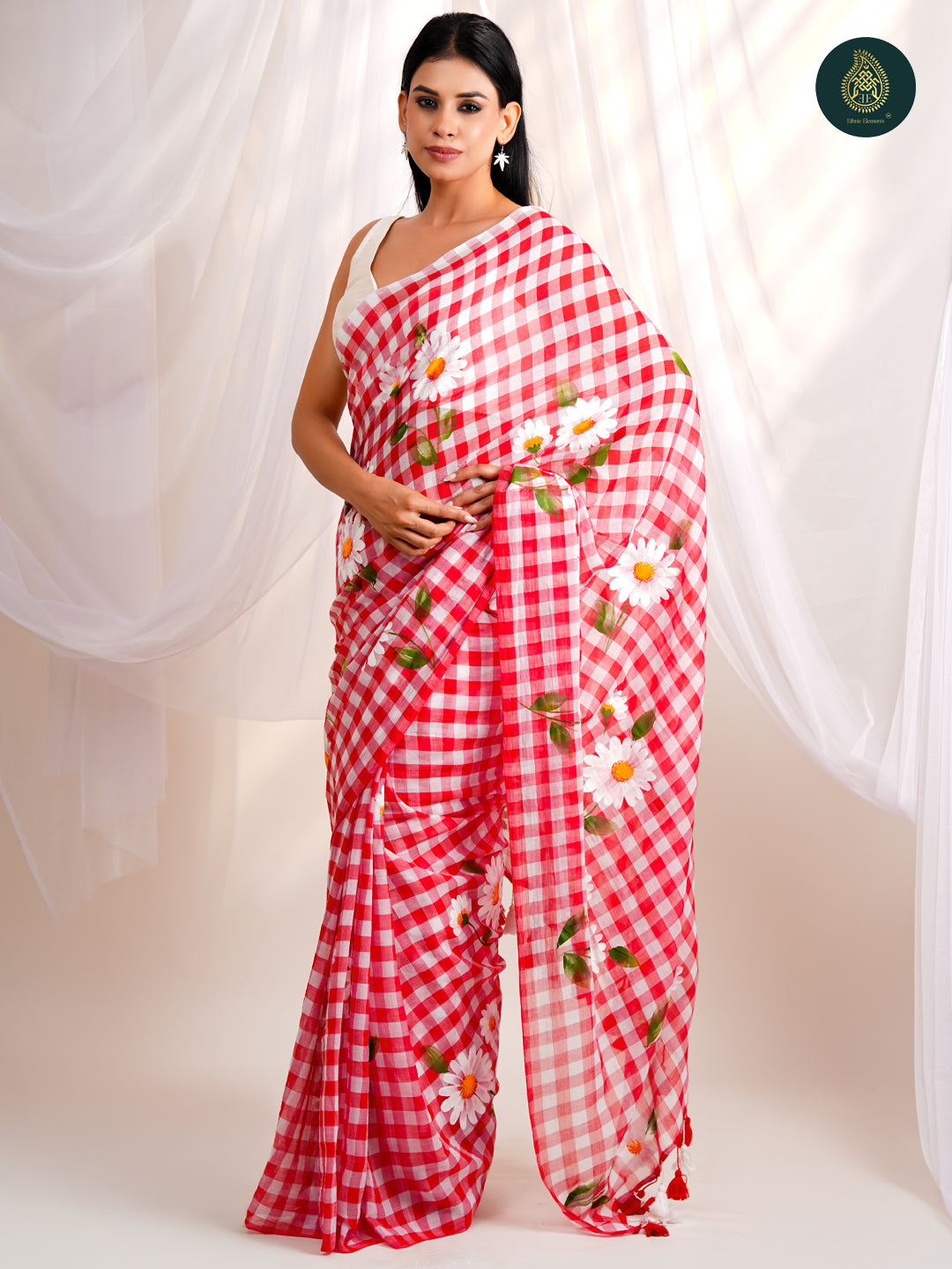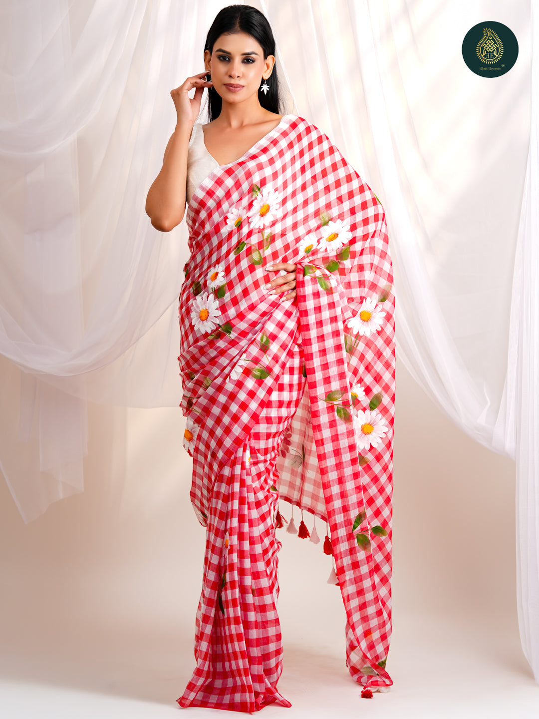 Crimson Red Checked Mul Cotton Saree with Hand-Painted Daisies