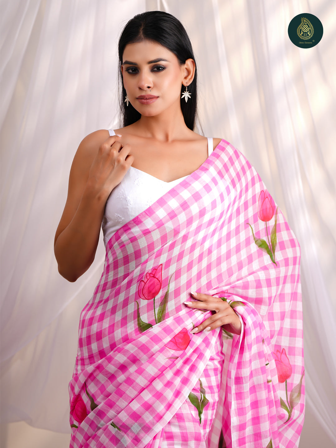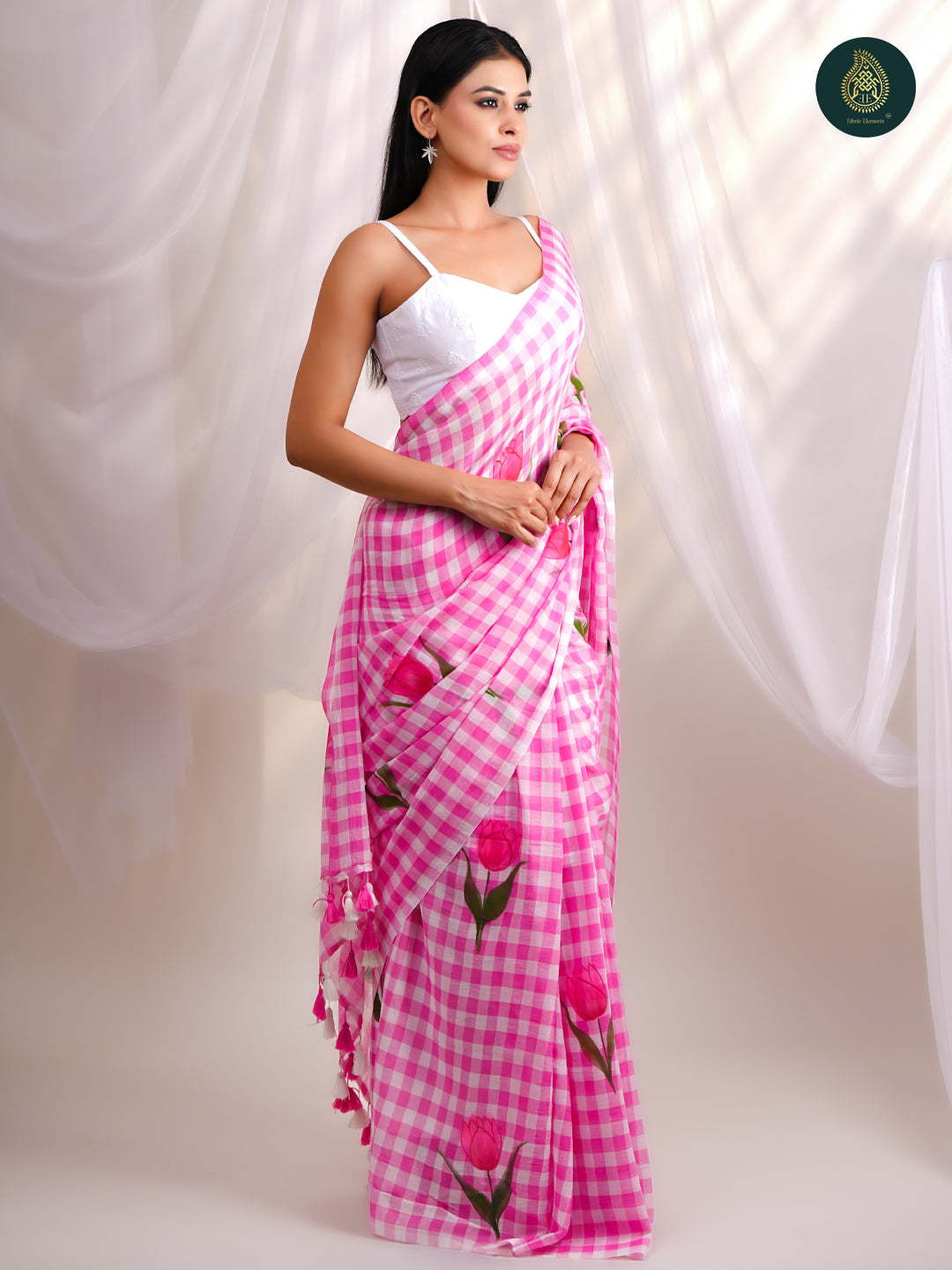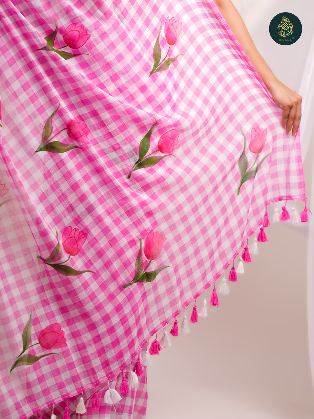 Design - Hand-painted tulip motifs with soft woven checks and pom-pom tassels on the pallu
