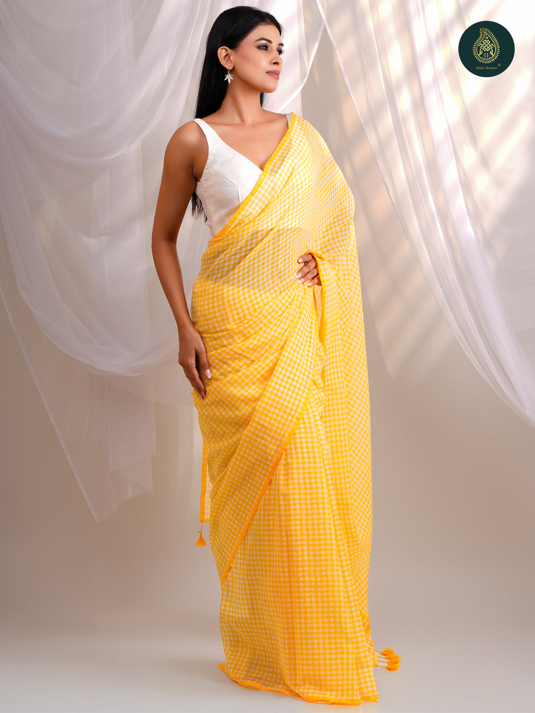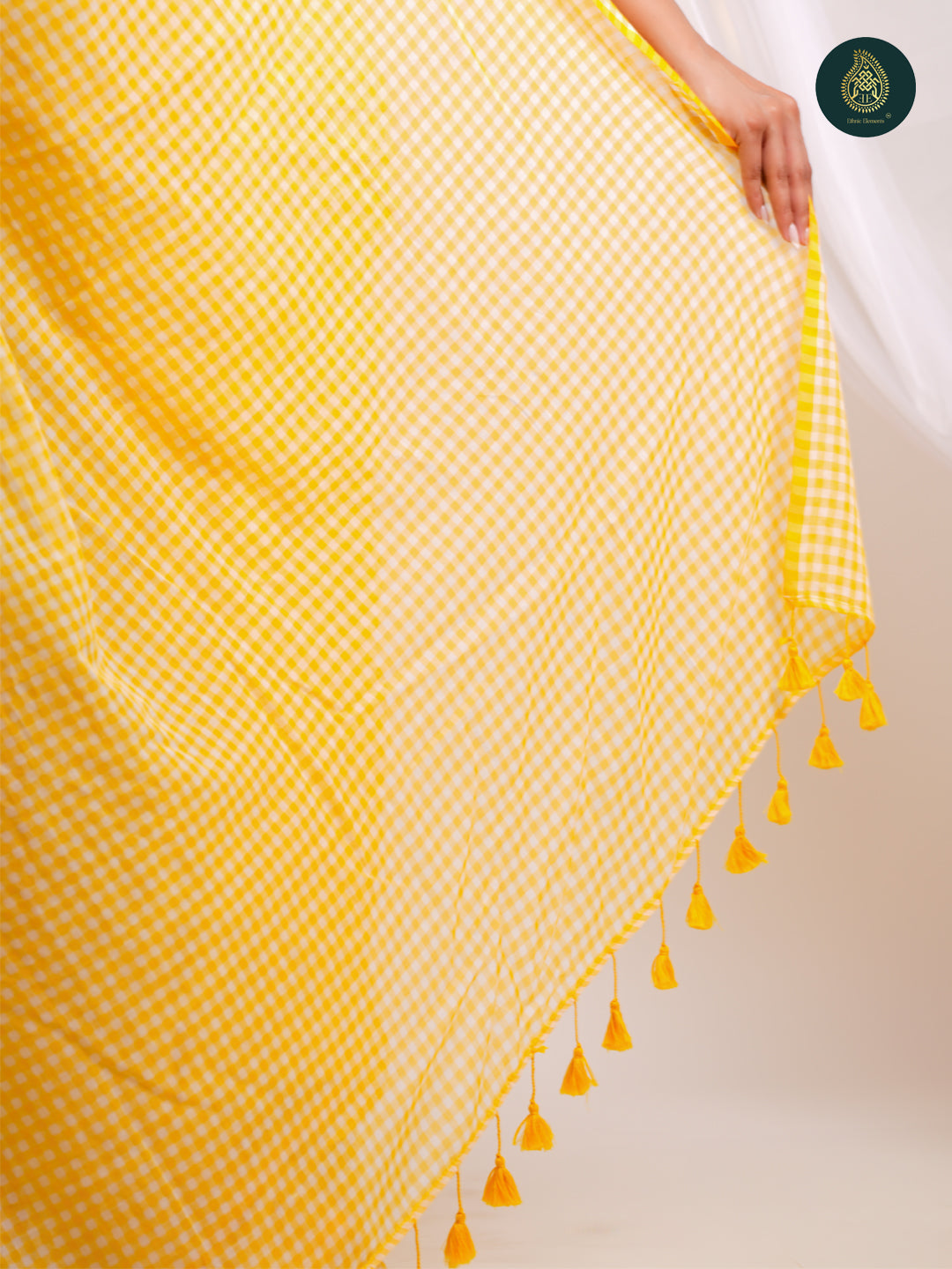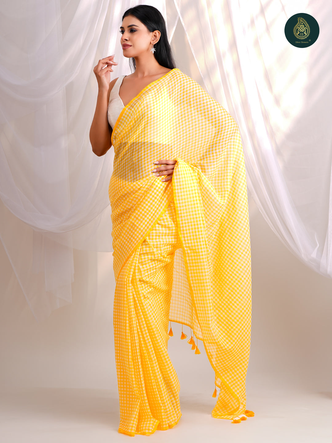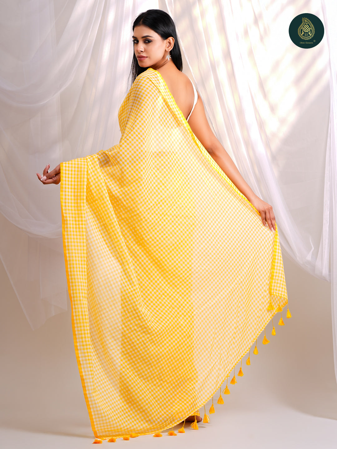 - Design – Classic gingham checks with tassel detailing on the pallu