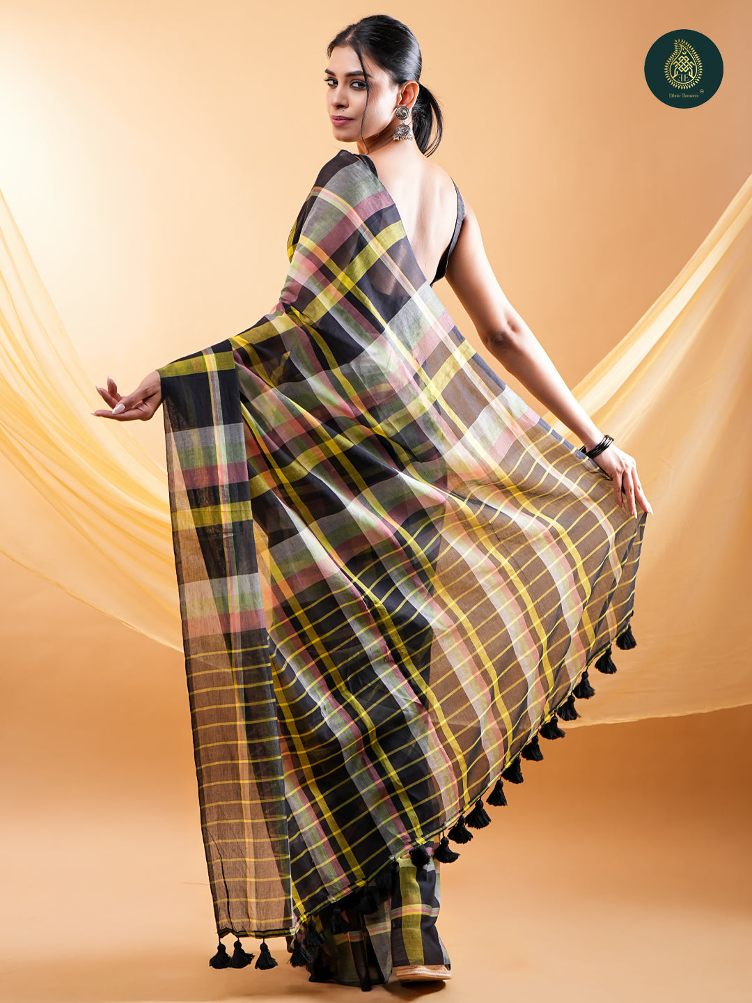 - Design Details: checked pattern with a contrasting striped pallu and black tassel detailing.