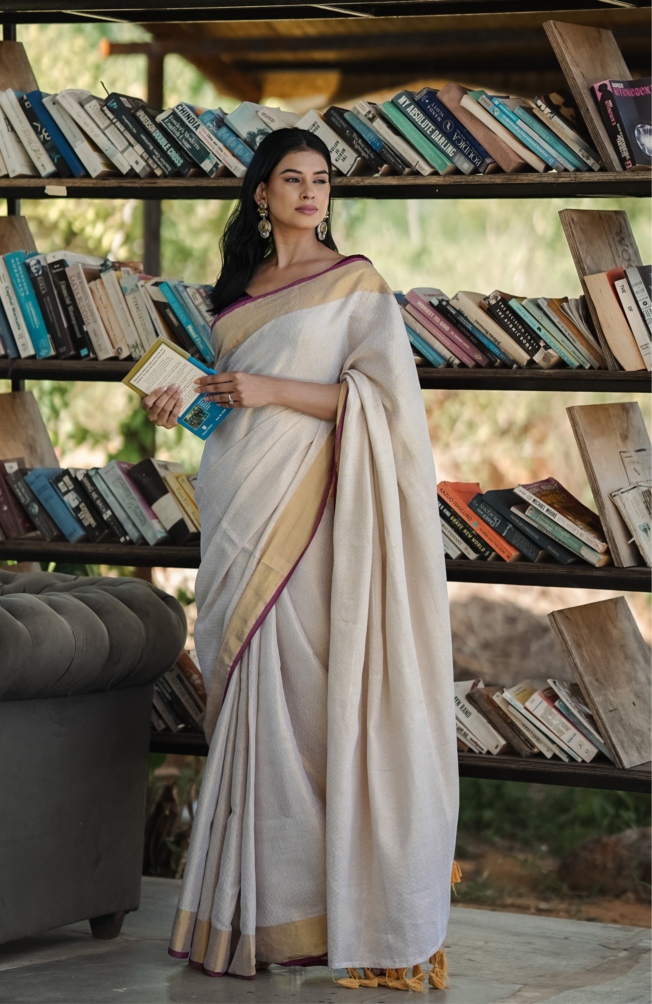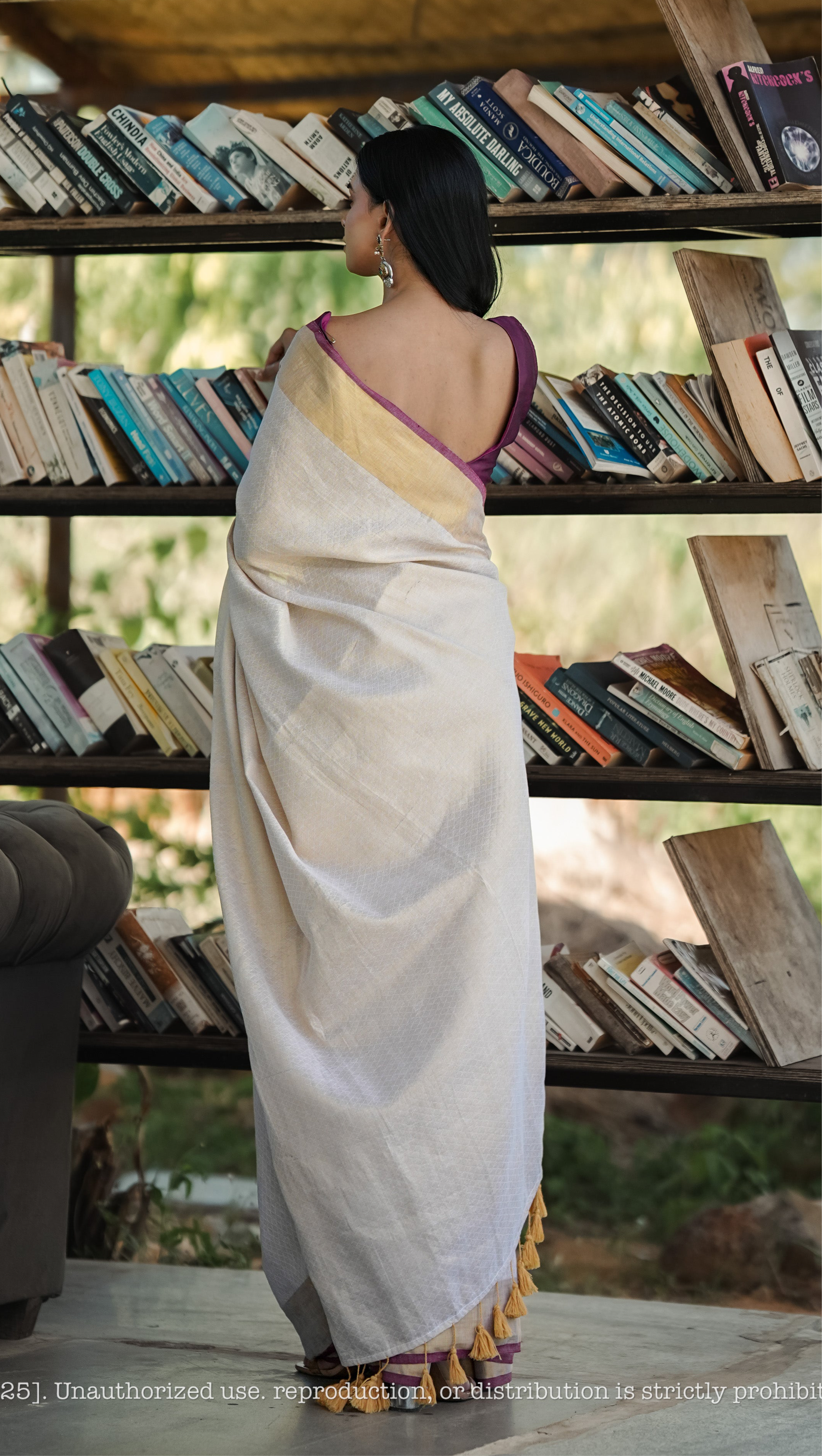 Crafted in fine mul cotton, this saree balances the airy softness of cotton with a structured finish. The zari jaal across the body adds quiet richness, while the golden border enhances its regal appeal. Hand-finished tassels complete the drape, bringing together tradition and craftsmanship in every detail.