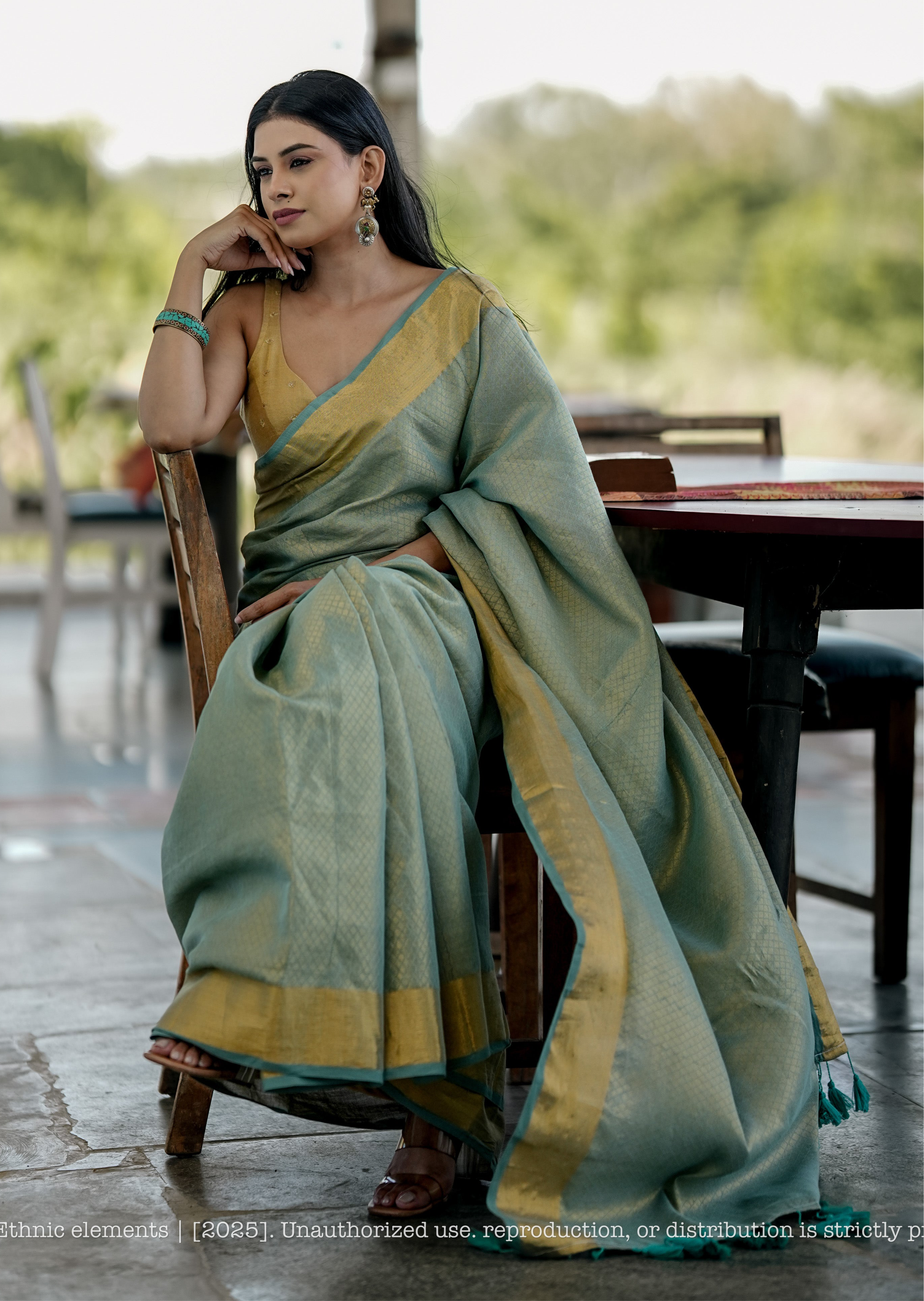 A timeless drape that whispers elegance, this saree blends understated charm with regal finesse. Woven in a soft, lustrous weave, it features a subtle all-over jaal, intricately detailed in zari, and framed with a mustard-gold border. Lightweight yet grand, it falls with effortless grace — making it a versatile choice for festive occasions, celebrations, or intimate gatherings.