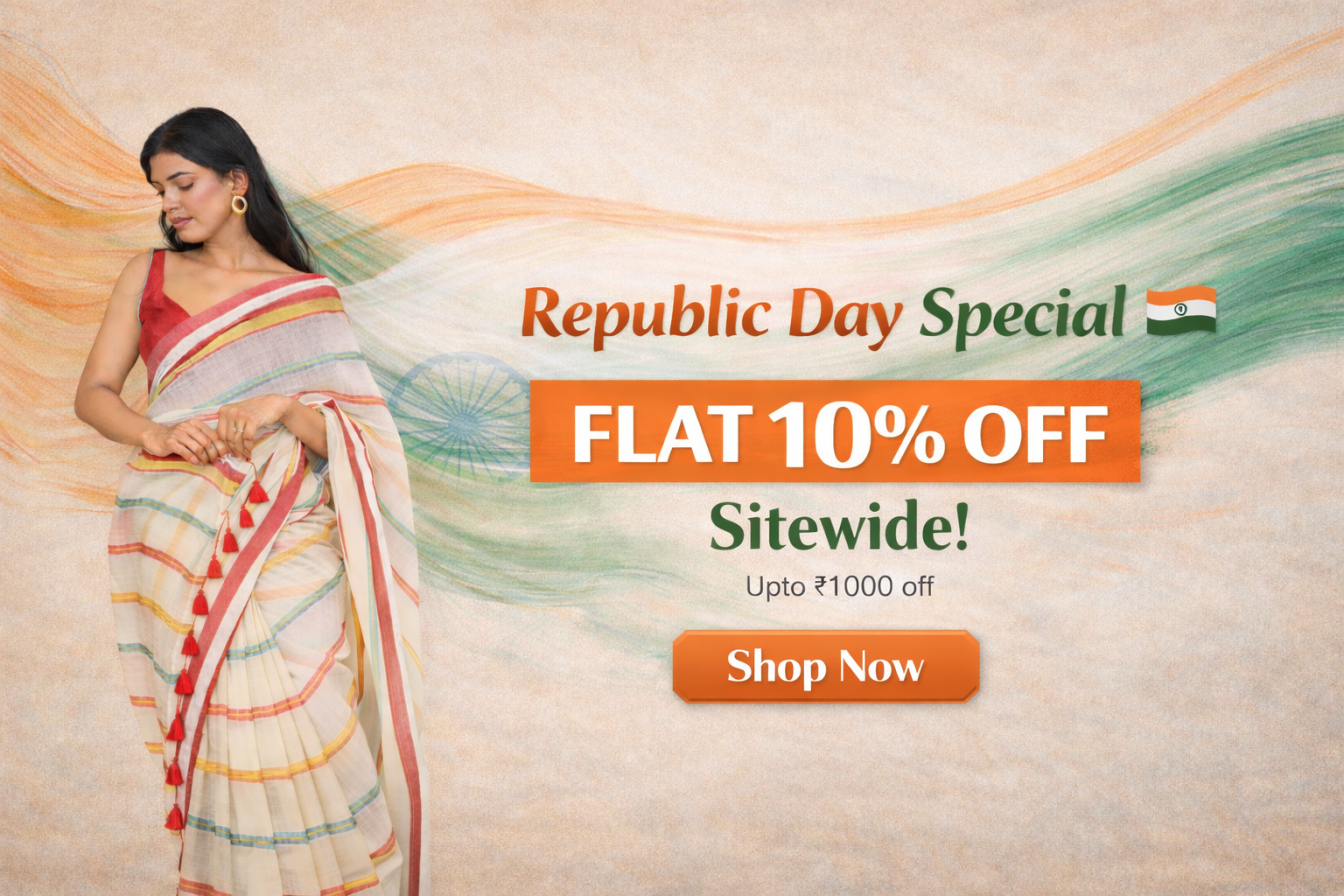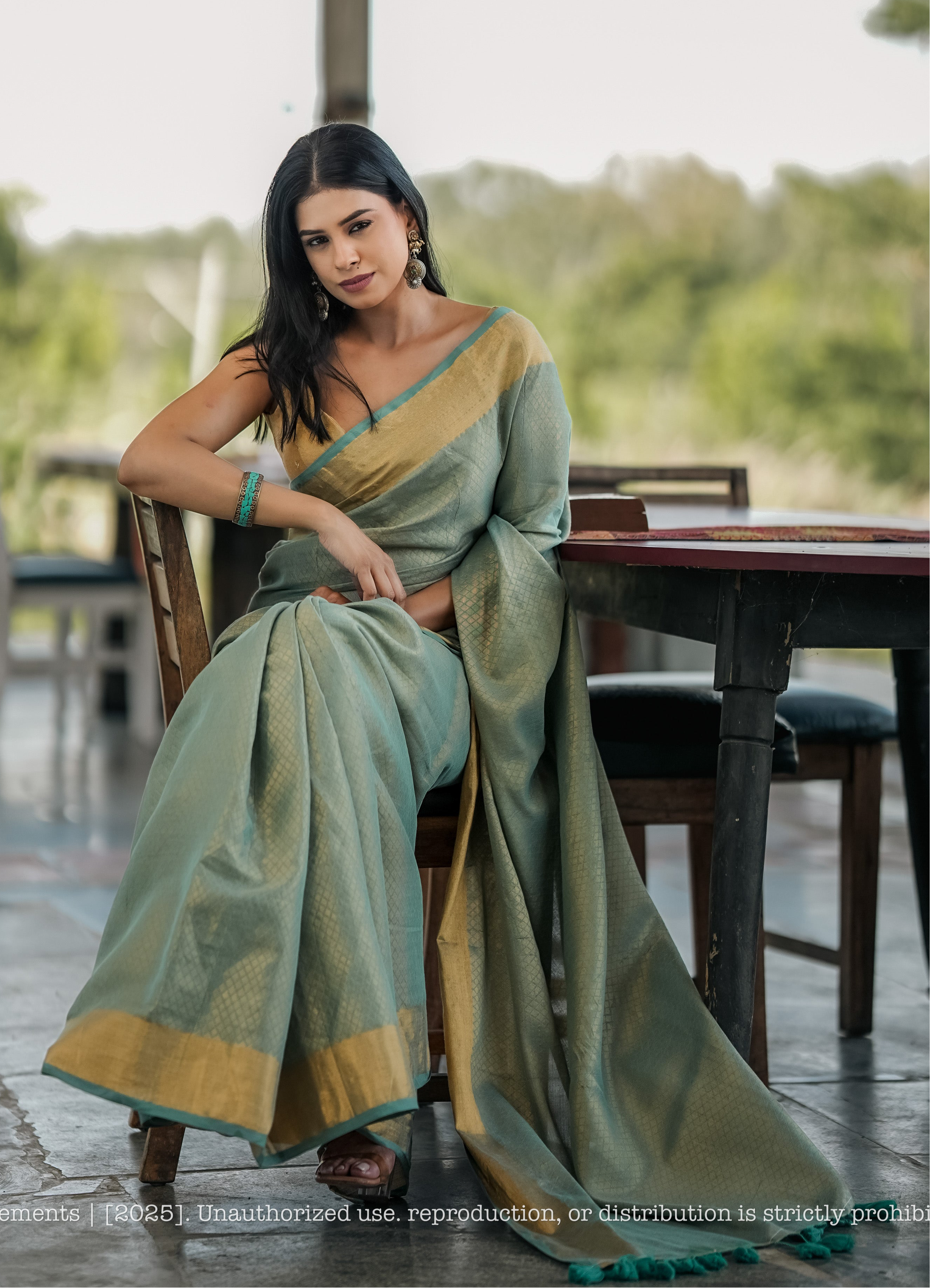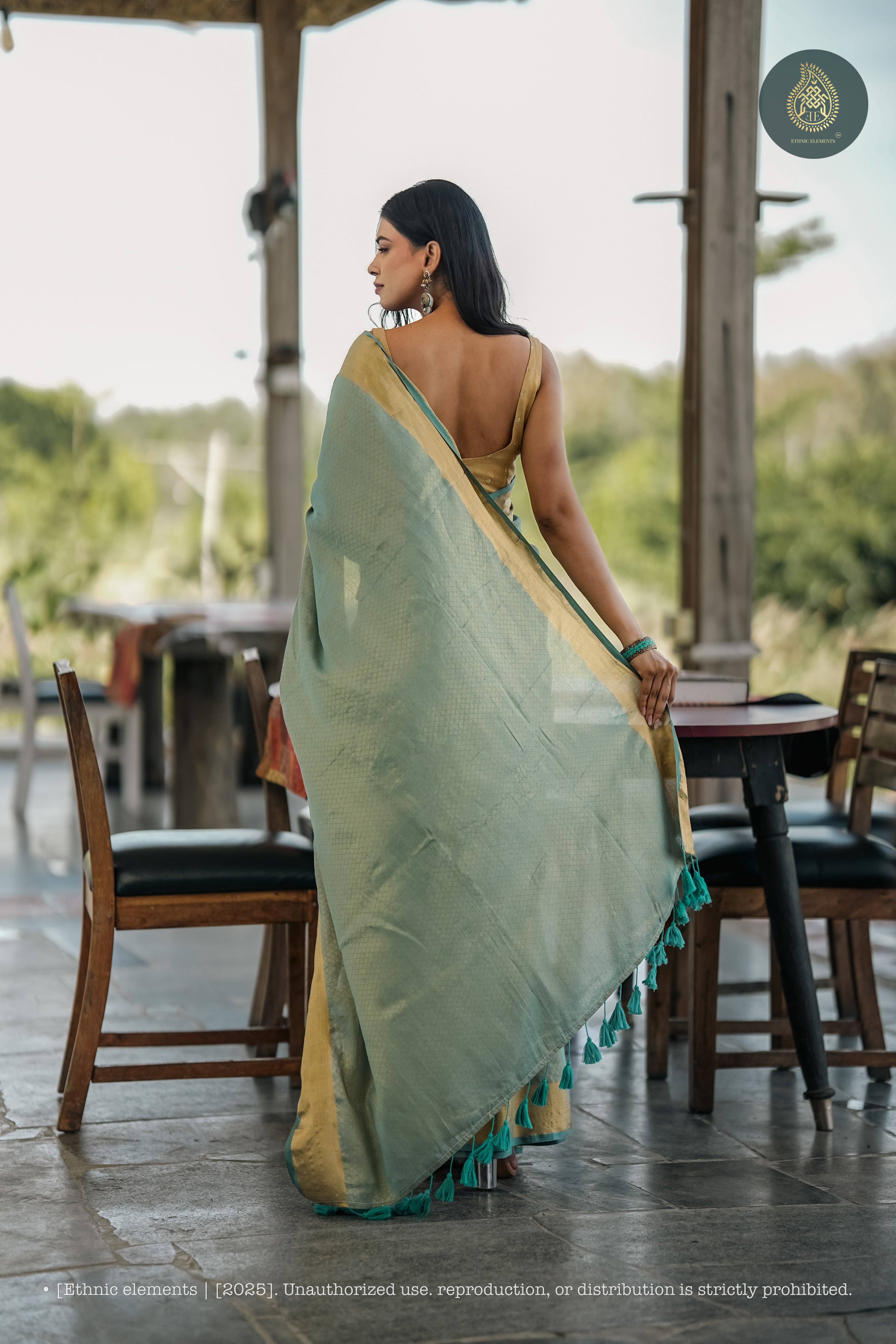 Crafted in fine mul cotton, this saree balances the airy softness of cotton with a structured finish. The zari jaal across the body adds quiet richness, while the golden border enhances its regal appeal. Hand-finished tassels complete the drape, bringing together tradition and craftsmanship in every detail.