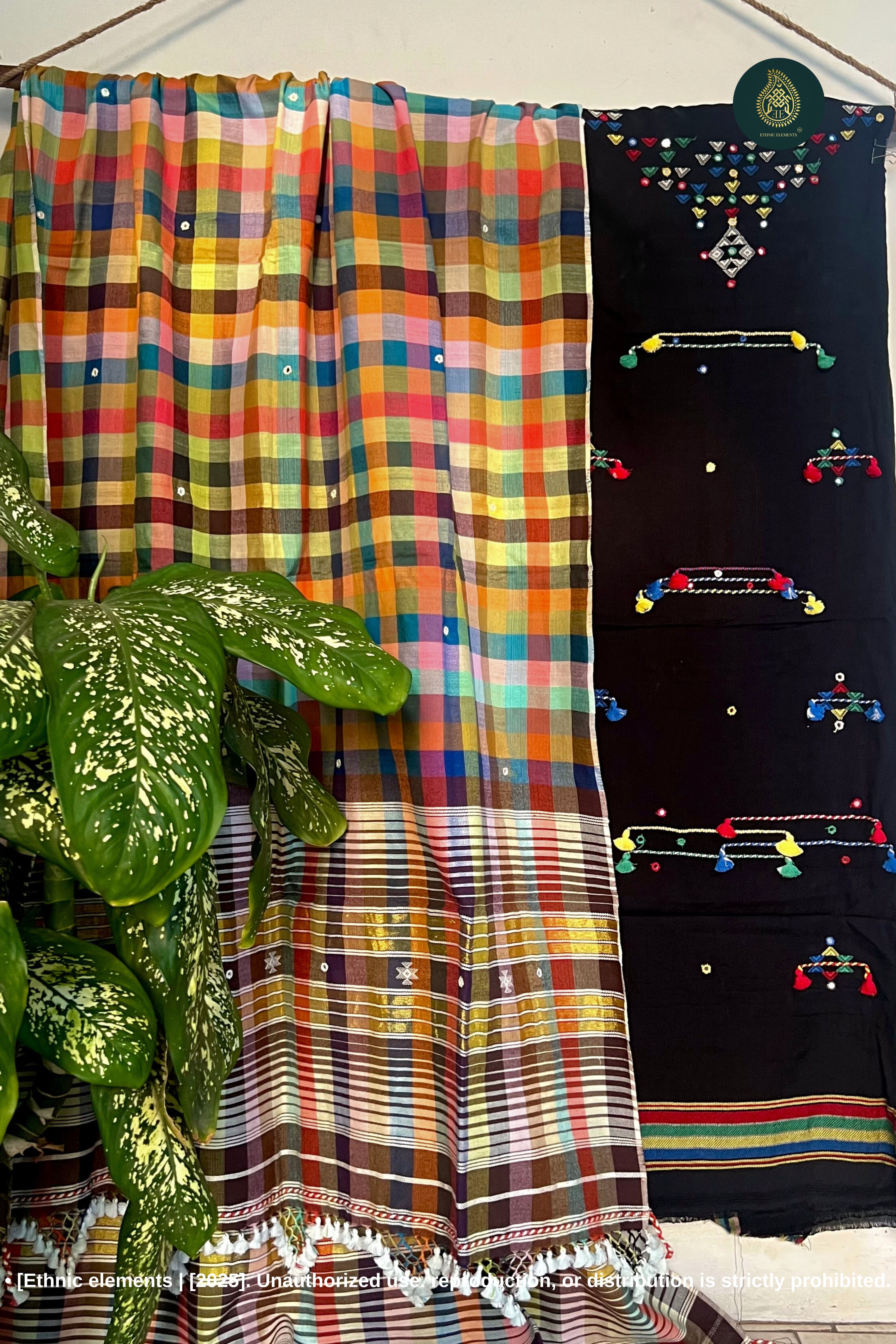 Original Woven Bhujodi Organic Kala Cotton Kurta, Dupatta and Bottoms Set. Handwoven TAANT embroidery on kurta fabric and dupatta. The bottoms are also kala cotton.