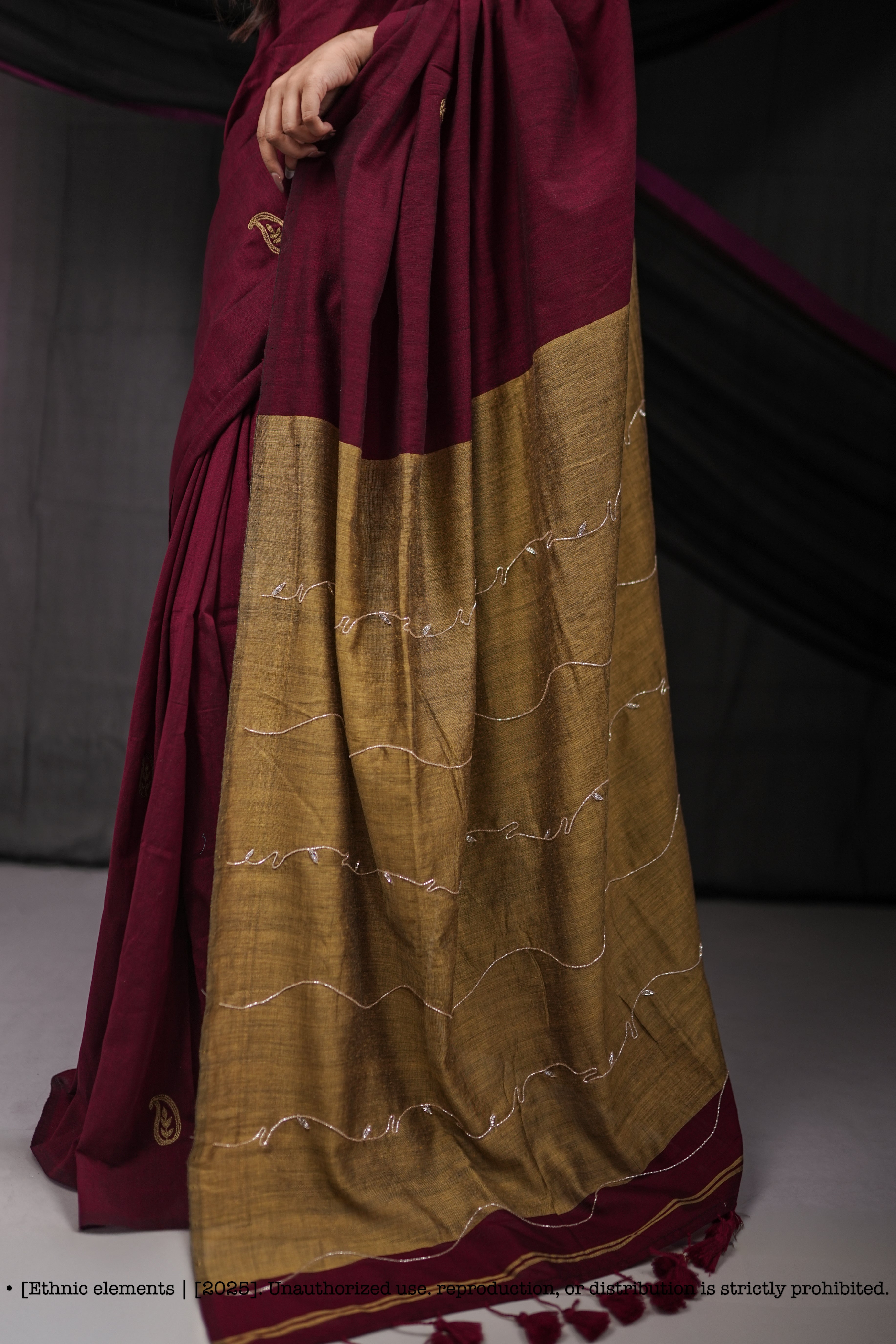 The pallu, in contrast magenta pink, is adorned with free-flowing lines of fine sequin hand embroidery—adding movement, shimmer, and a festive sparkle to the otherwise earthy palette. Finishing touches like tasselled edges complete the look with playful elegance.
