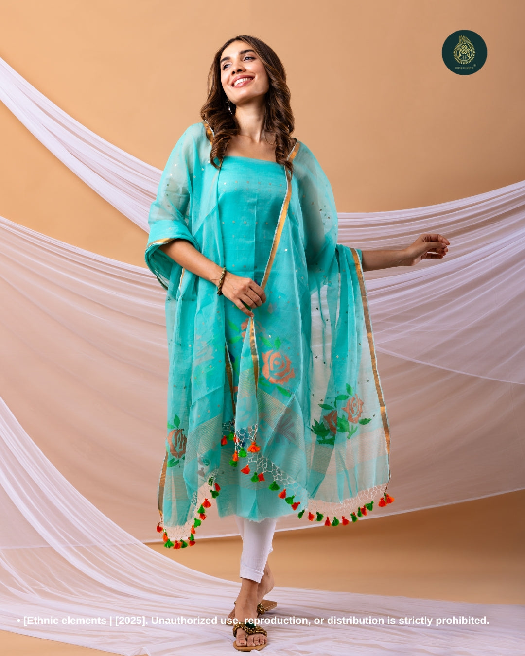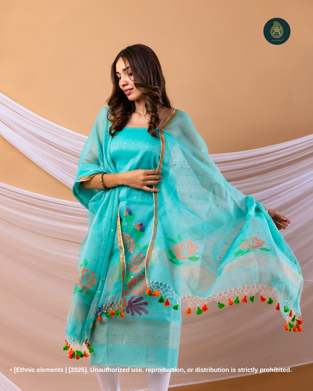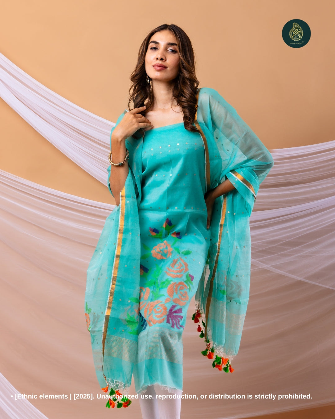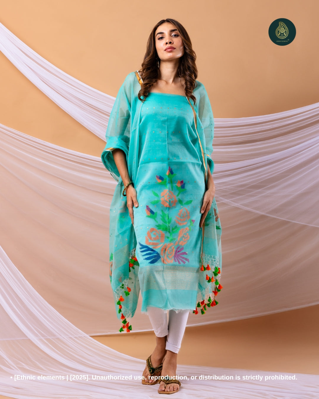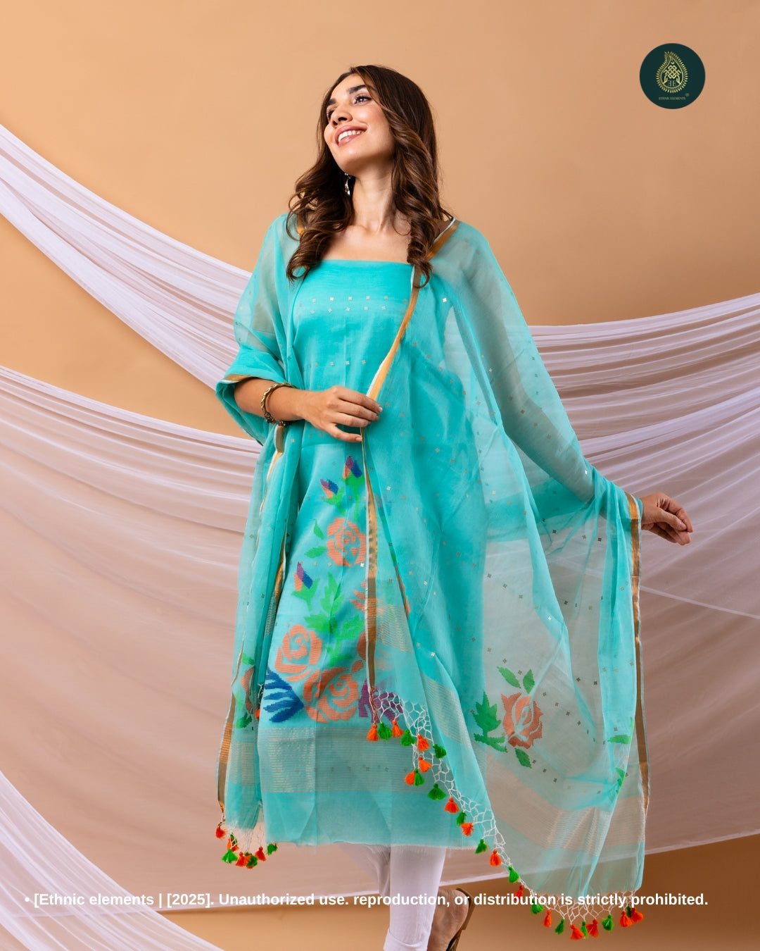 Resham Muslin Jamdani Suit Set with Handwoven Sequins and Handmade Tassels