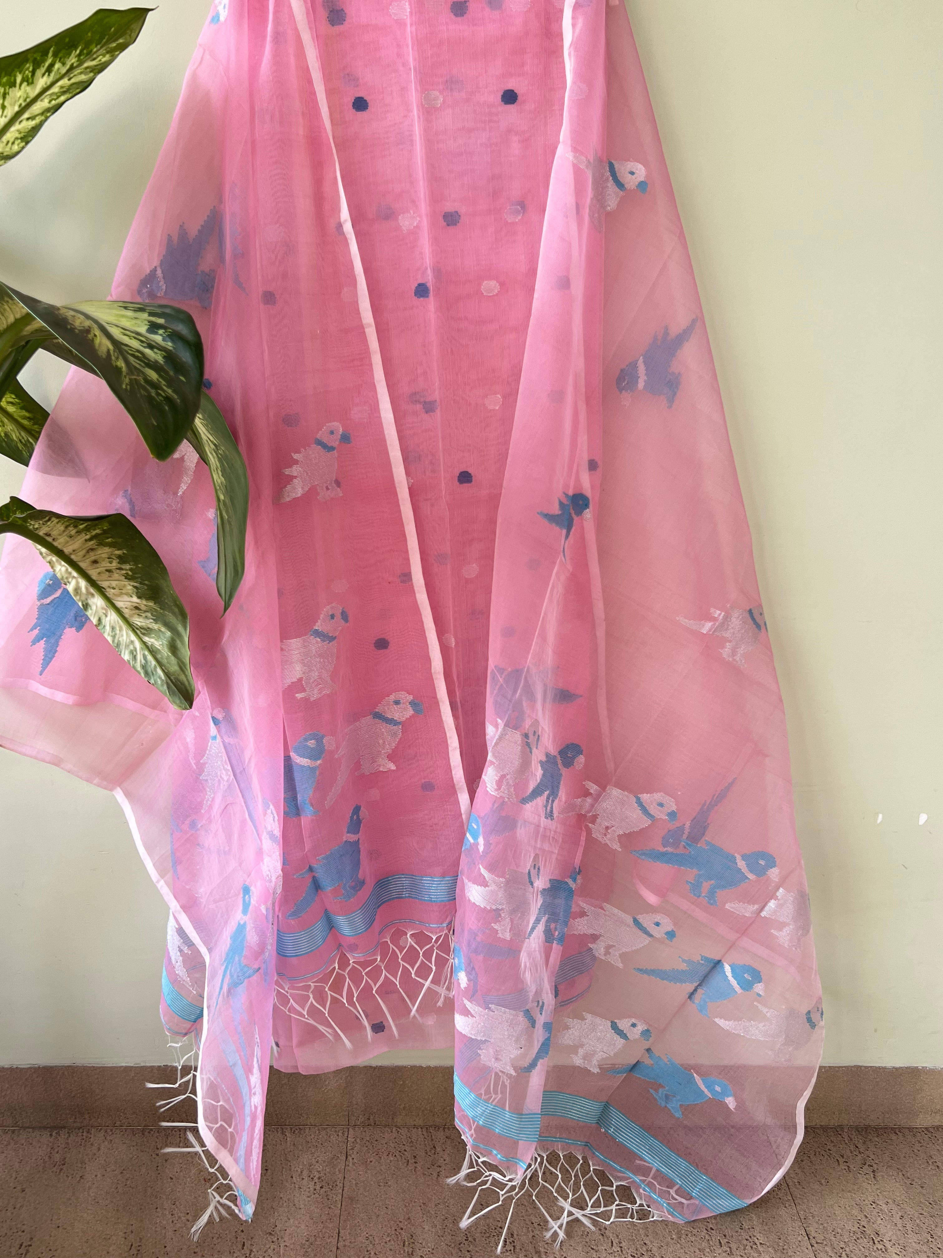 Muslin Jamdani Suit Set- Baby Pink With Blue Bird